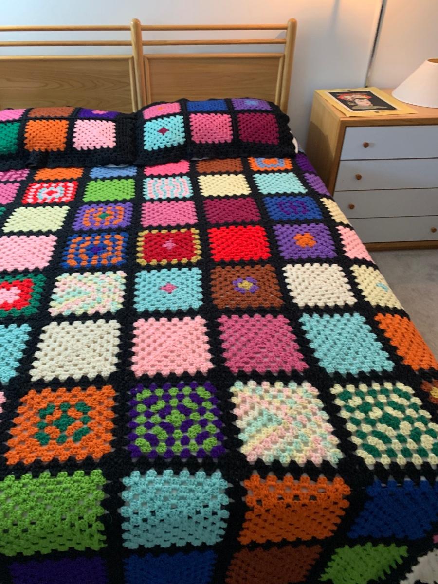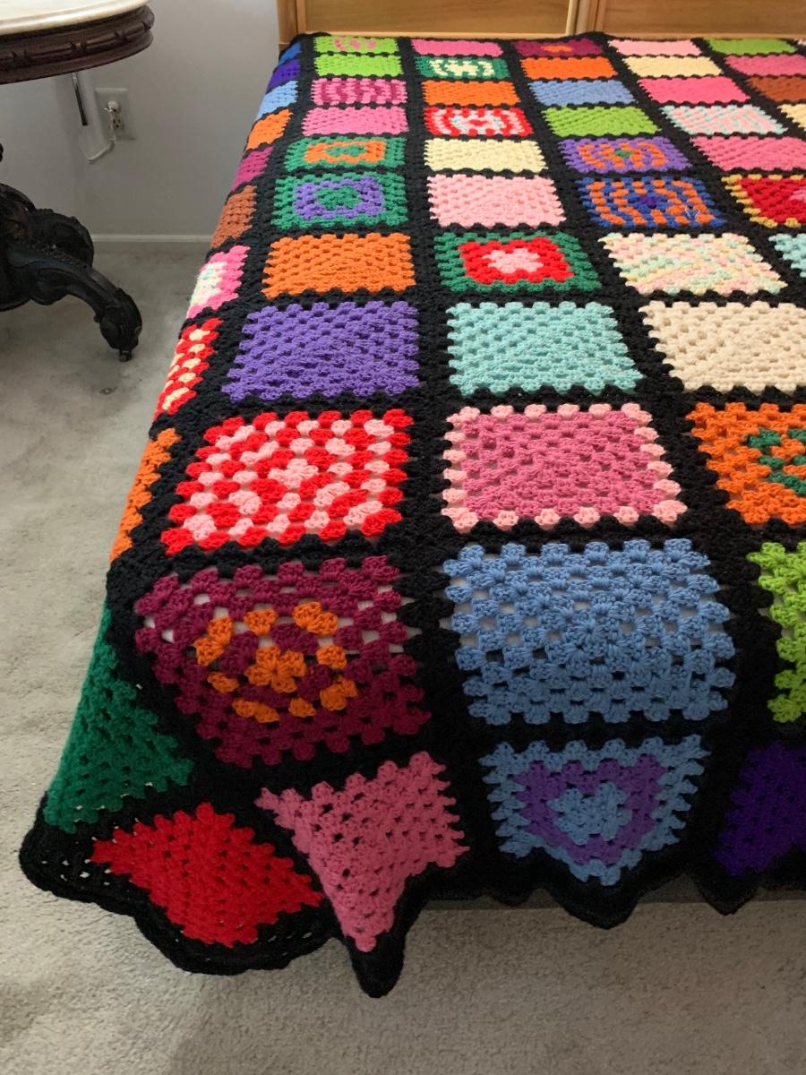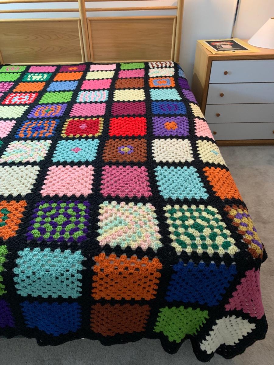 Pictures are taken on a queen size bed. This is a soft, snuggly handmade afghan.