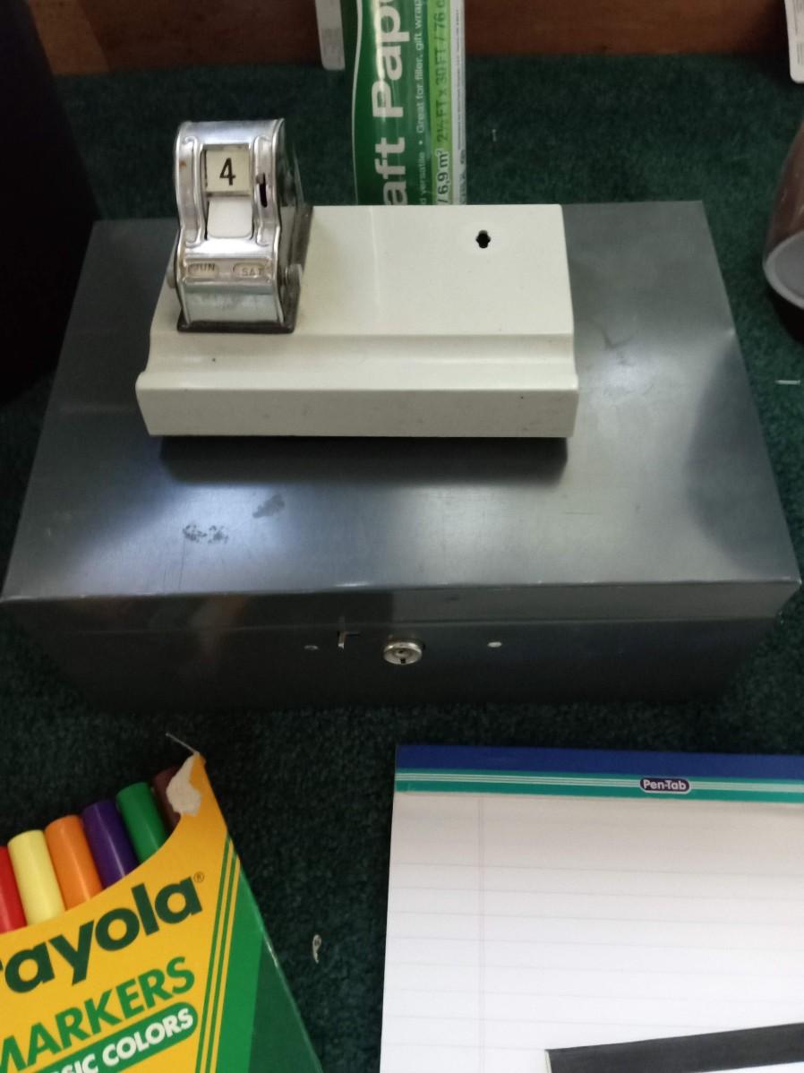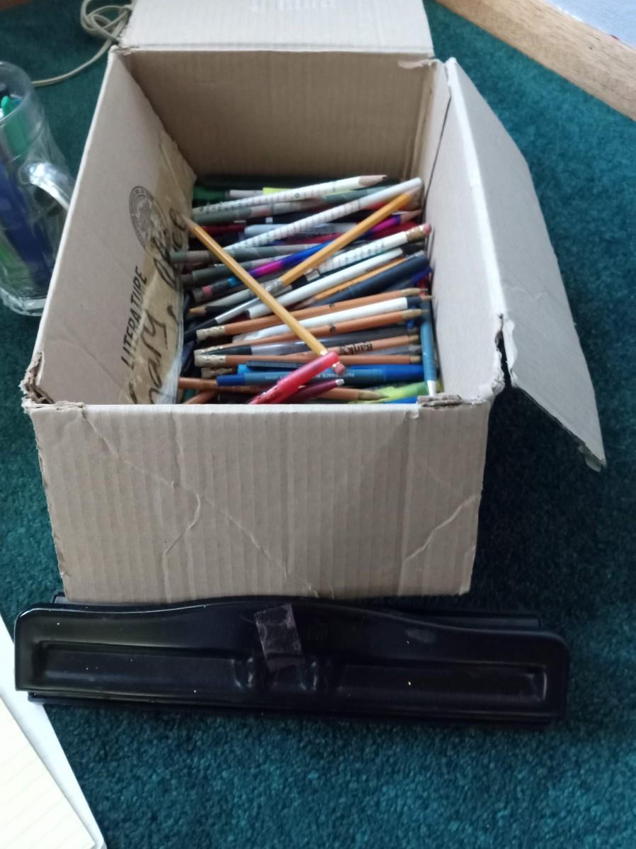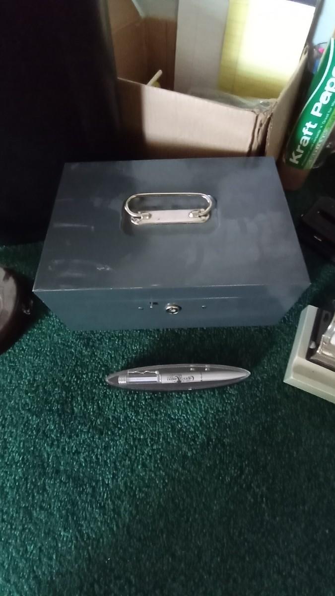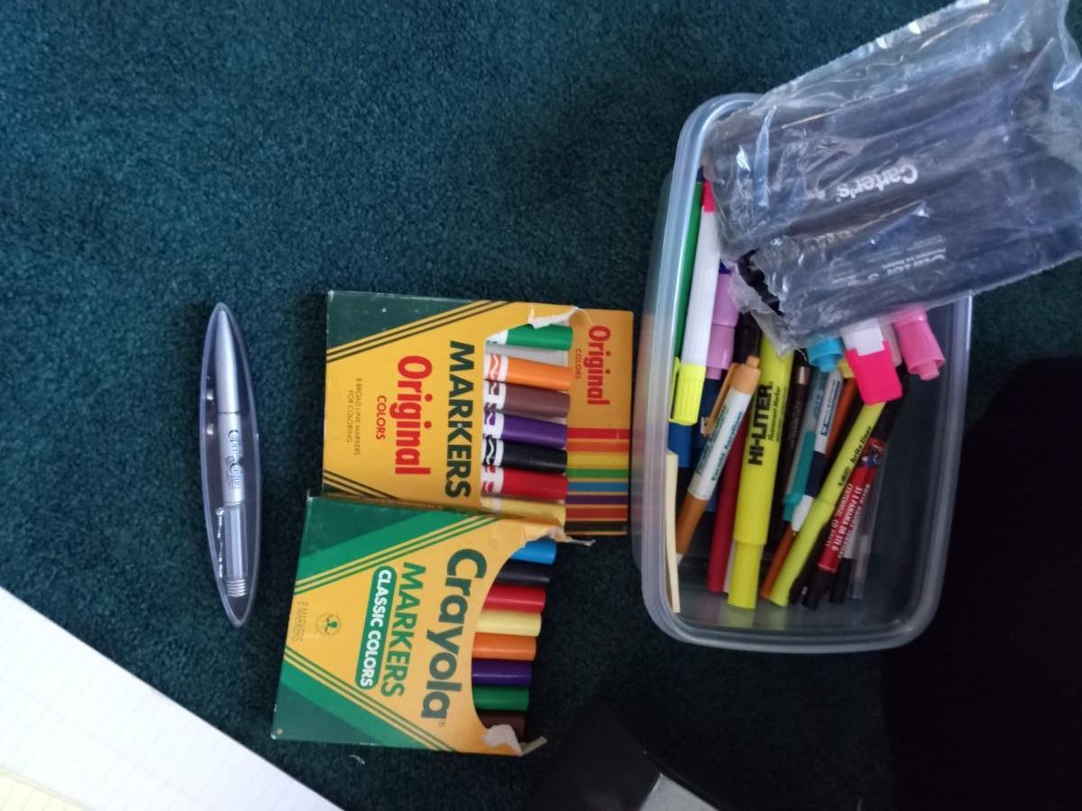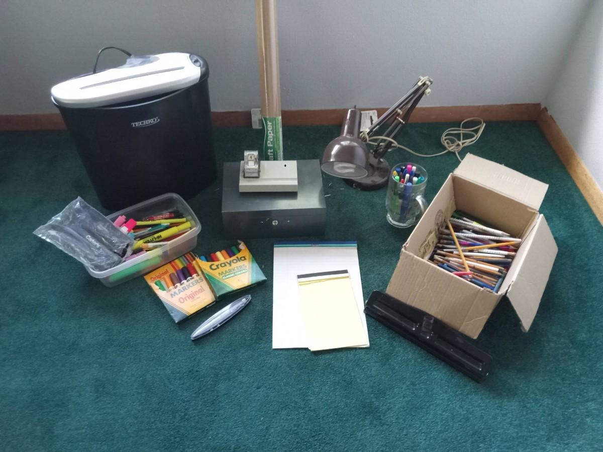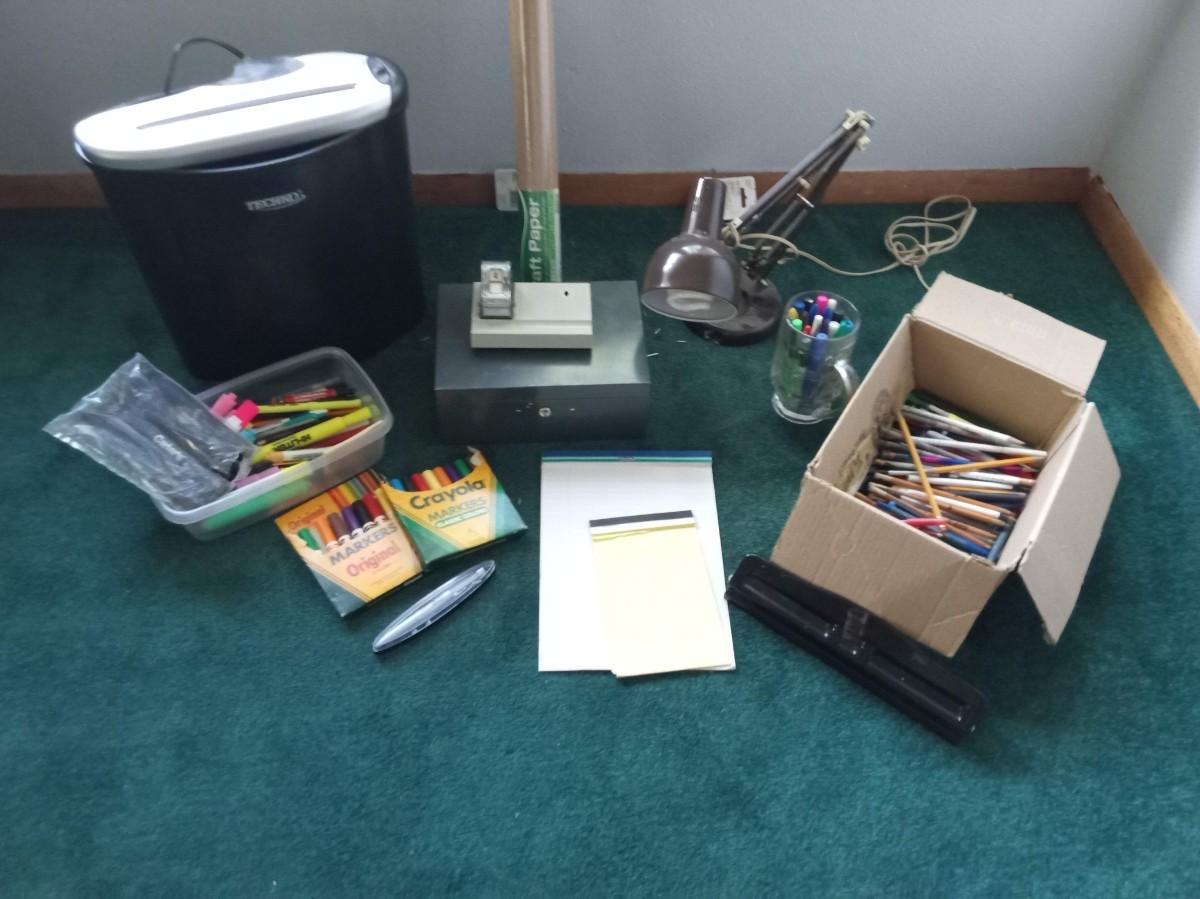 PAPER SHREDDER, CASH BOX, PENS AND MARKERS, ADJUSTABLE LAMP, 3 HOLE PUNCH AND MORE