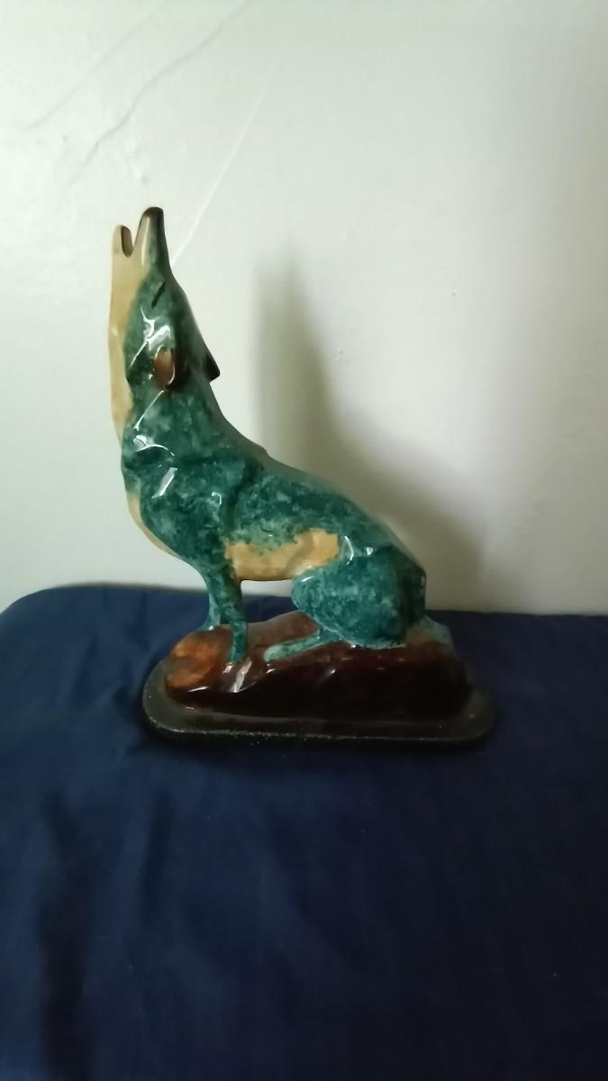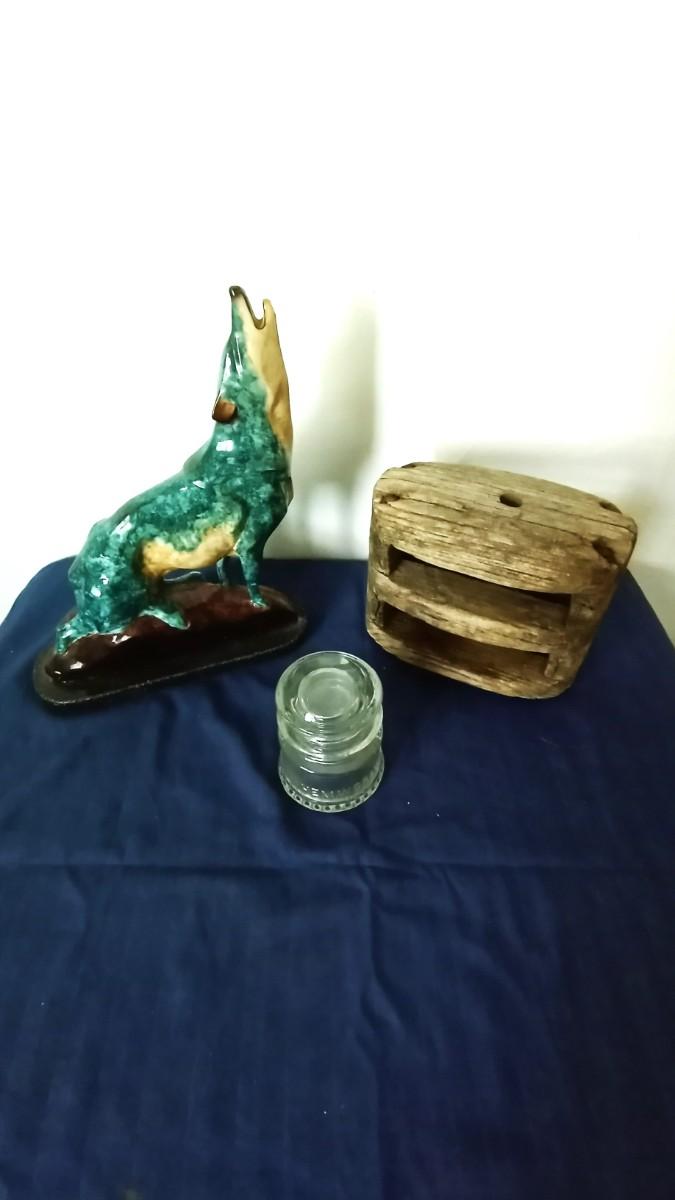 LOT 368  ANTIQUE WOODEN PULLEY, INSULATOR AND A COYOTE