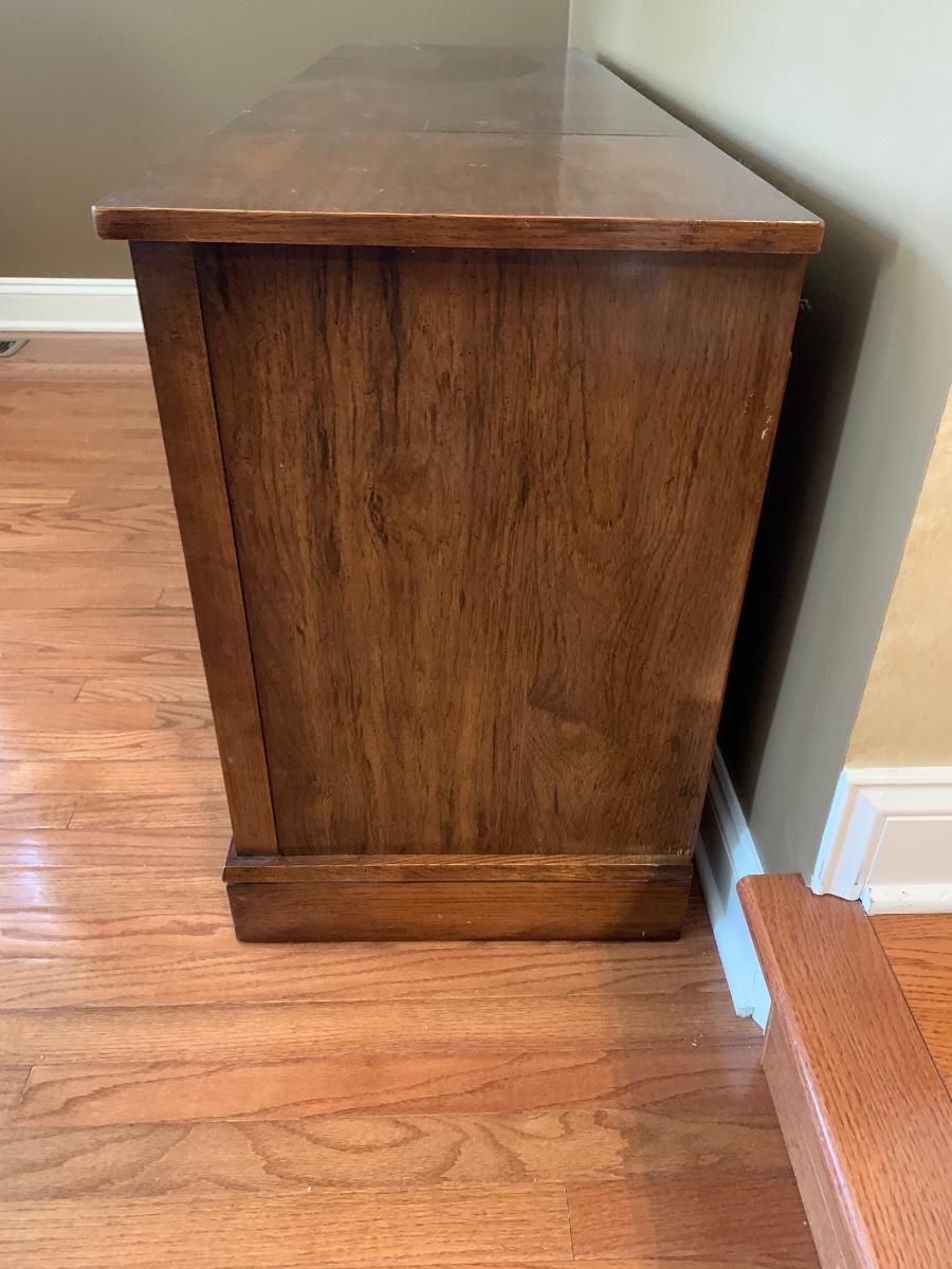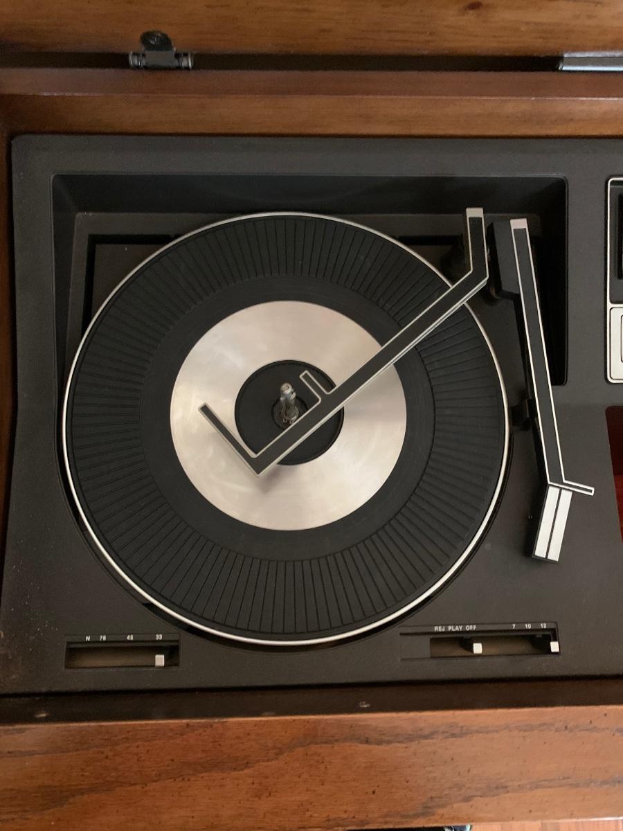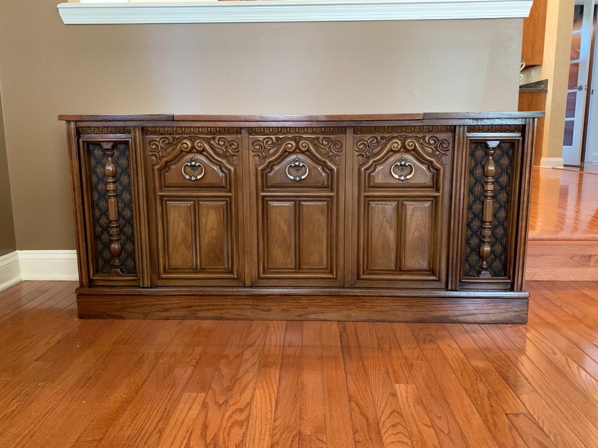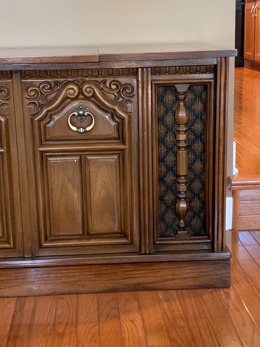 How cool is this a Vintage RCA console with 8-track player, turn table and AM-FM radio. Per our client this a working system, turn-table & 8-track were not tested however the radio does work and sounded great.