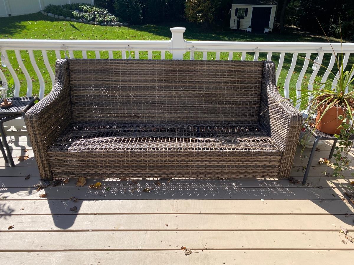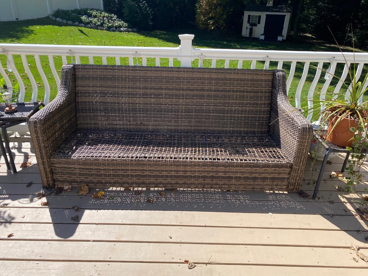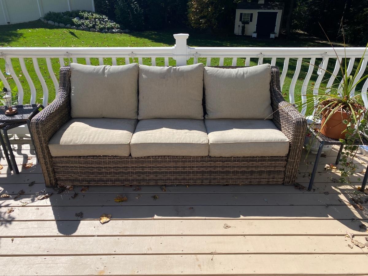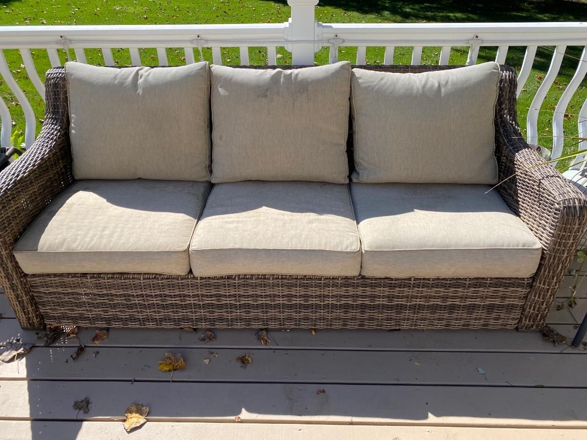 Outdoor couch is in used condition. Couch and cushions show sun damage. Please see all pictures as they are the best representation of the items. The pictures show condition, measurements if taken, and what is included in the lot. Due to the large amount that we photograph and the time frame, we are not always able to take measurements. All items unless noted, are pre-owned and have been used. If you purchased furniture, you must bring help. We do not allow one person to carry large furniture out on their own. Bring help, tools and a truck for the safety of our client’s homes, and your personal safety. Any damages that result to the property including walls, and floors due to moving of the furniture will be charged to the buyer. Company policy. Thank you.