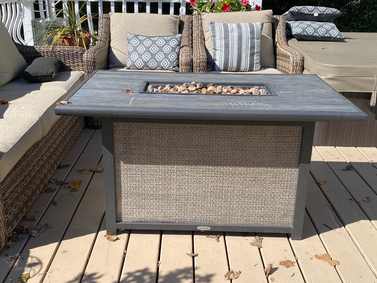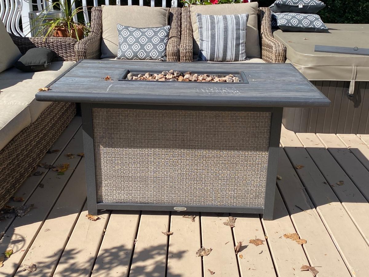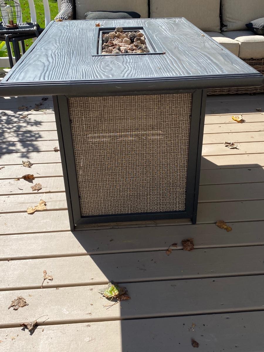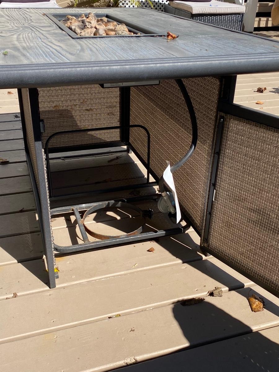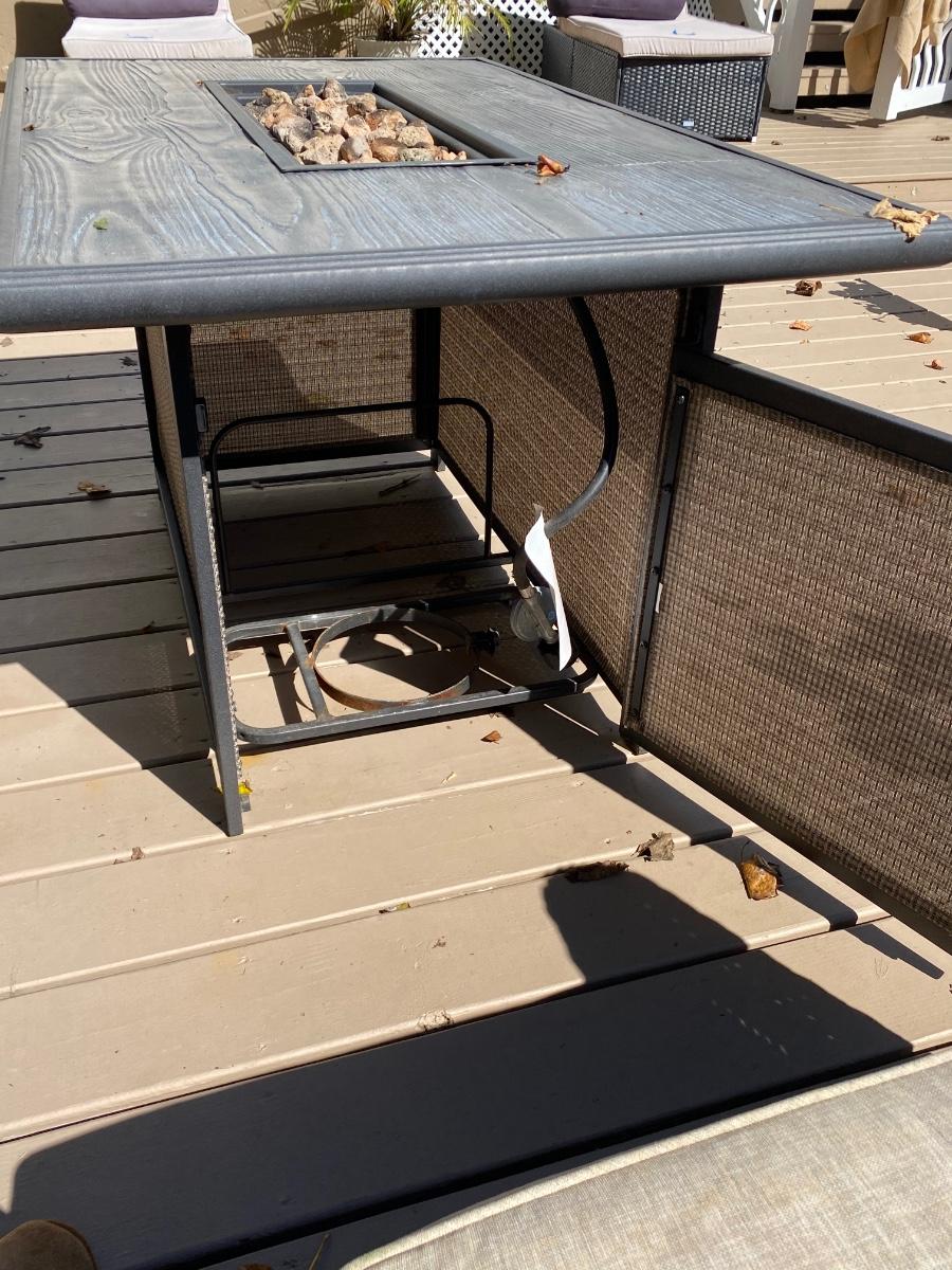 Fireplace has propane hook up under table. Table shows fading in color due to sun. Untested