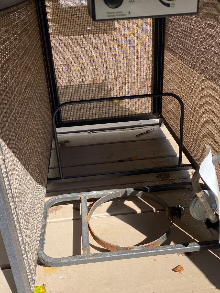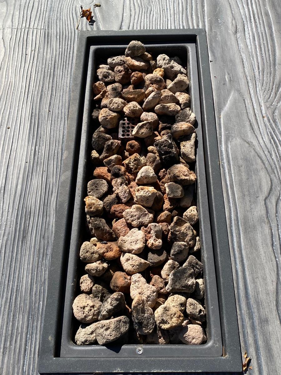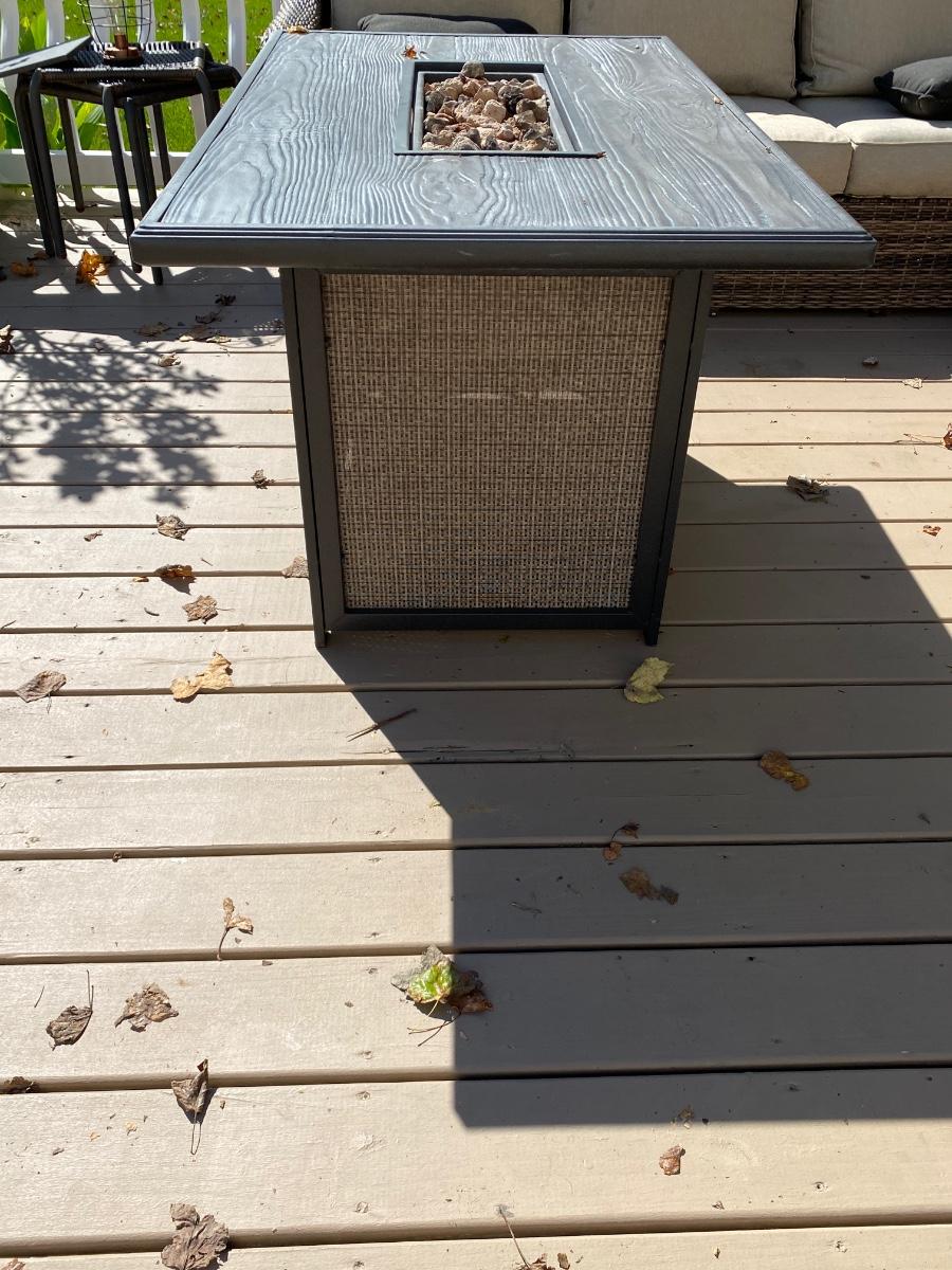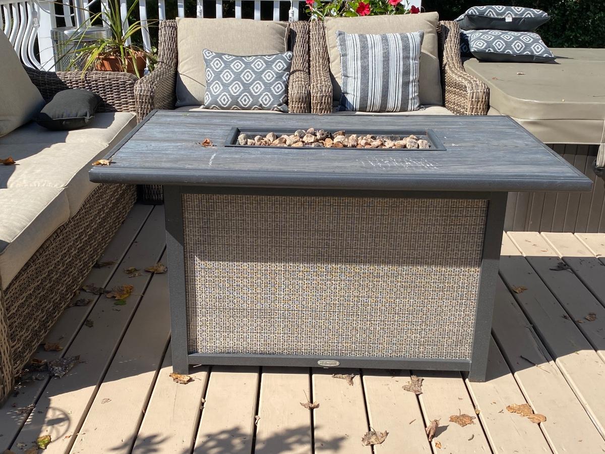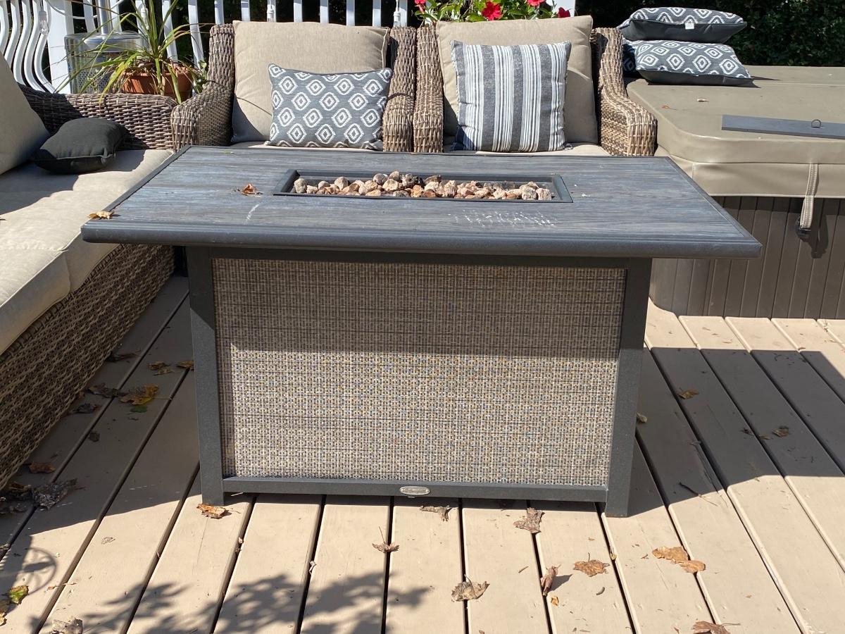Fireplace has propane hook up under table. Table shows fading in color due to sun. Untested