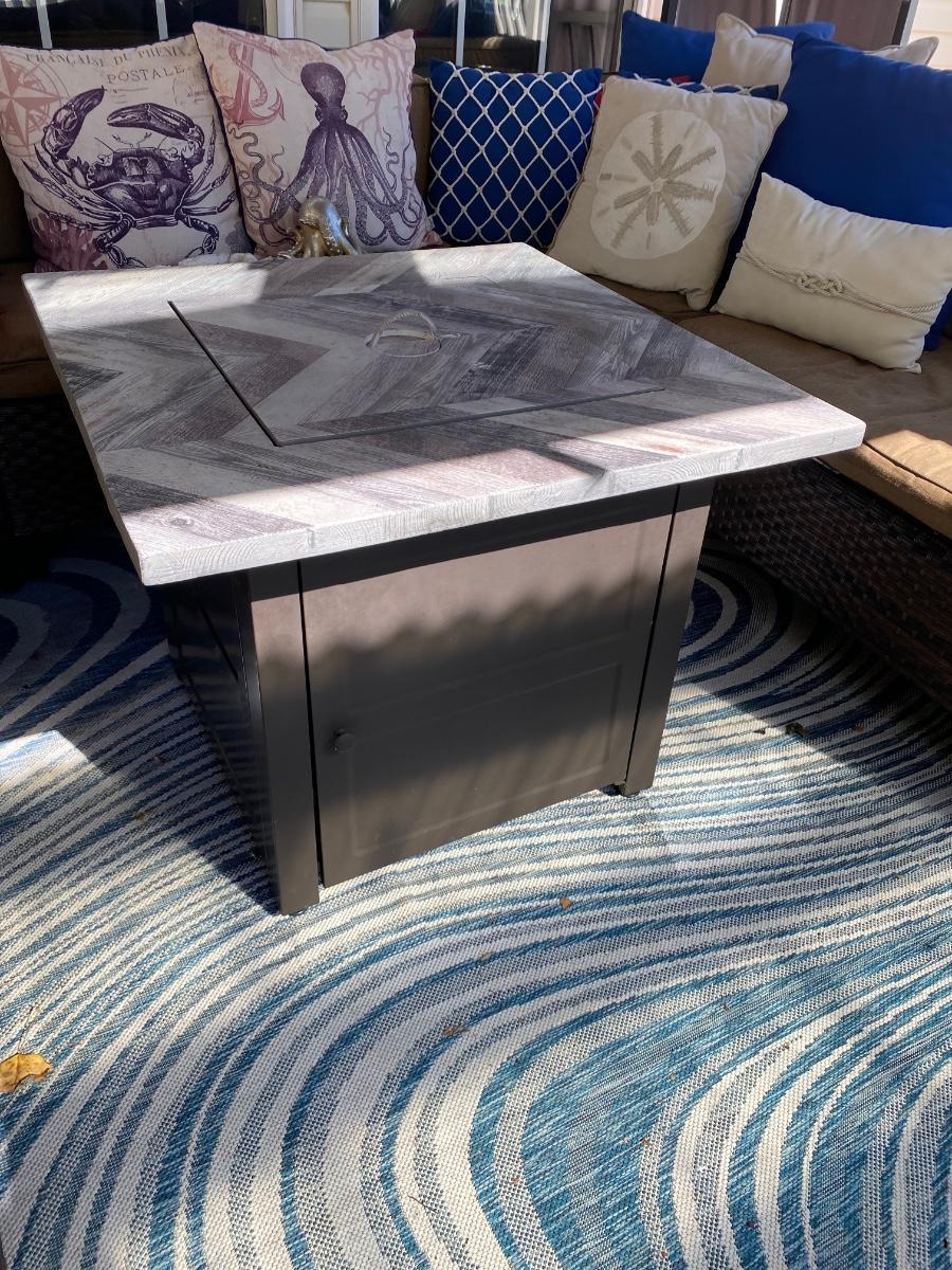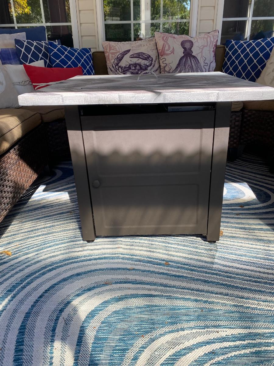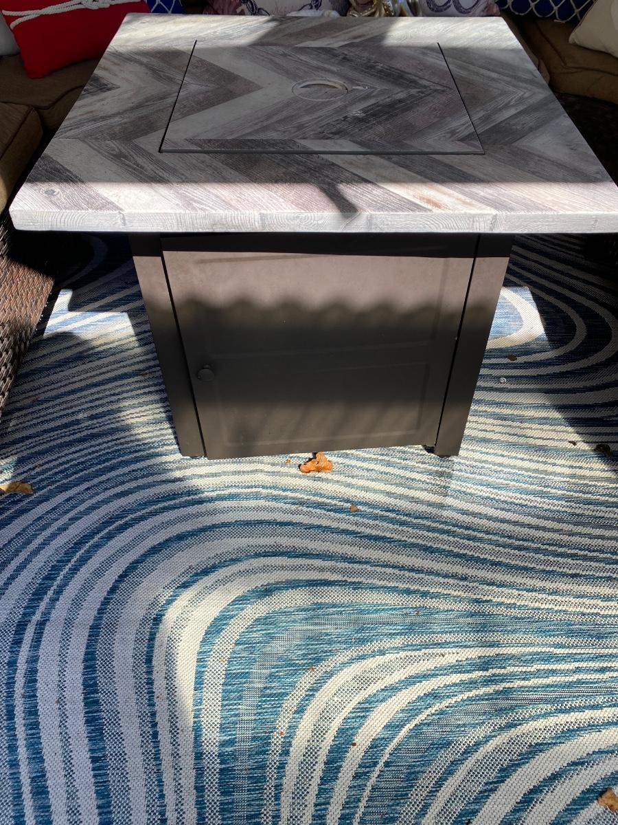 Fireplace has propane hook up. Lid cover, metal frame and Ice looking stones in fireplace. Untested