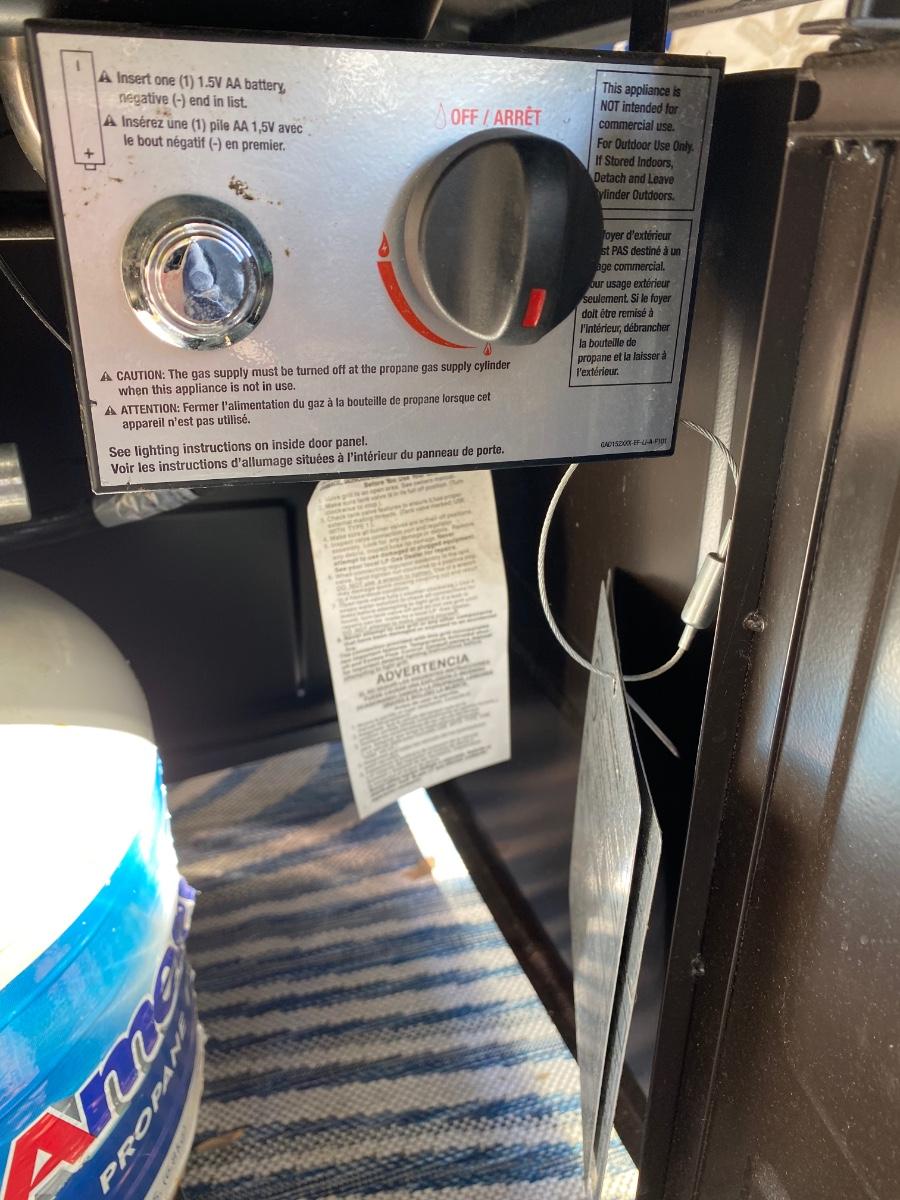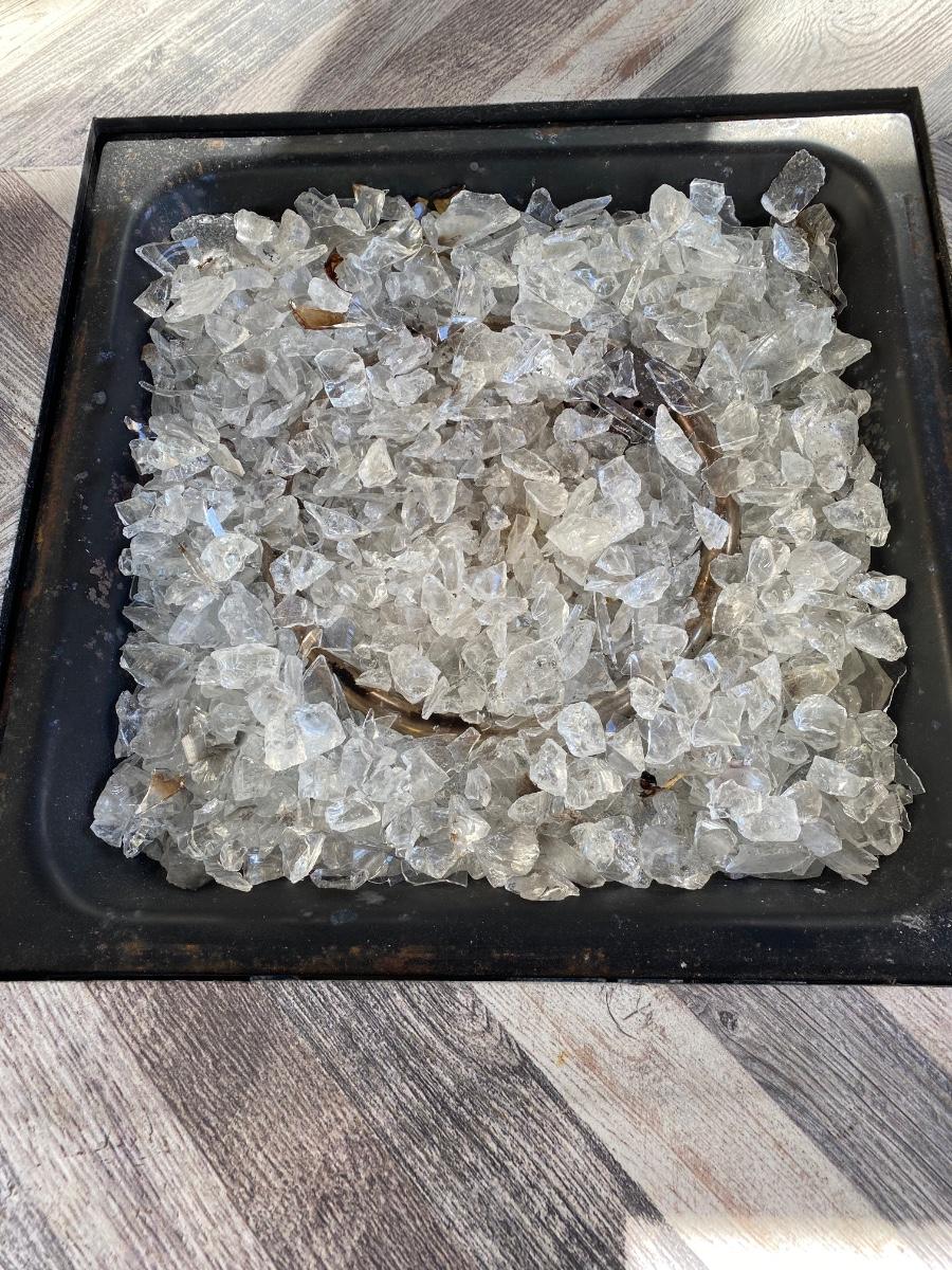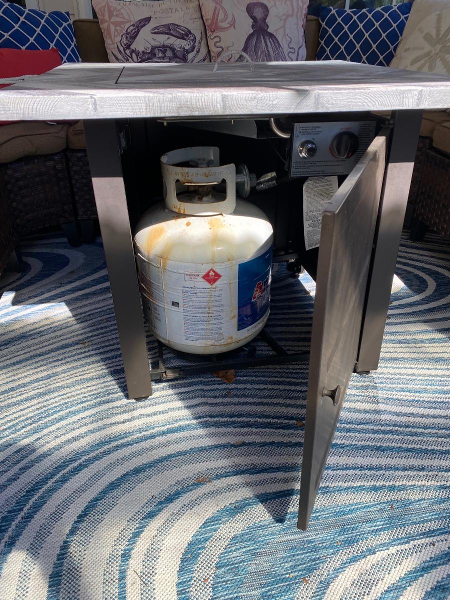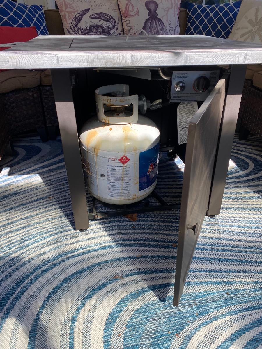 Fireplace has propane hook up. Lid cover, metal frame and Ice looking stones in fireplace. Untested