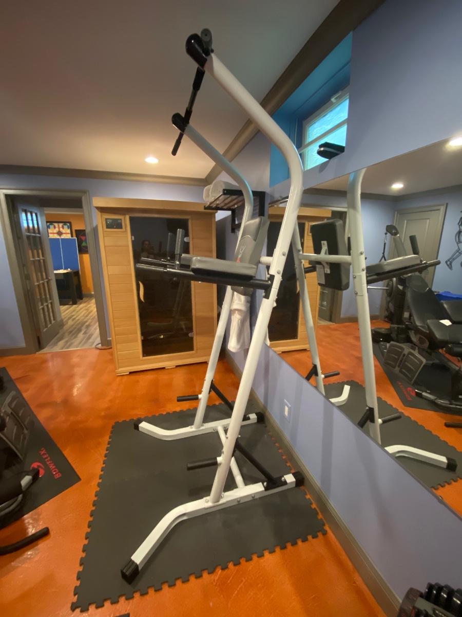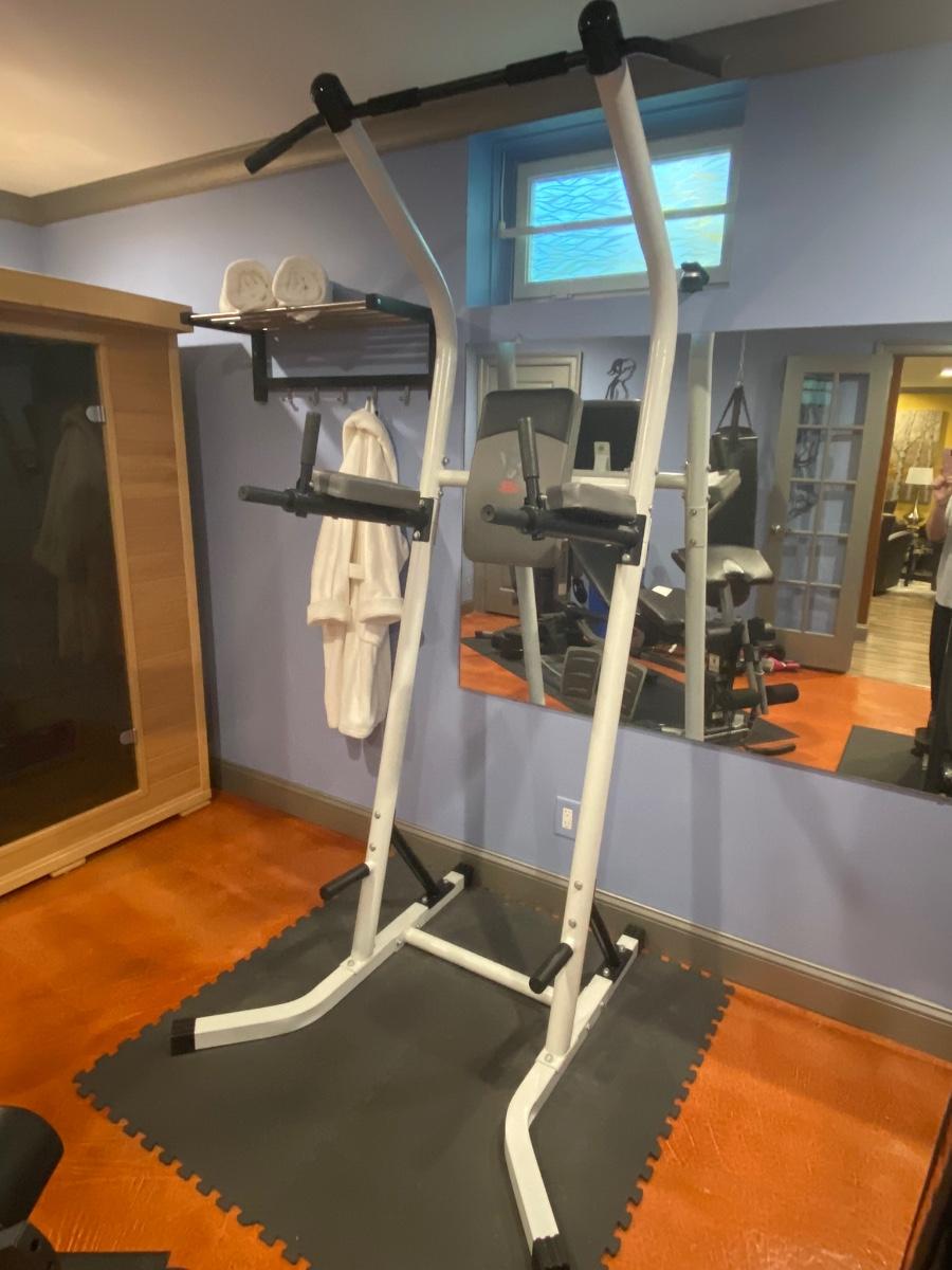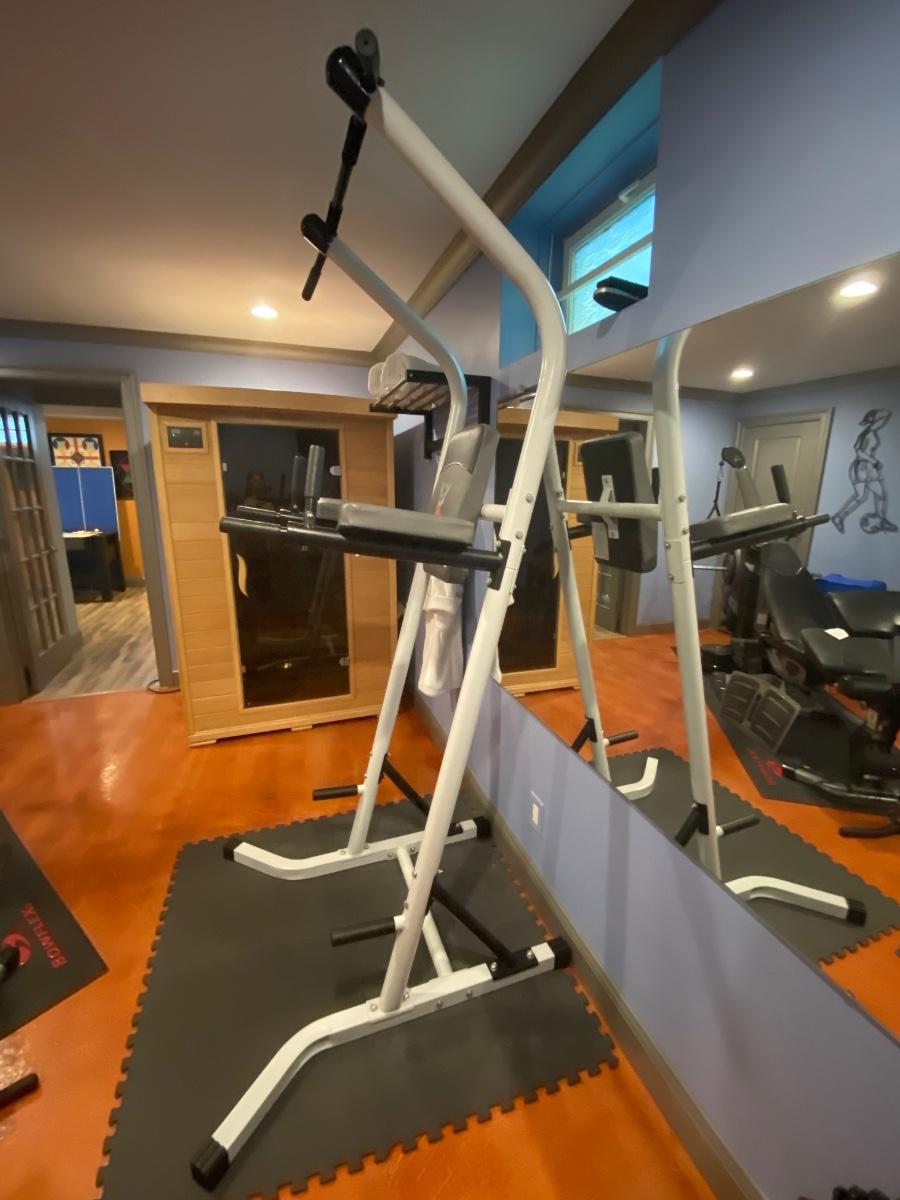 Over 7 feet tall strength training frame for both upper and lower body pull ups. Padded on back, arms and handles.