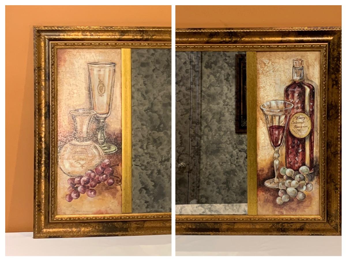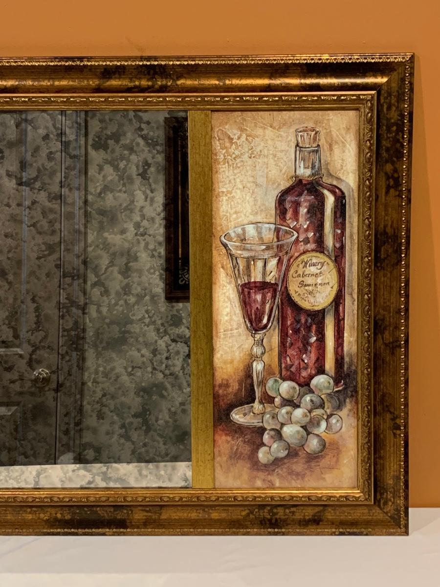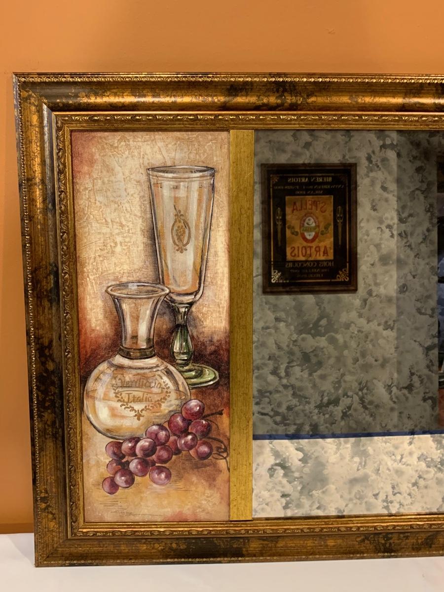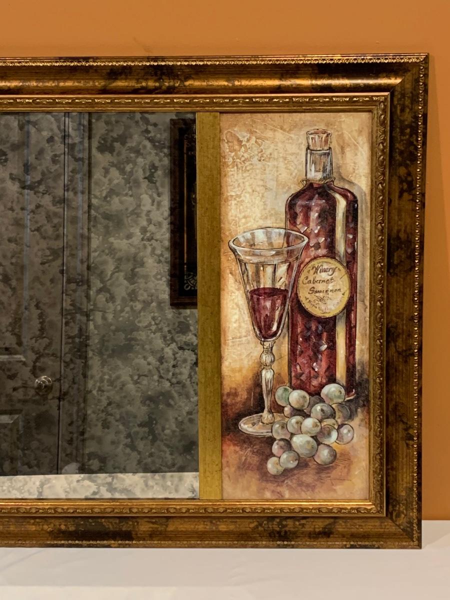 LOT 80R: Framed Wall Art/Mirror Featuring Wine Themed Images & Faux Distressed Mercury Glass Mirror in the Middle