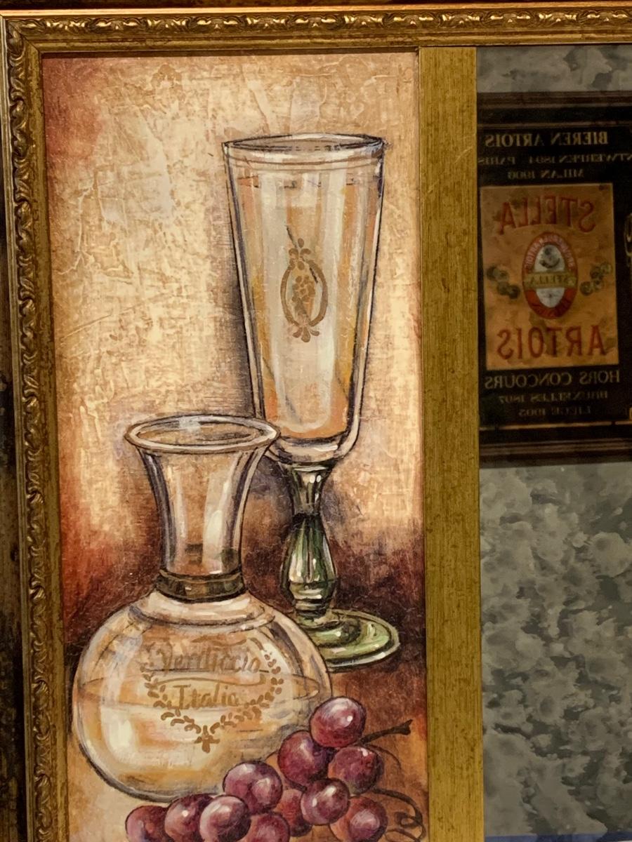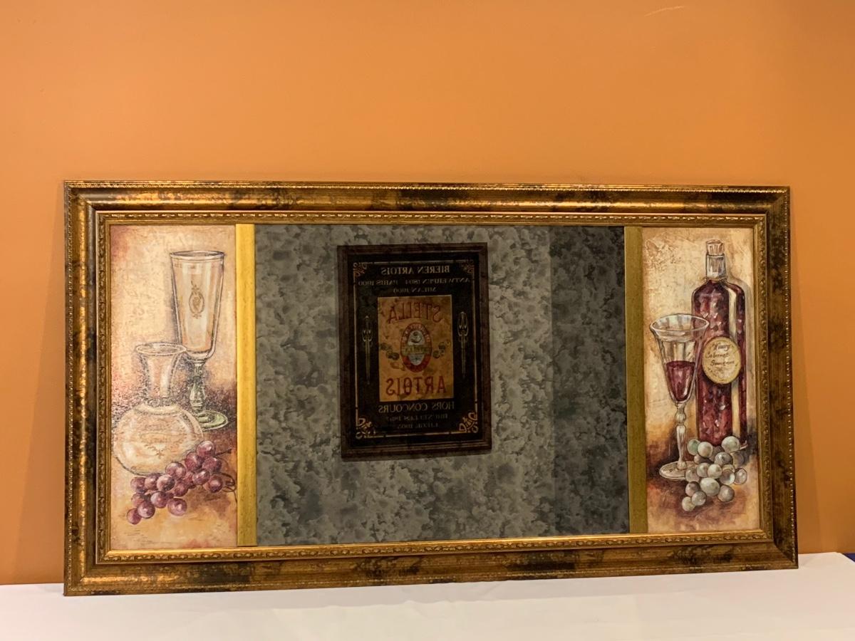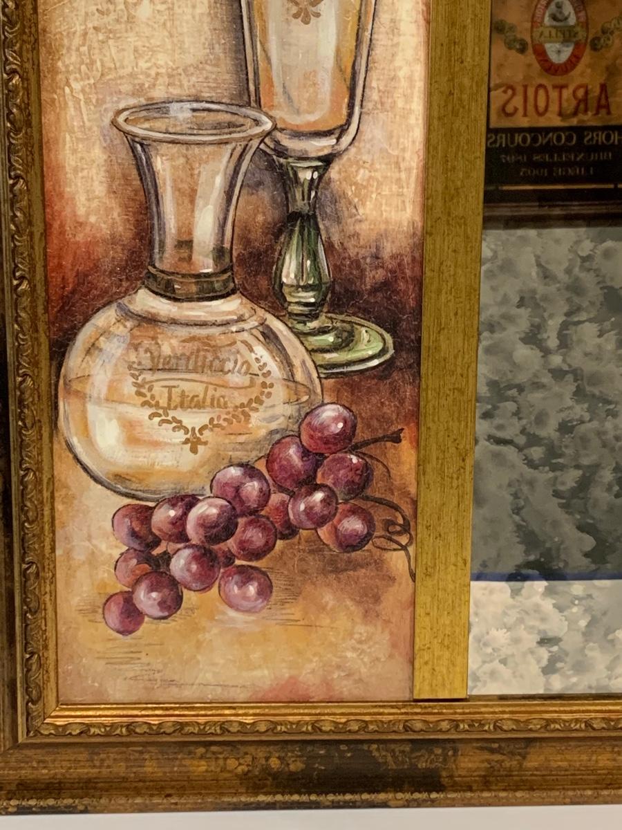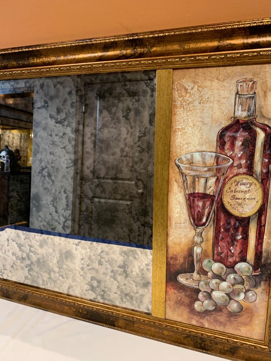 LOT 80R: Framed Wall Art/Mirror Featuring Wine Themed Images & Faux Distressed Mercury Glass Mirror in the Middle