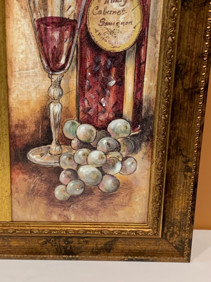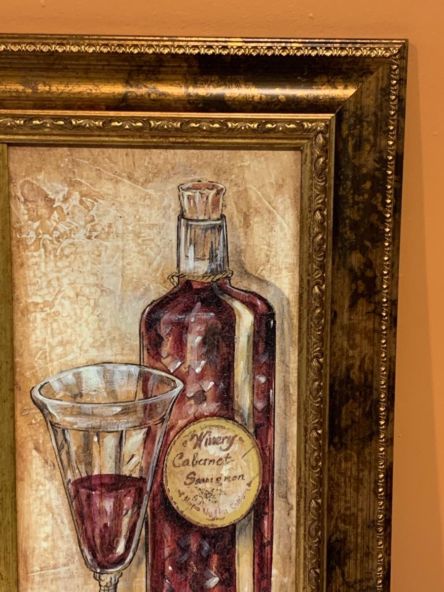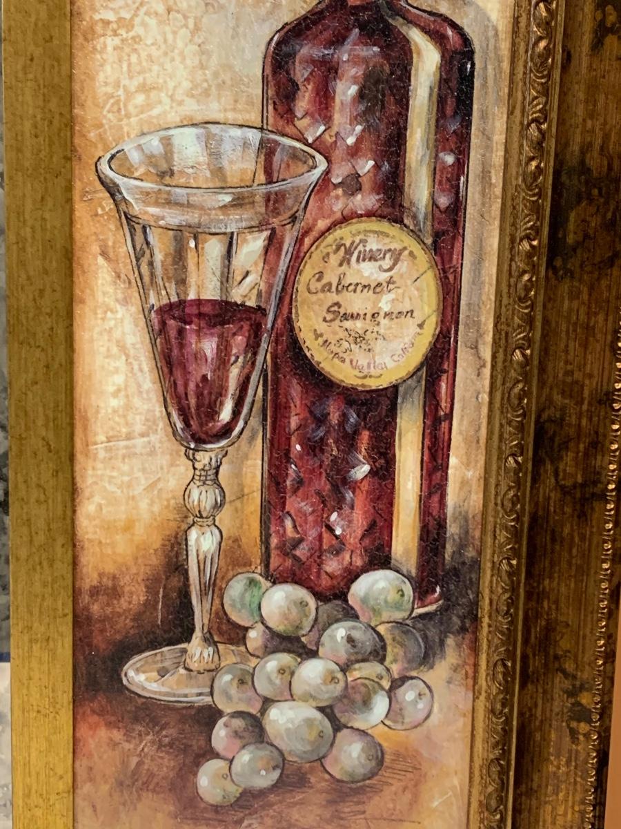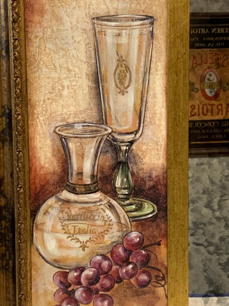 LOT 80R: Framed Wall Art/Mirror Featuring Wine Themed Images & Faux Distressed Mercury Glass Mirror in the Middle