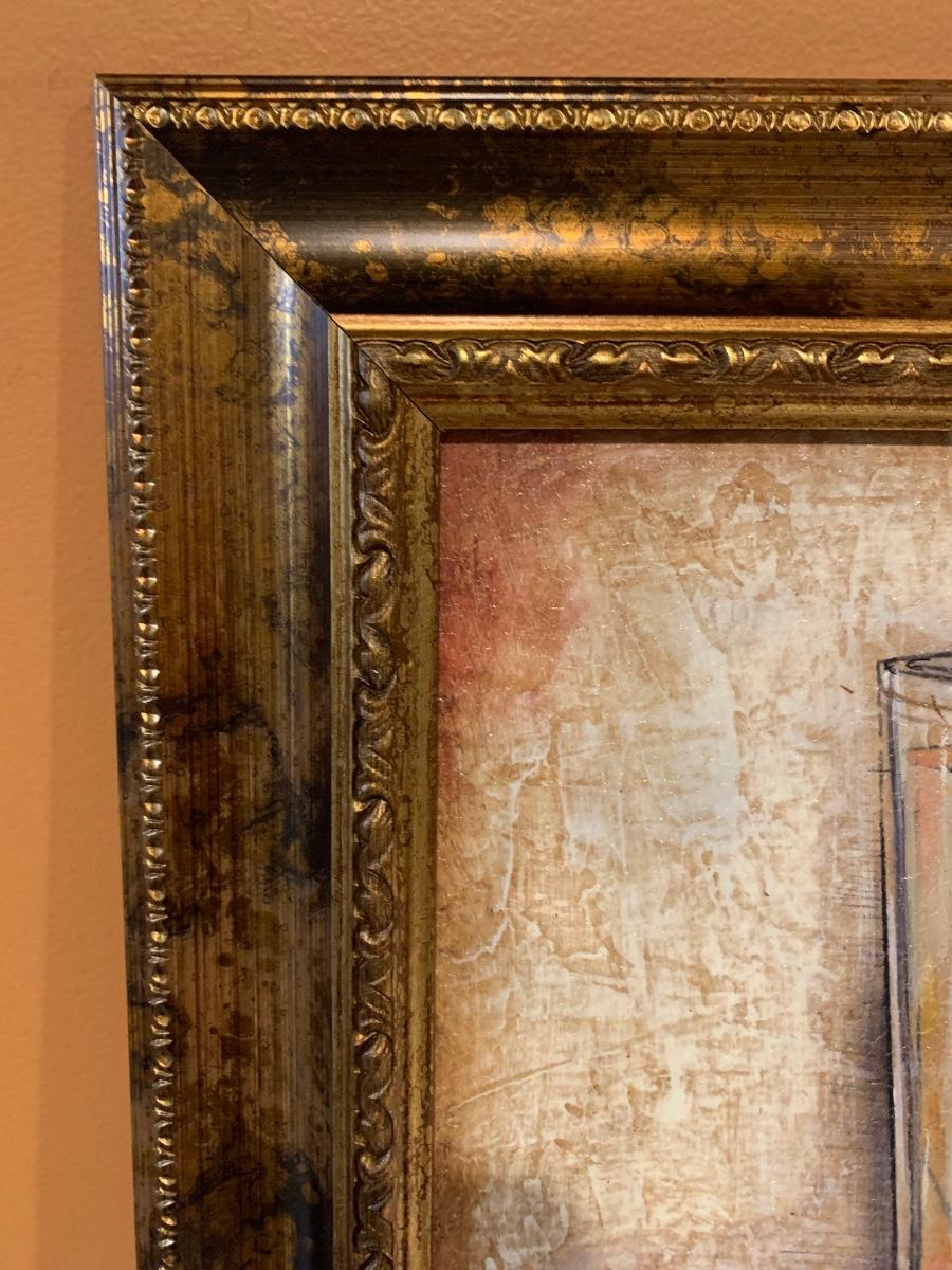 The pictures are a bit deceiving - this is actually a mirror with images on the ends. The image you see in the middle (black) is actually a reflection and not included. The mirror is made to look similar to mercury glass. Large piece of "wall art" measuring 46 x 26.
