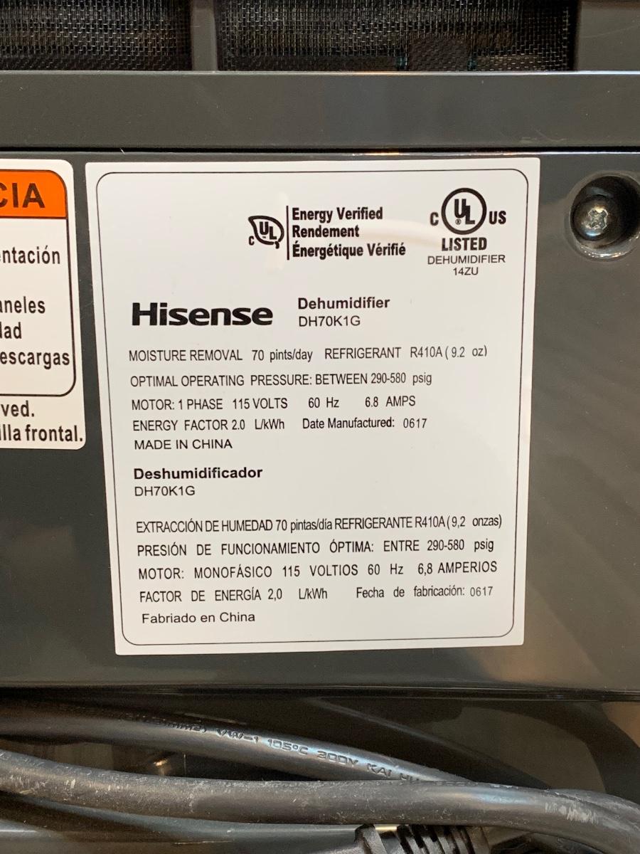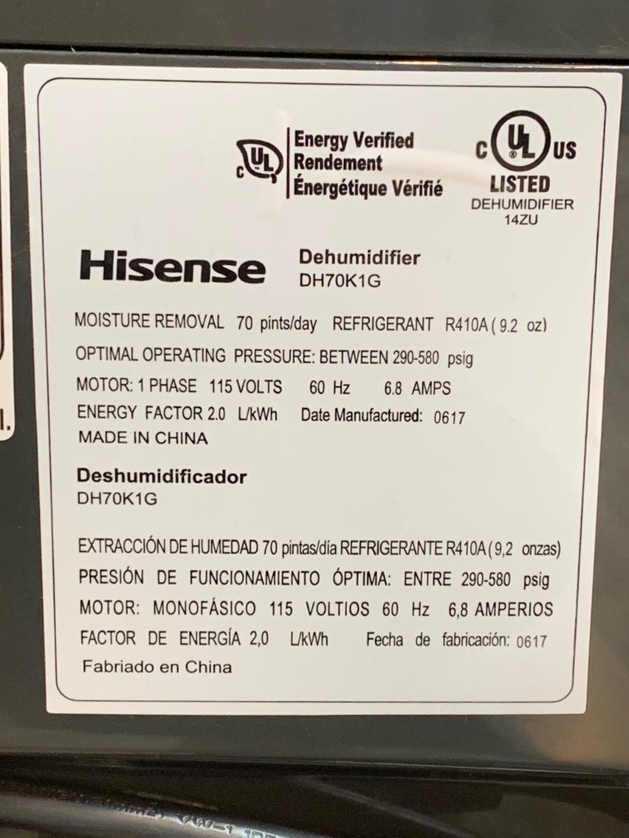 LOT 140R: Hisense Dehumidifier Model DH70K1G