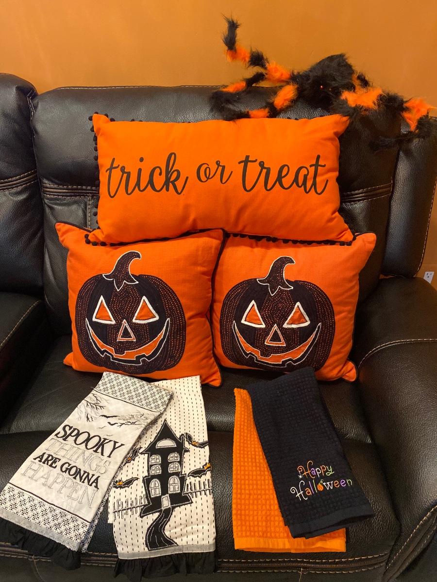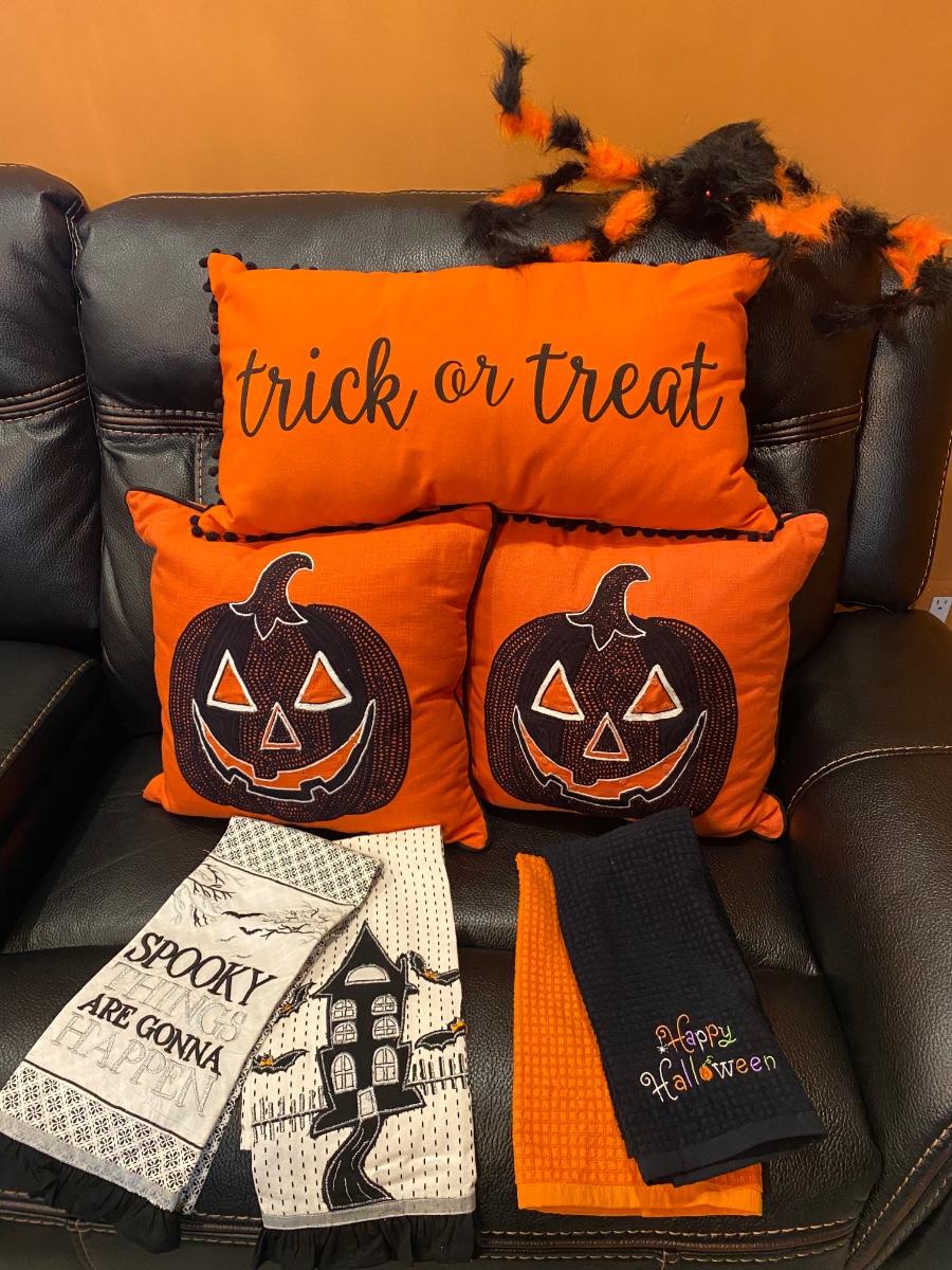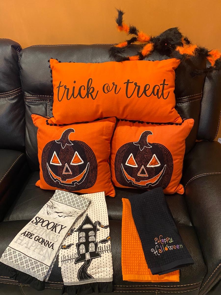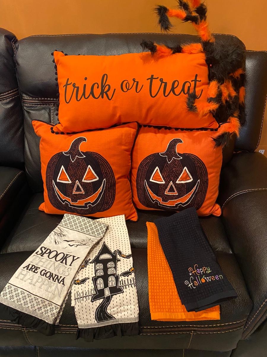 Two Pier One light up Pillows, Long trick or treat pillow and two sets of kitchen towels.