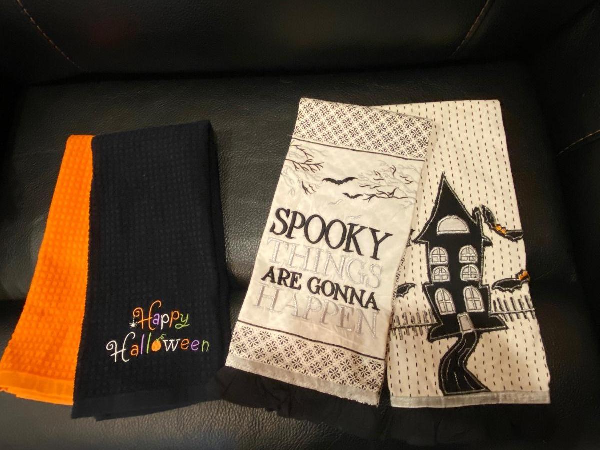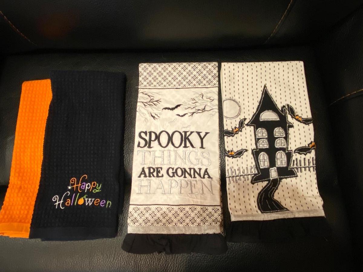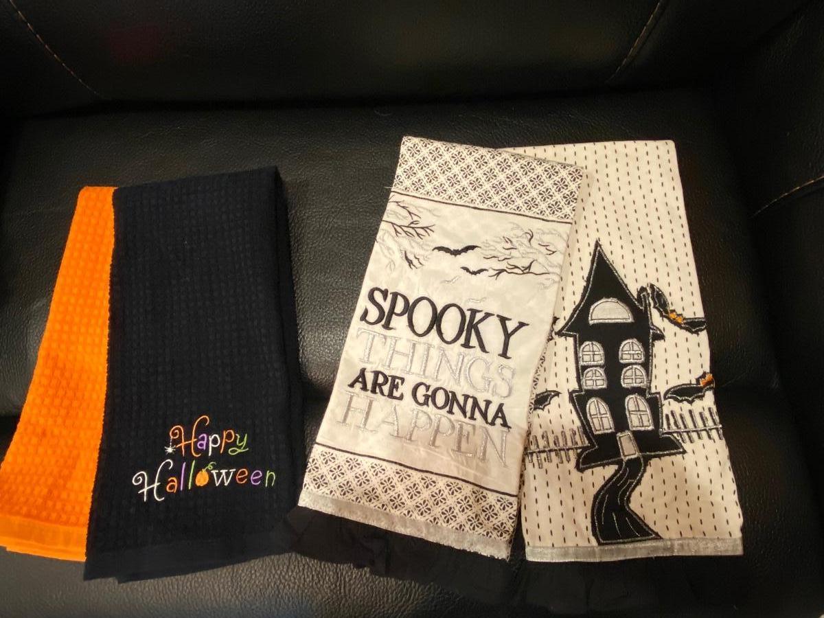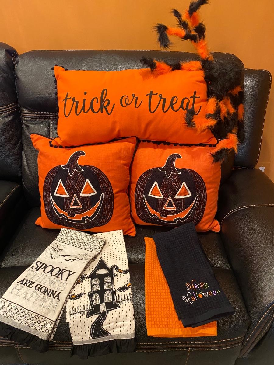 Two Pier One light up Pillows, Long trick or treat pillow and two sets of kitchen towels.