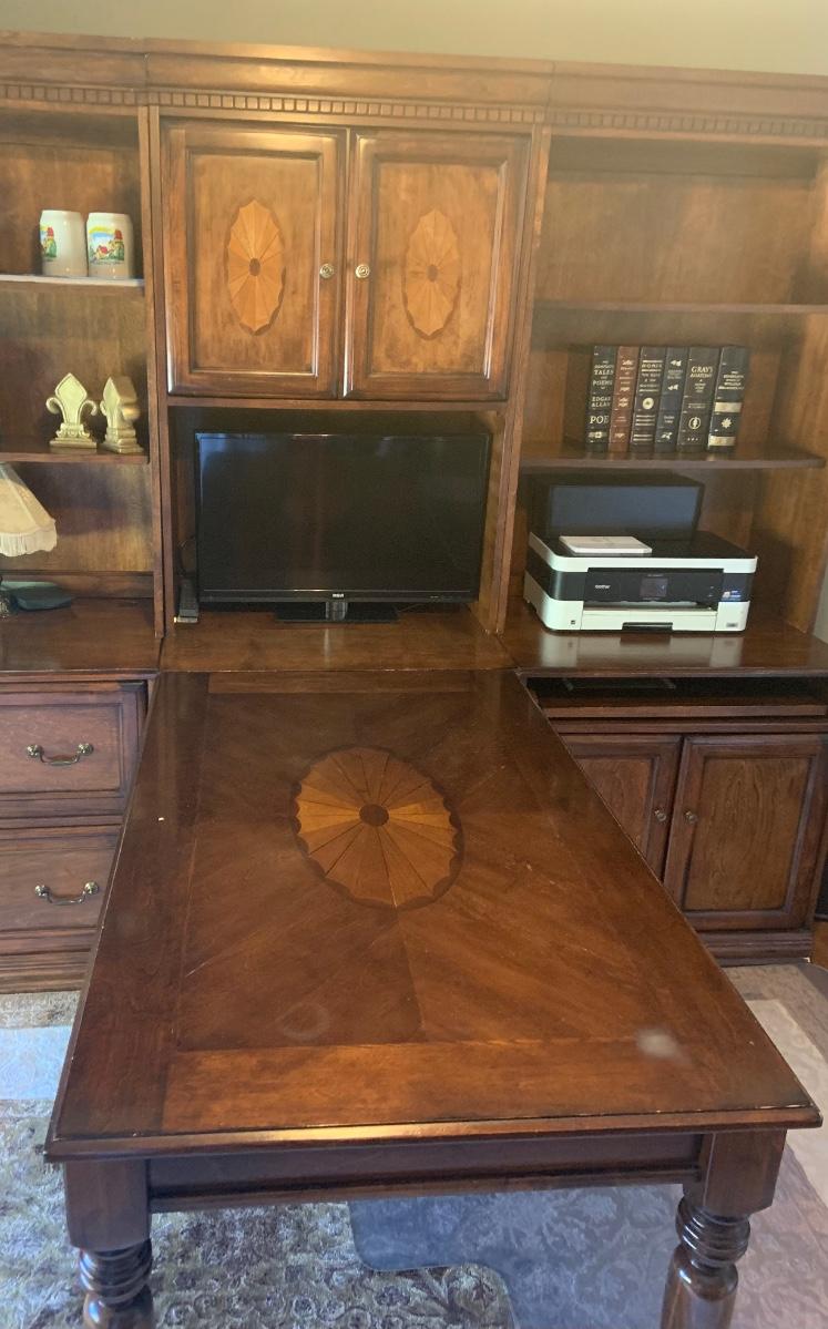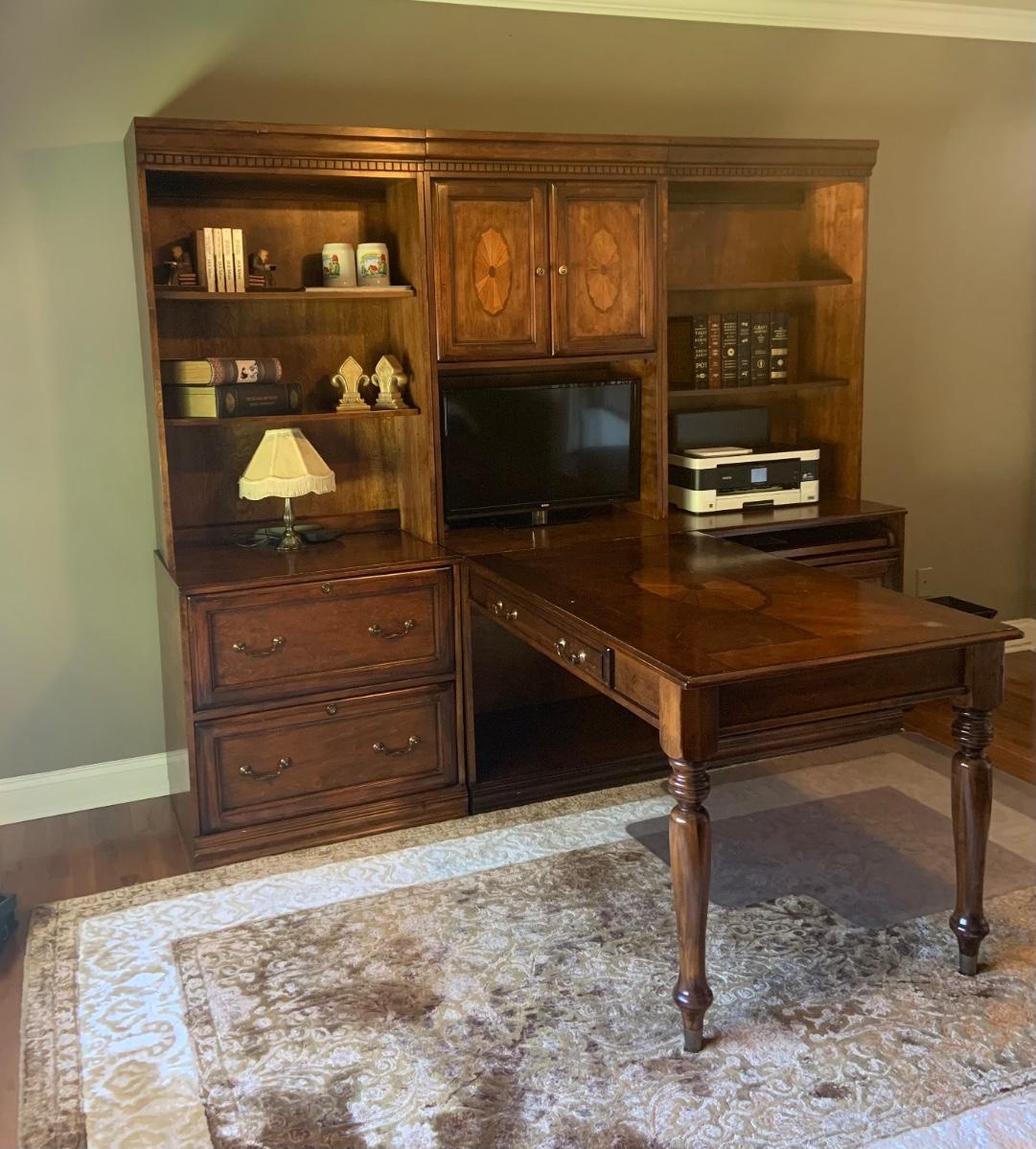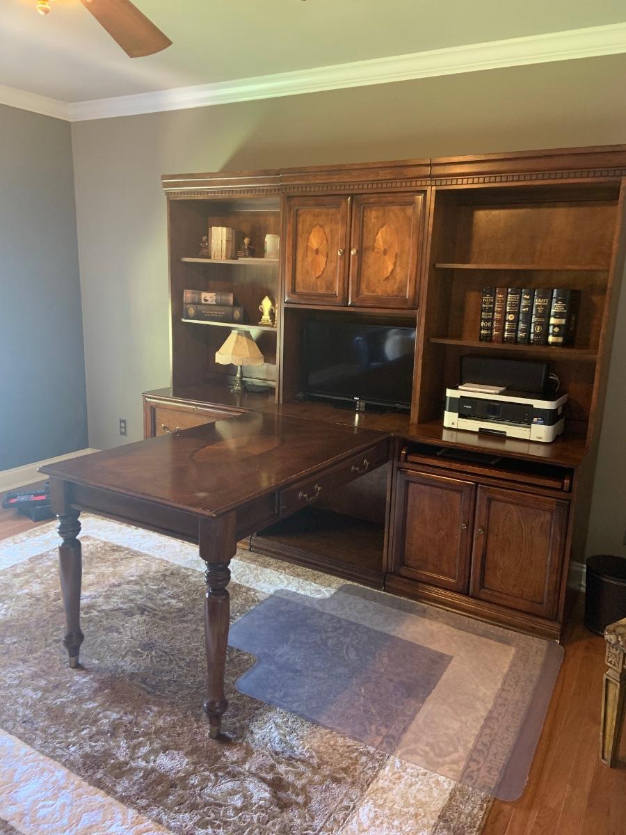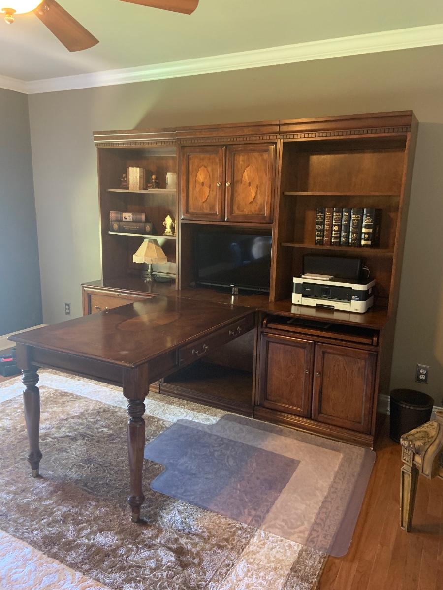 This is for the office furniture Only any items on the Furniture are NOT included. The furniture is in sections and the Shelves measure 91” x 22x by 78” tall and the Desk is 48”x 30” Please see all pictures as they are the best representation of the items. The pictures show condition, measurements if taken, and what is included in the lot. Due to the large amount that we photograph and the time frame, we are not always able to take measurements. All items unless noted, are pre-owned and have been used. If you purchased furniture, you must bring help. We do not allow one person to carry large furniture out on their own. Bring help, tools and a truck for the safety of our client’s homes, and your personal safety. Any damages that result to the property including walls, and floors due to moving of the furniture will be charged to the buyer. Company policy. Thank you.
