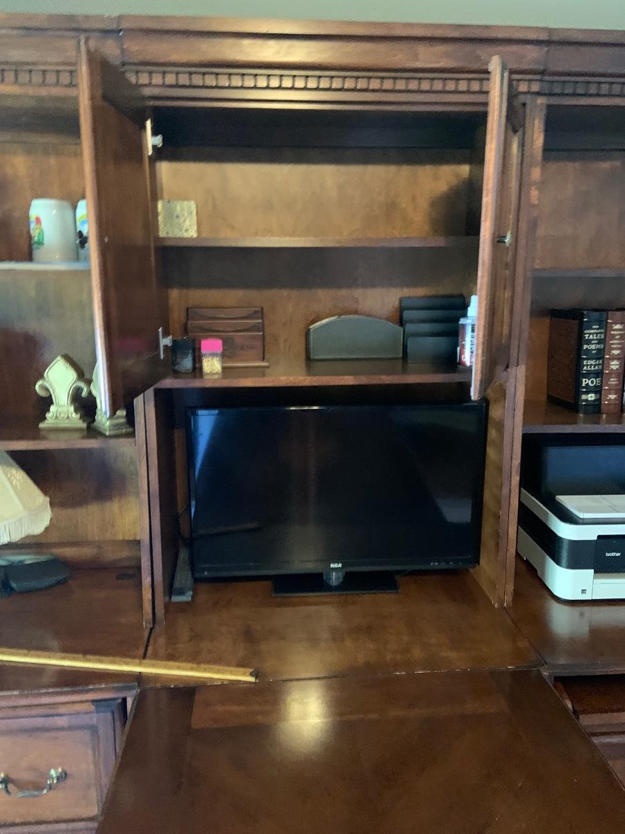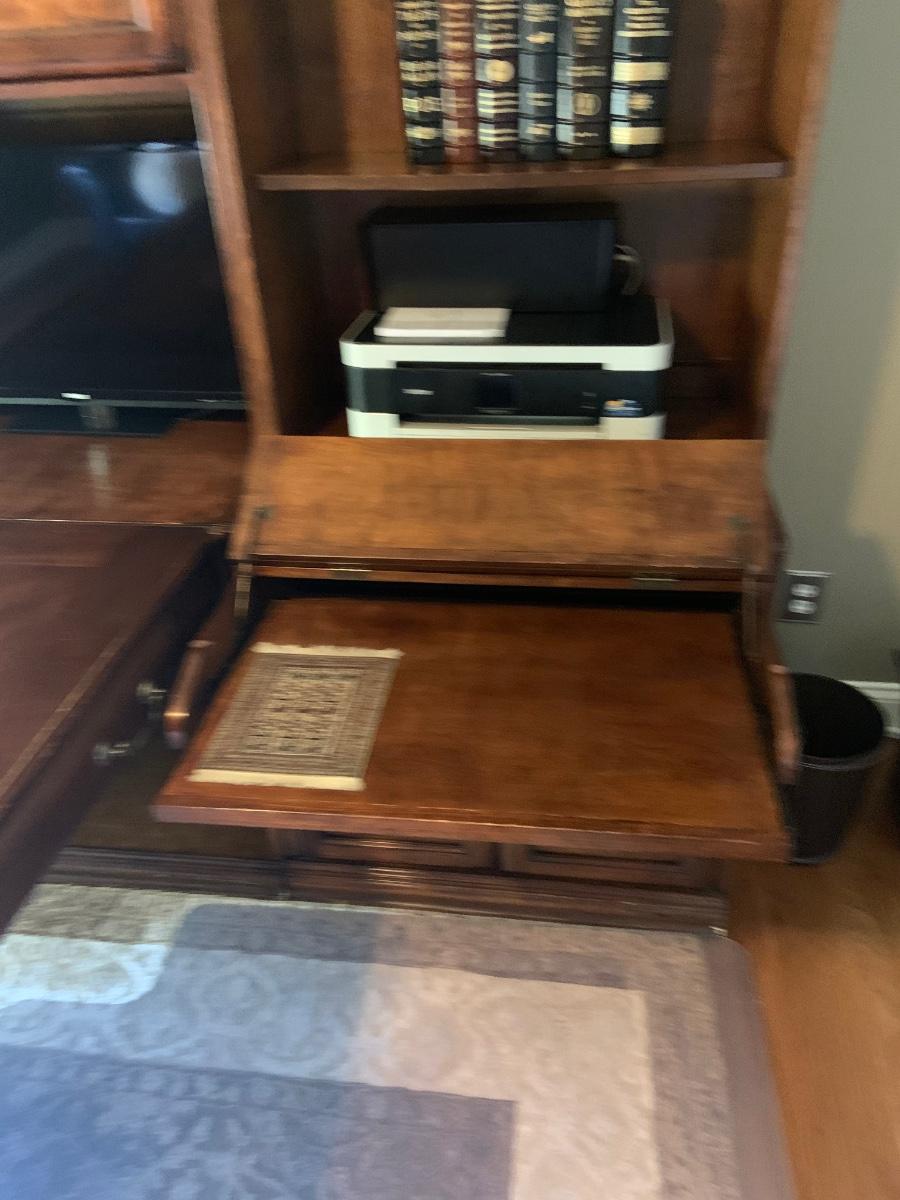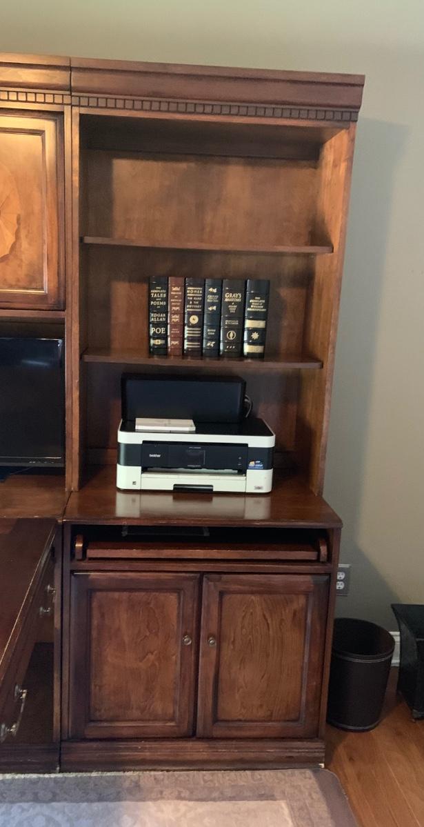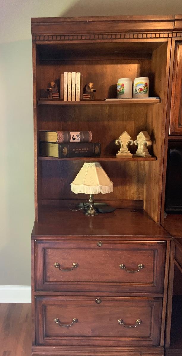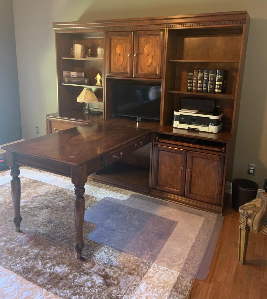 This is for the office furniture Only any items on the Furniture are NOT included. The furniture is in sections and the Shelves measure 91” x 22x by 78” tall and the Desk is 48”x 30” Please see all pictures as they are the best representation of the items. The pictures show condition, measurements if taken, and what is included in the lot. Due to the large amount that we photograph and the time frame, we are not always able to take measurements. All items unless noted, are pre-owned and have been used. If you purchased furniture, you must bring help. We do not allow one person to carry large furniture out on their own. Bring help, tools and a truck for the safety of our client’s homes, and your personal safety. Any damages that result to the property including walls, and floors due to moving of the furniture will be charged to the buyer. Company policy. Thank you.