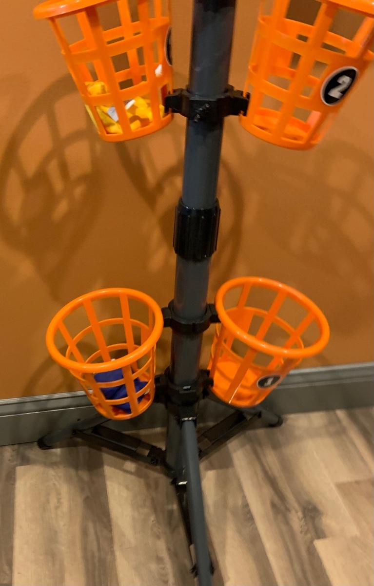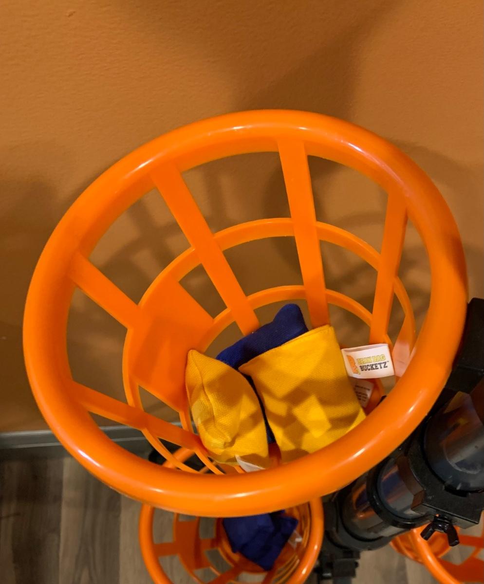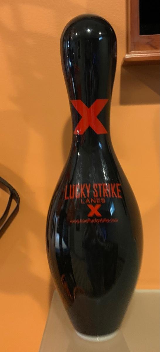 LOT:139G: Miscellaneous Sports: Metal Wall Art Soccer Player & Basketball Player; B3 Bean Bag  Bucketz,  Lucky Strikes Bowling Pin