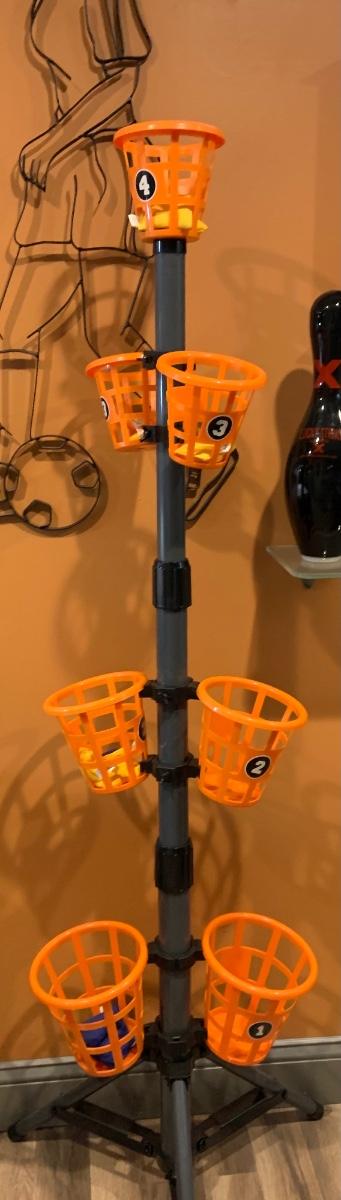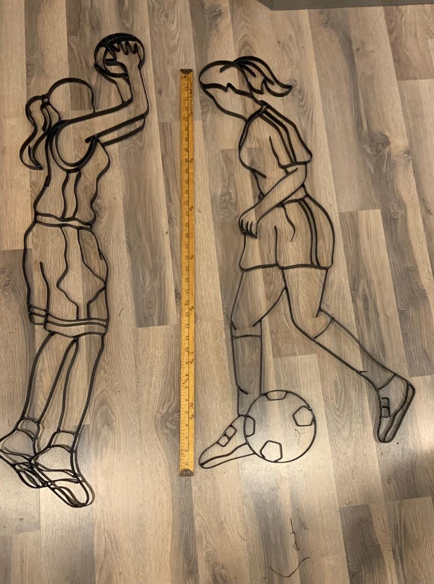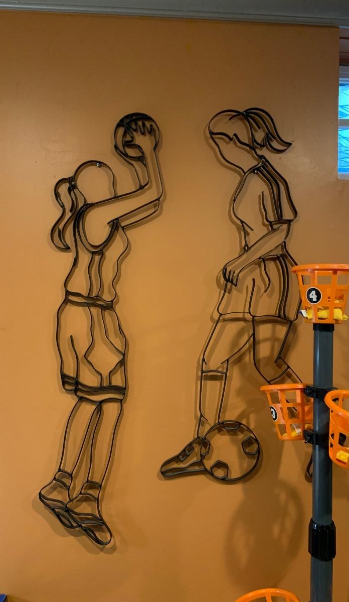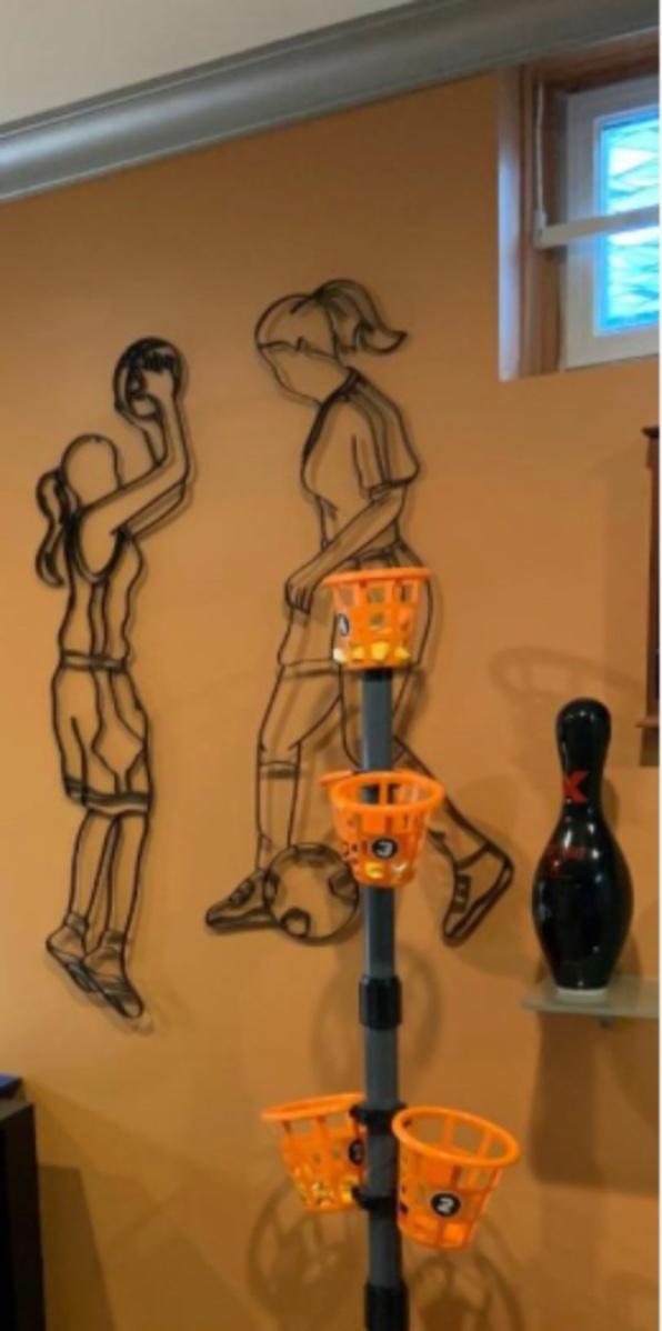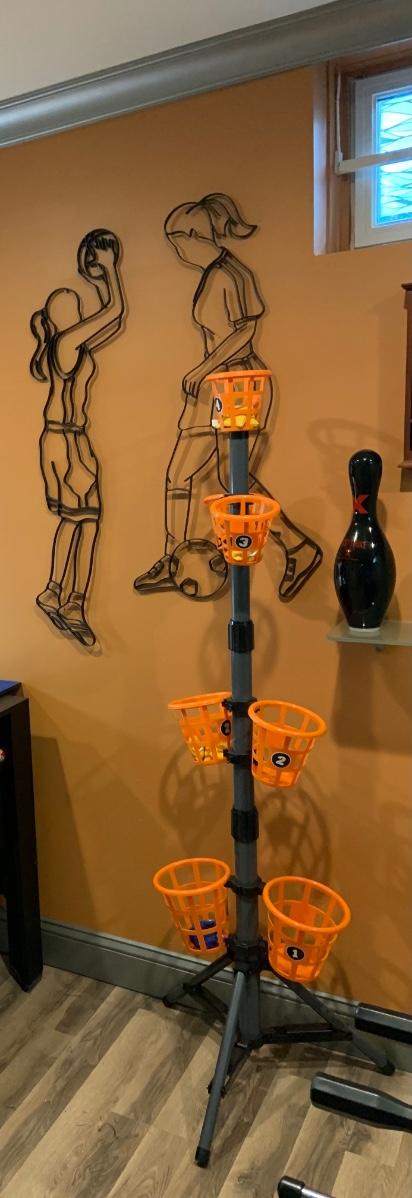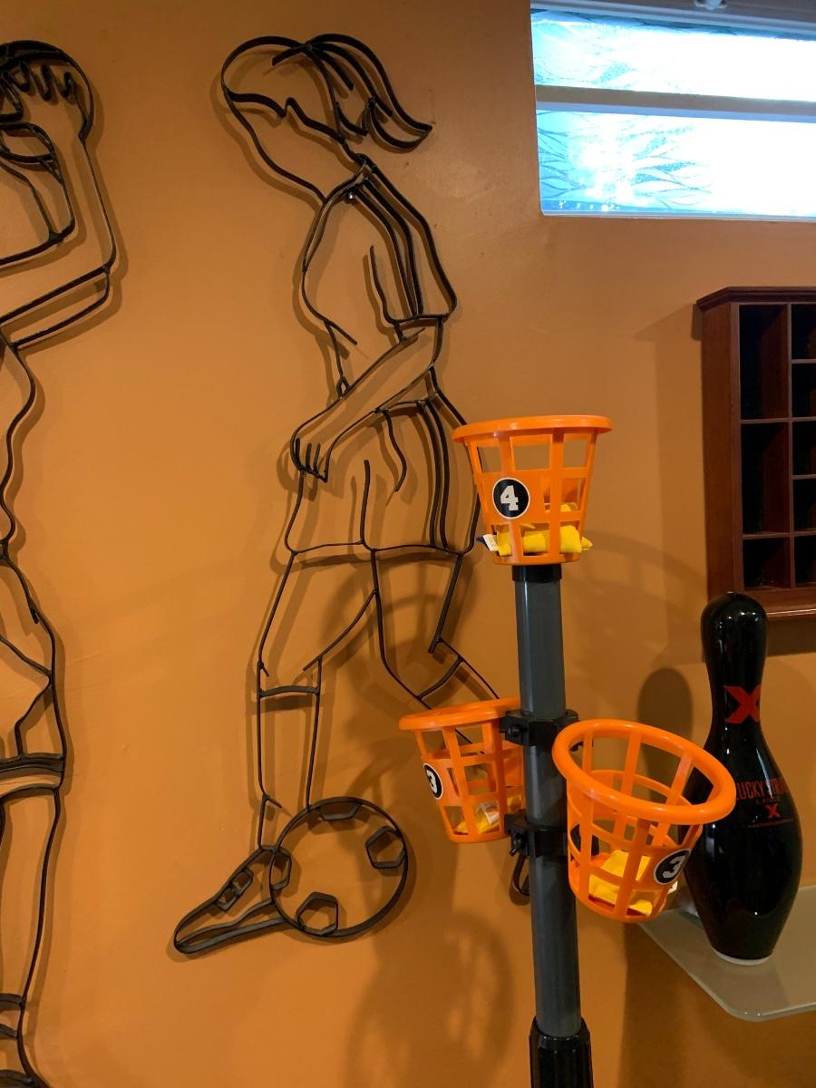 LOT:139G: Miscellaneous Sports: Metal Wall Art Soccer Player & Basketball Player; B3 Bean Bag Bucketz, Lucky Strikes Bowling Pin