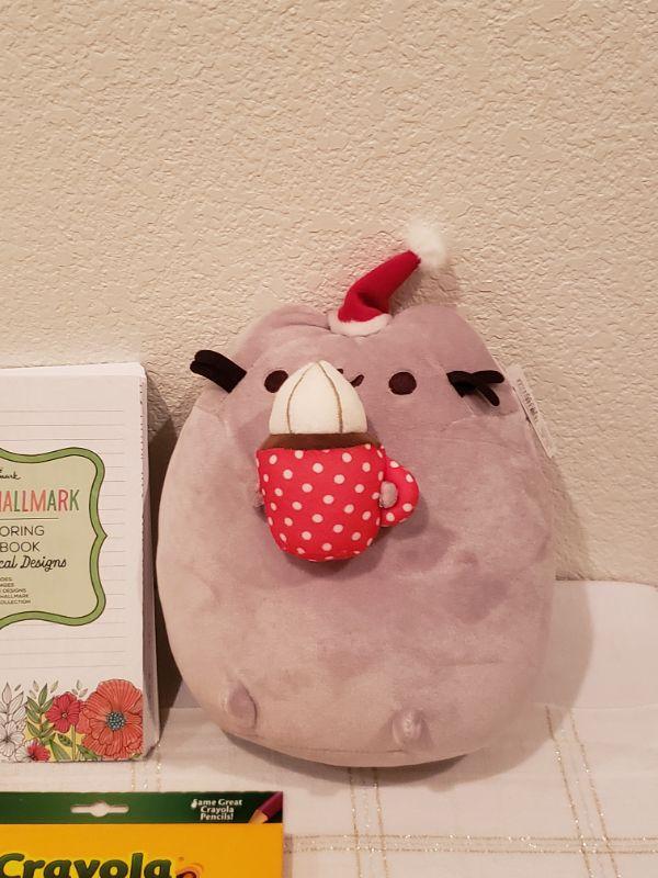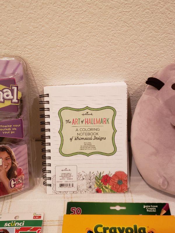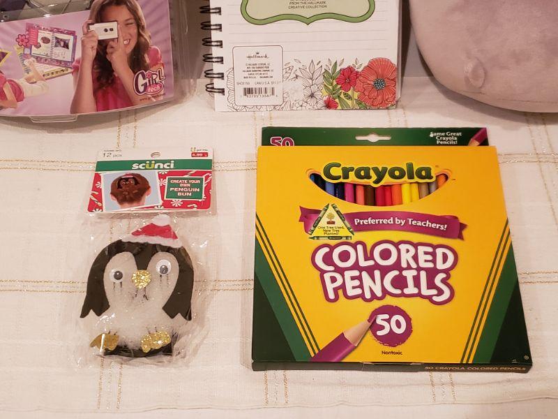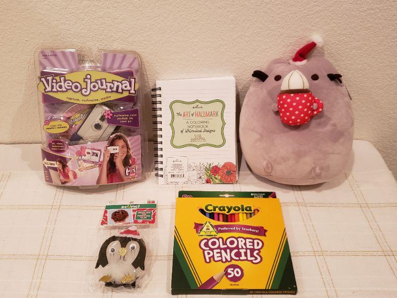 Lot 789: NEW Video Journal, Cat Plushie, Coloring book Journal, Colored Pencils & Penguin Hair Decoration