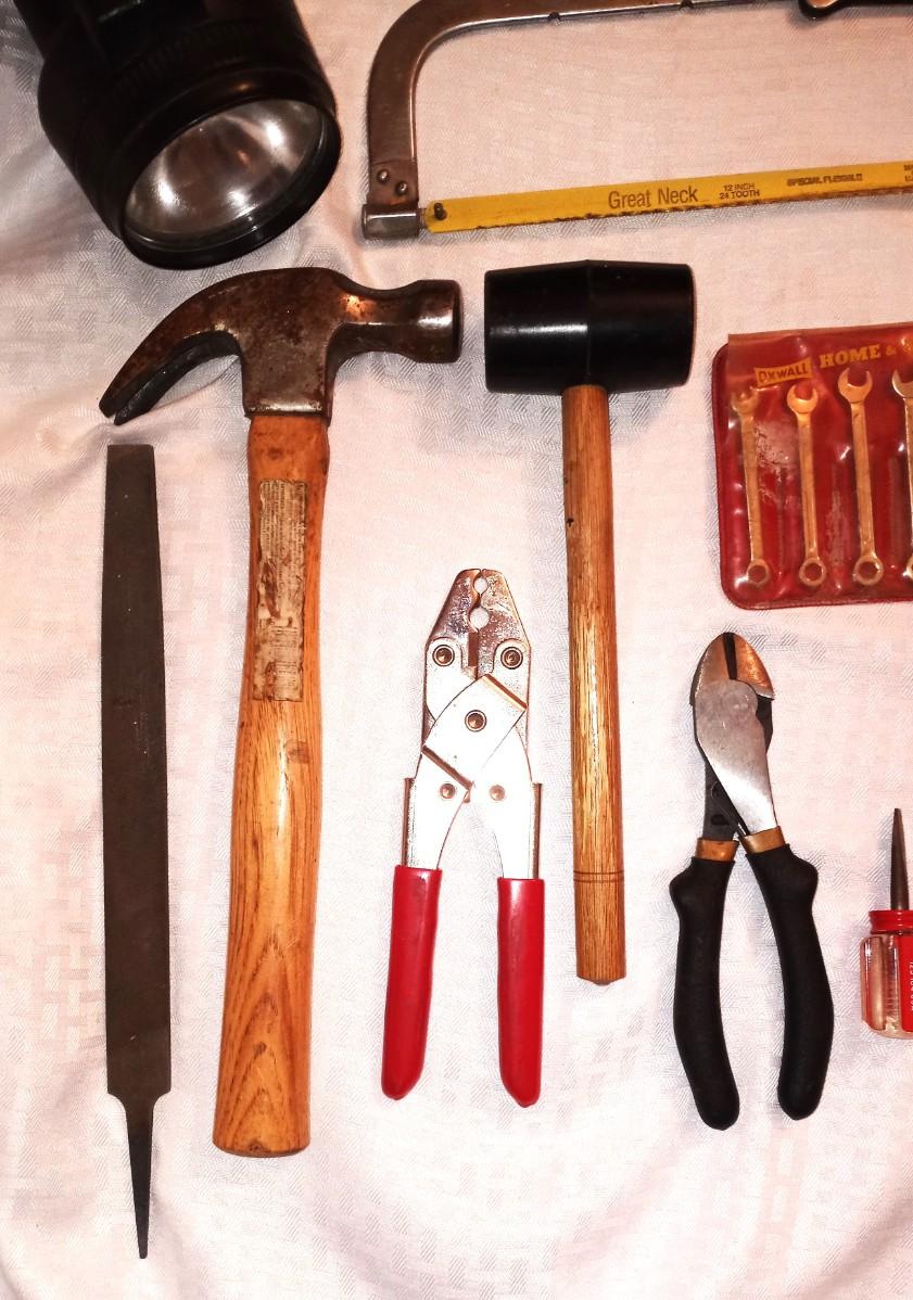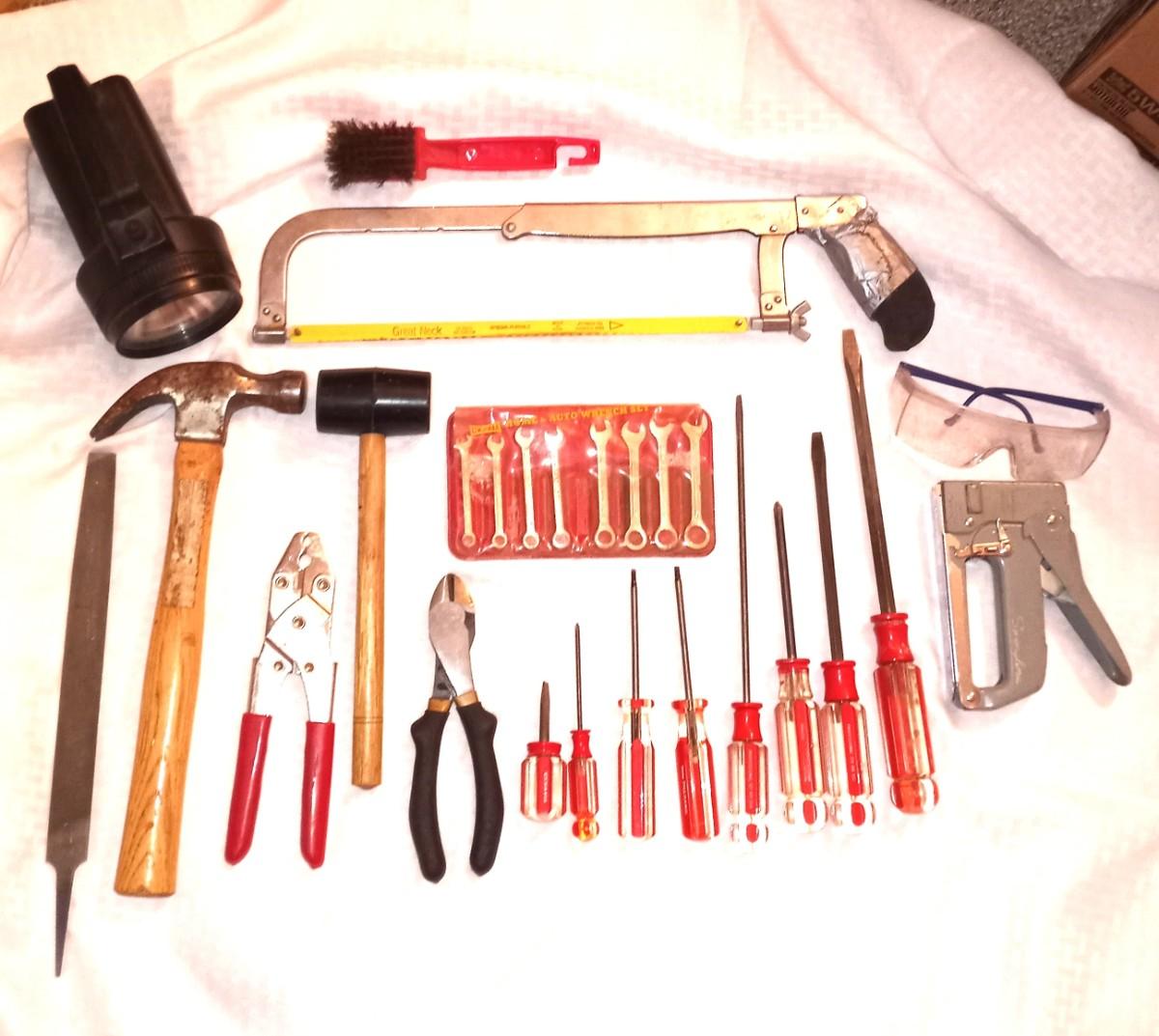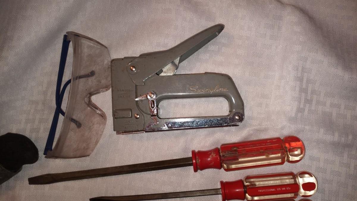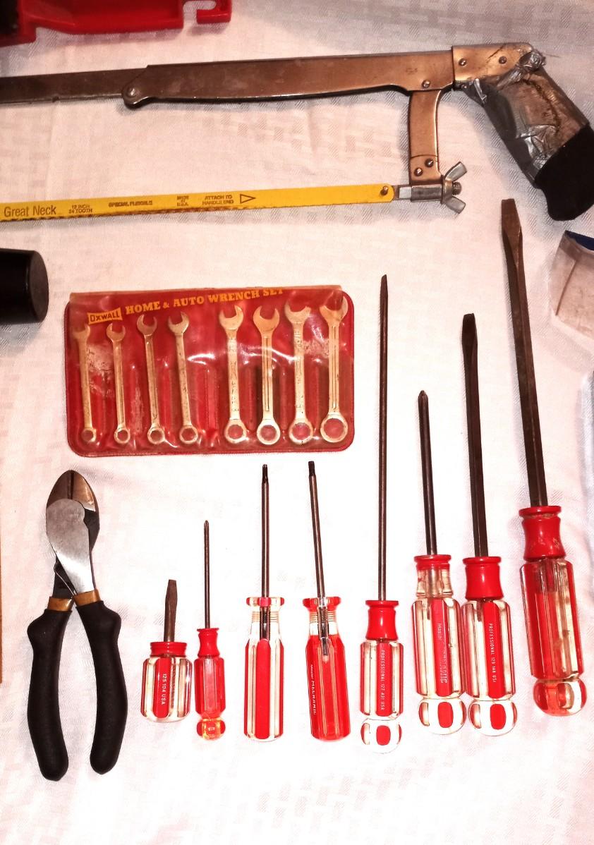 VARIETY OF HAND TOOLS-HAND SAW-STAPLER-FILE-SCREWDRIVERS-HAMMER-MALLOT-CRIMPER AND MORE