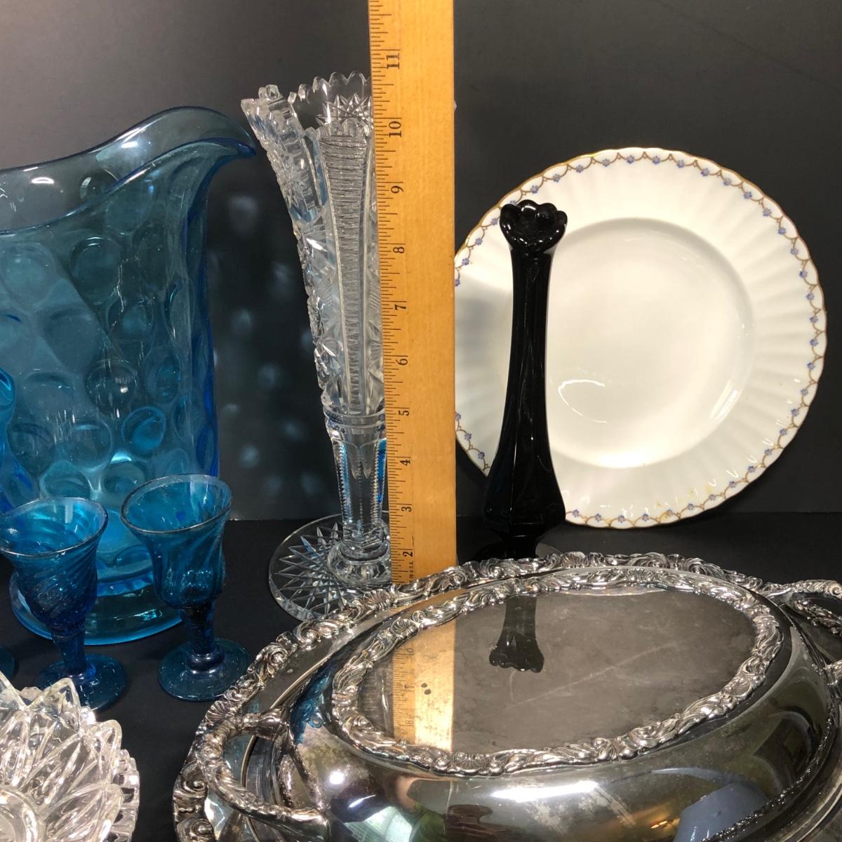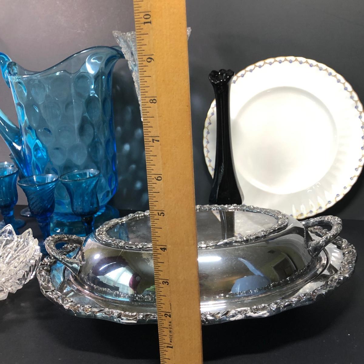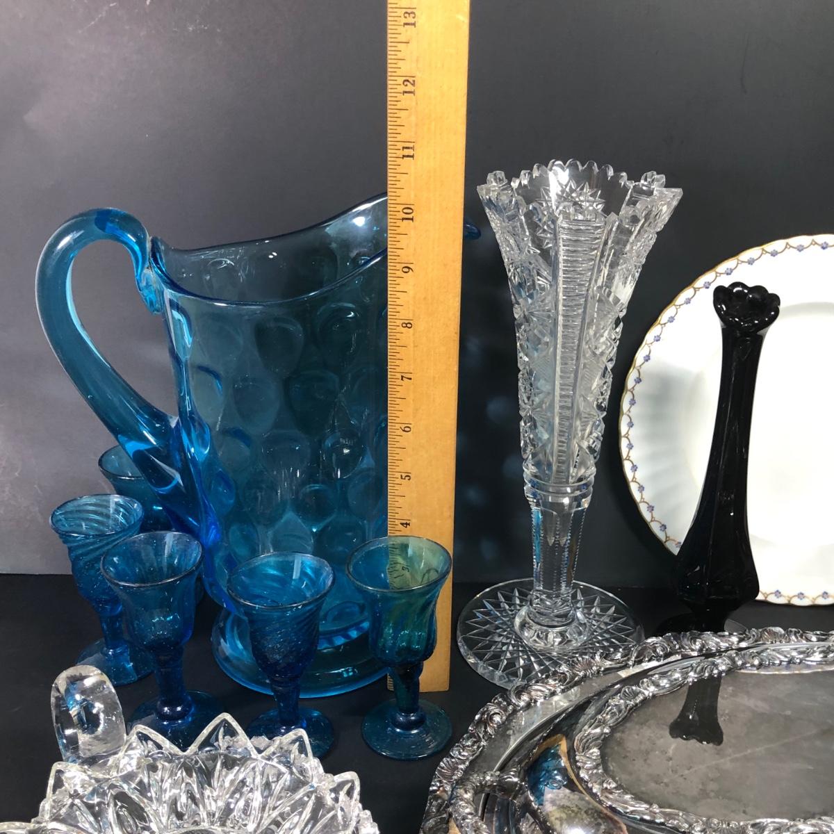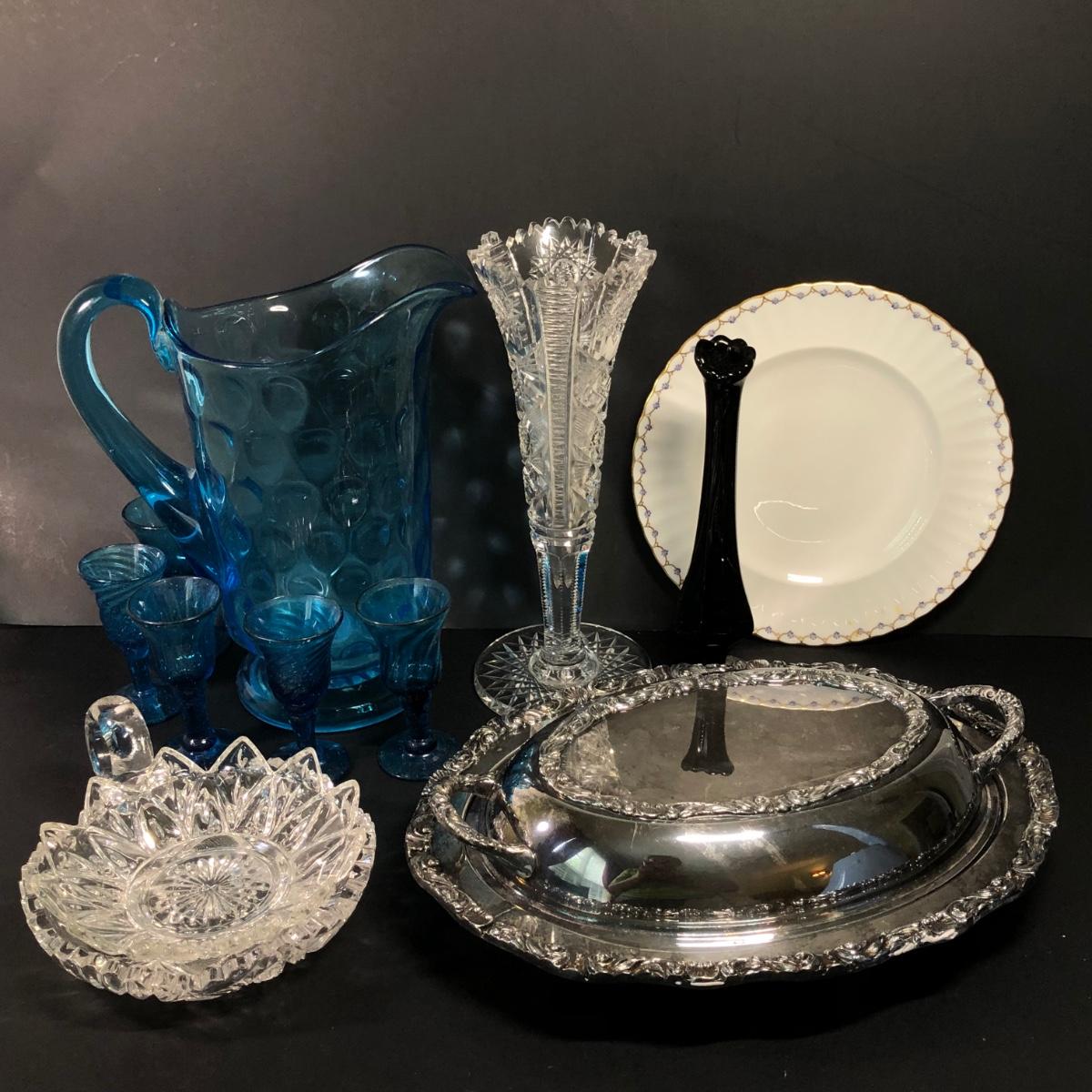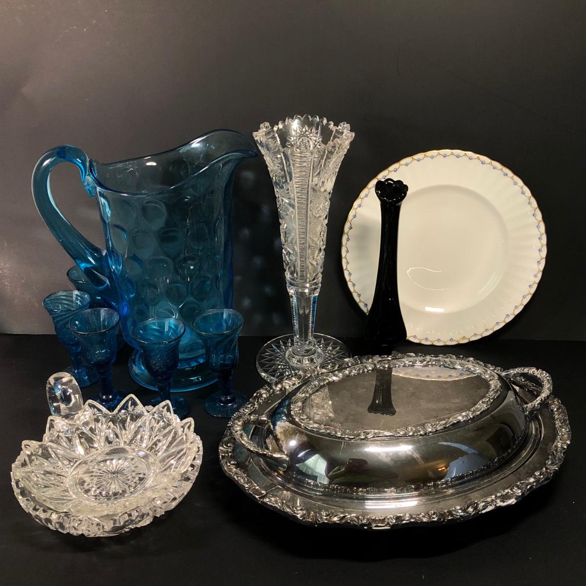 LOT 78M: Crystal Dishes, Blue Glass Pitcher w/ Matching Glasses, Silverplate Chaffing Dish & More
