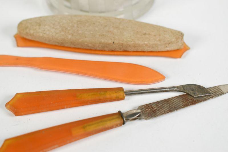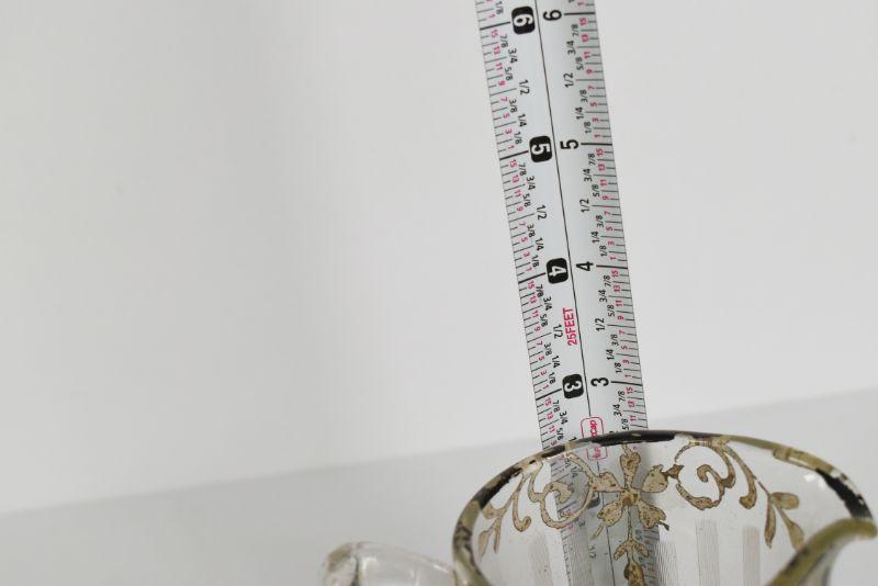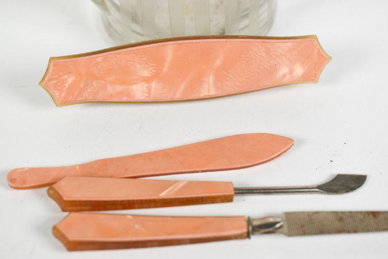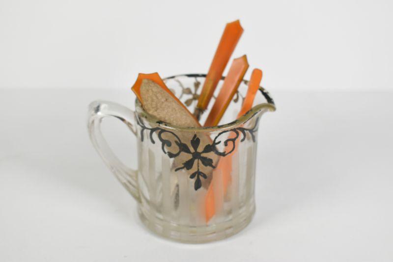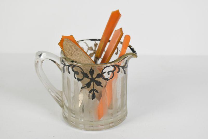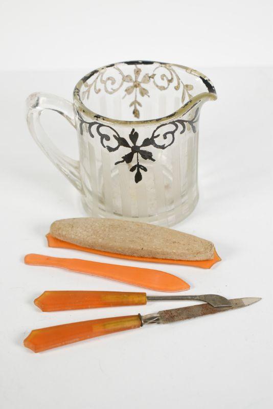 A small vintage glass creamer and celluloid nail care tools. There is rust on the file.**Please read Terms and Conditions before placing a bid. Pick up is Sunday, December 22 from 11am to 3pm or Monday, December 23 from 4pm-7pm in Mantua, NJ. All sales are final. All sales are as is, where is. Please review all photos. Props are not included. Measurements are approximate.