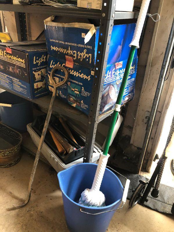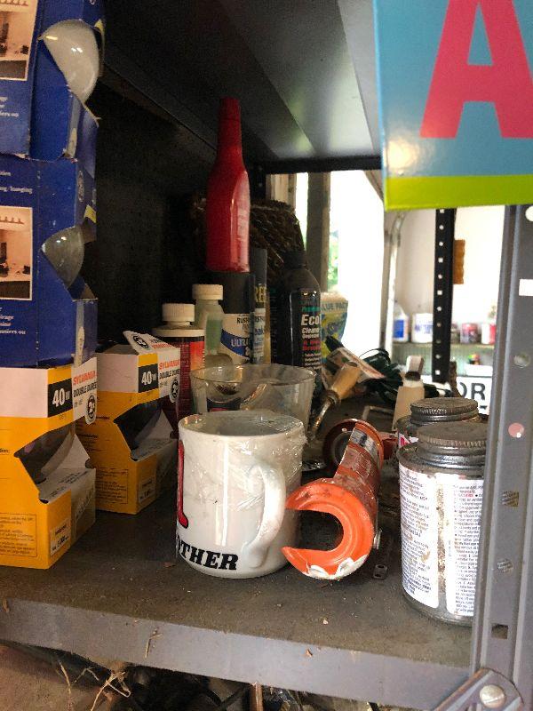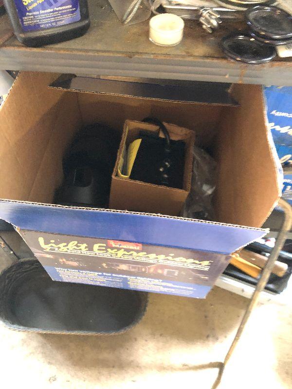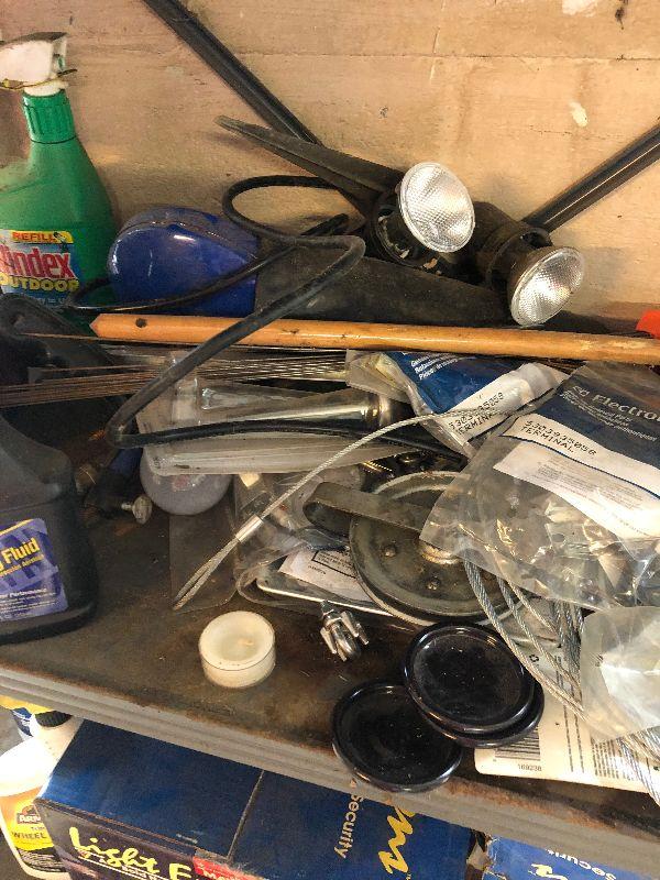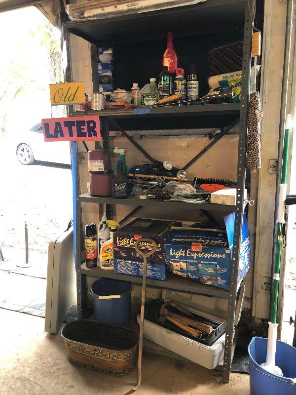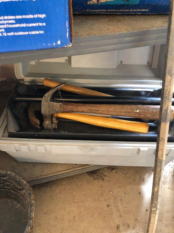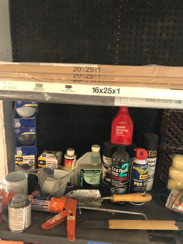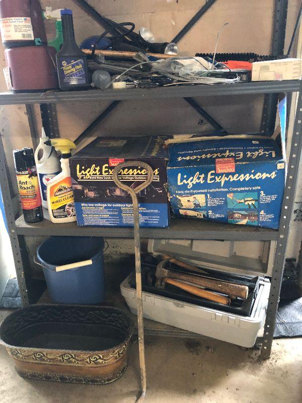 Stanley toolbox with tools, outdoor lighting, paint rollers, light bulbs and other miscellaneous items. Please note that the folding table shown in first picture is not included.