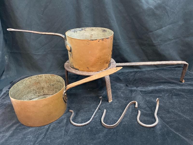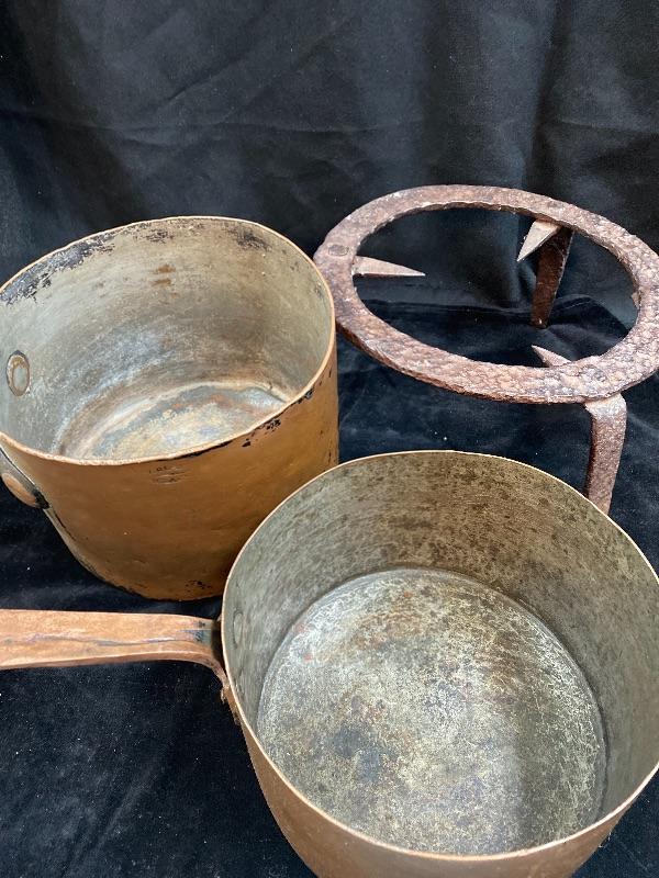 Antique Copper Pots, and a cast iron fire stand to put the pots on. Please see all pictures for condition of the items listed and what is included in the lot. Pictures will also show any measurements if taken and is the best representation of the items. Thank you for looking and have fun bidding! We appreciate Treasure Hunters!