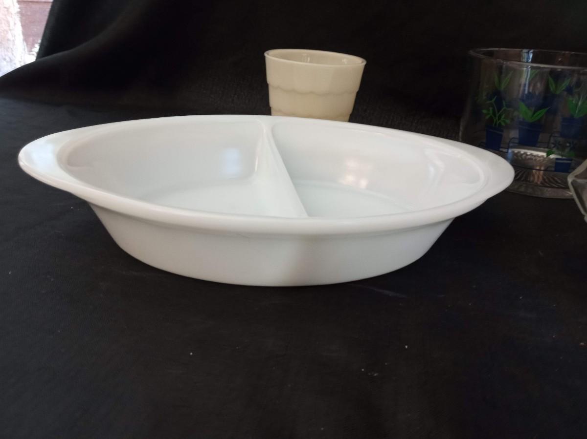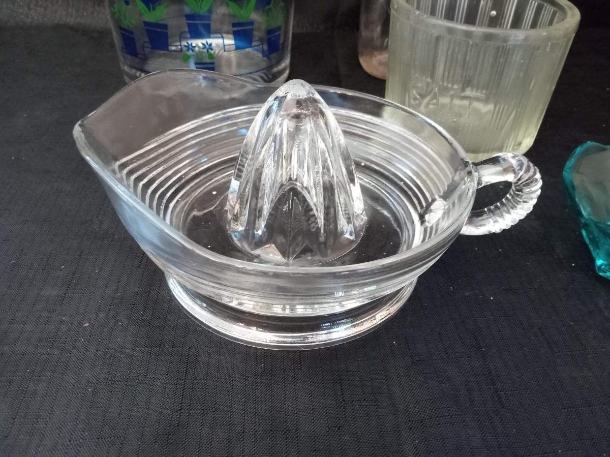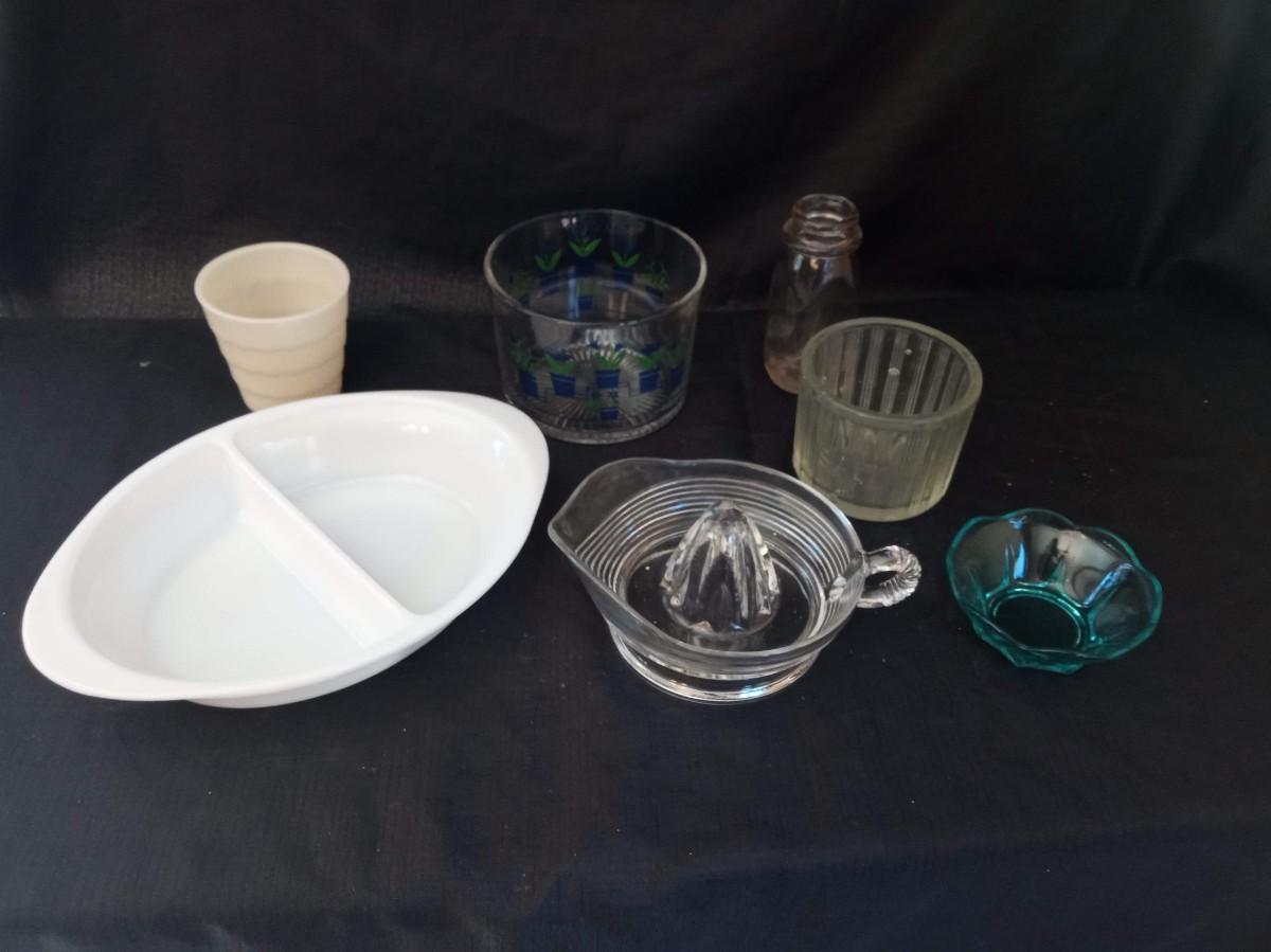 DIVIDED CASSEROLE DISH, GLASS JUICER, SALT CONTAINER, SEVERAL OTHER DISHES AND A GLASS BOTTLE