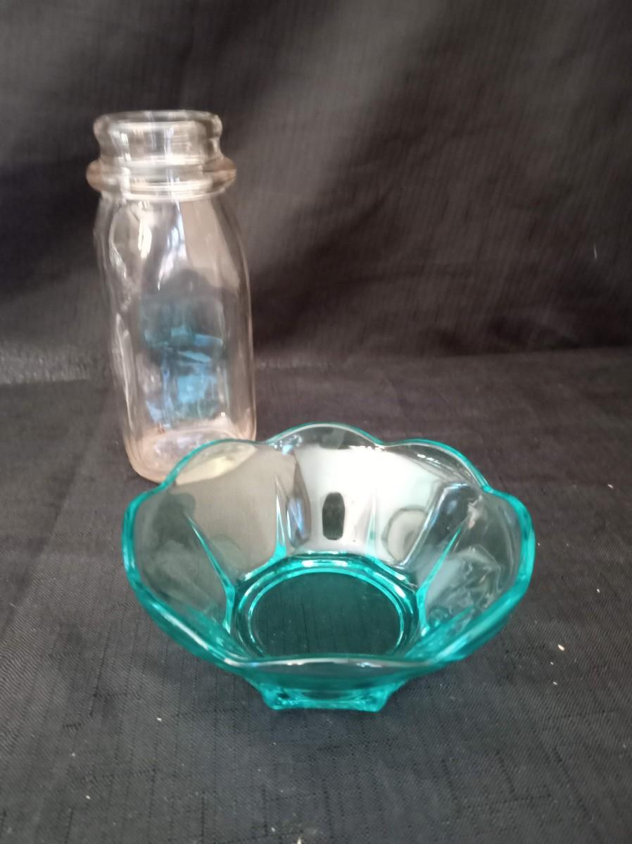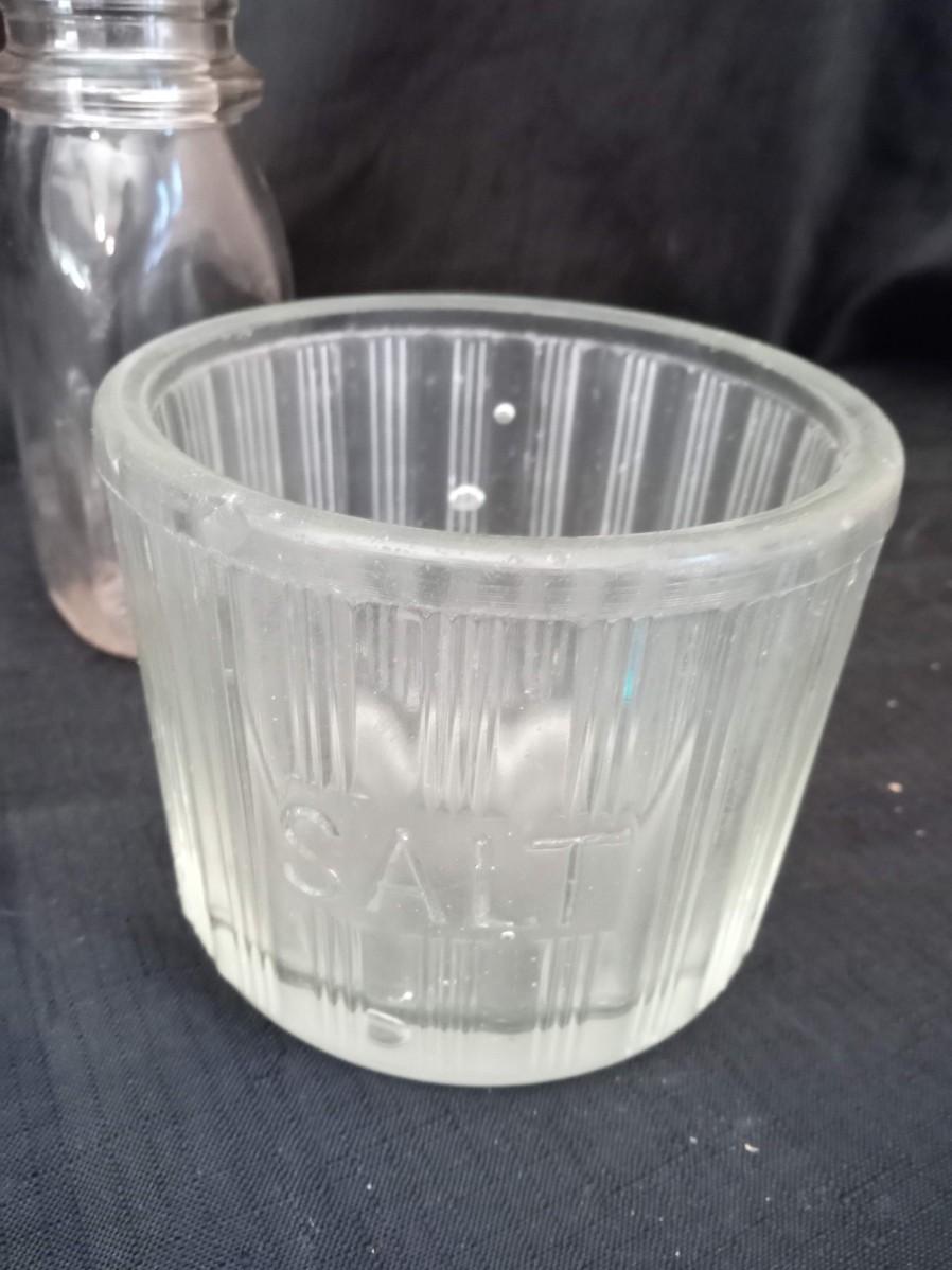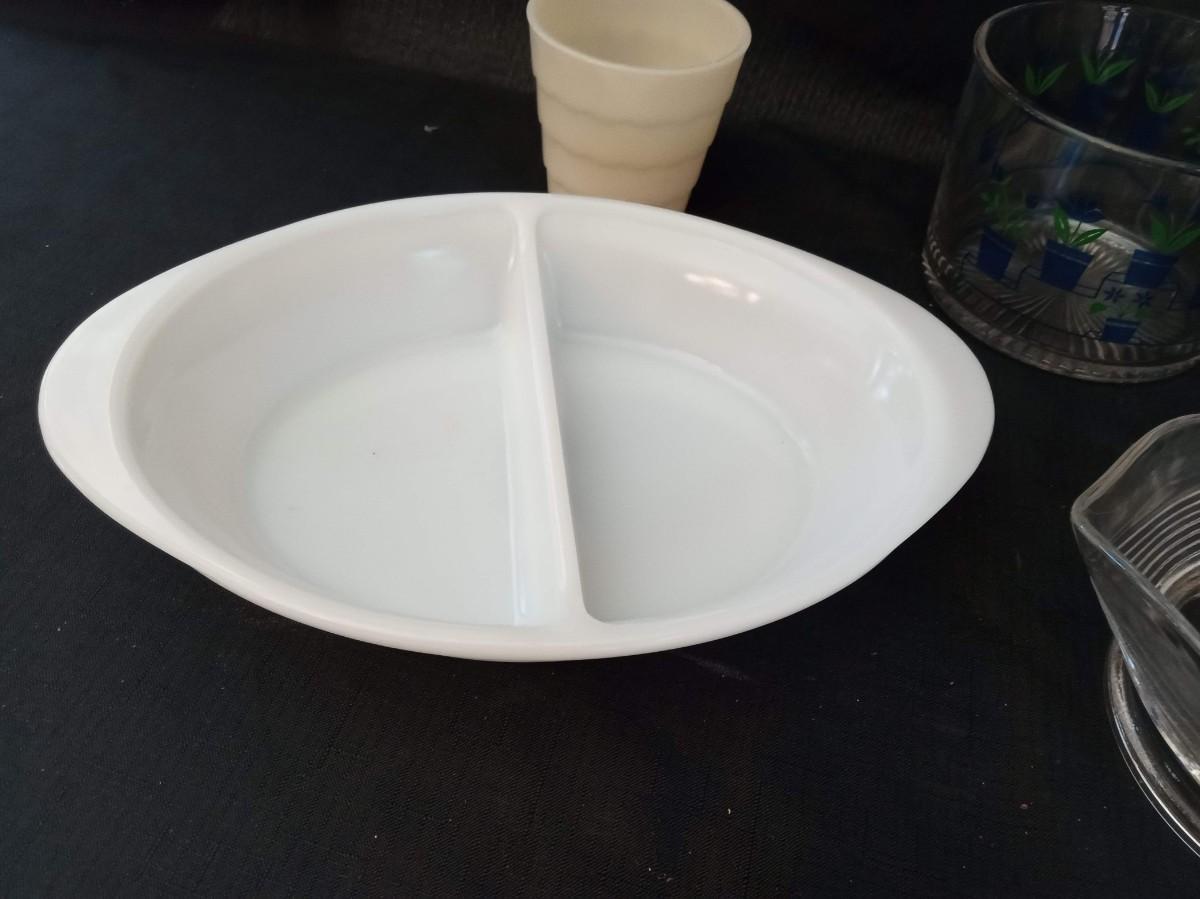 DIVIDED CASSEROLE DISH, GLASS JUICER, SALT CONTAINER, SEVERAL OTHER DISHES AND A GLASS BOTTLE