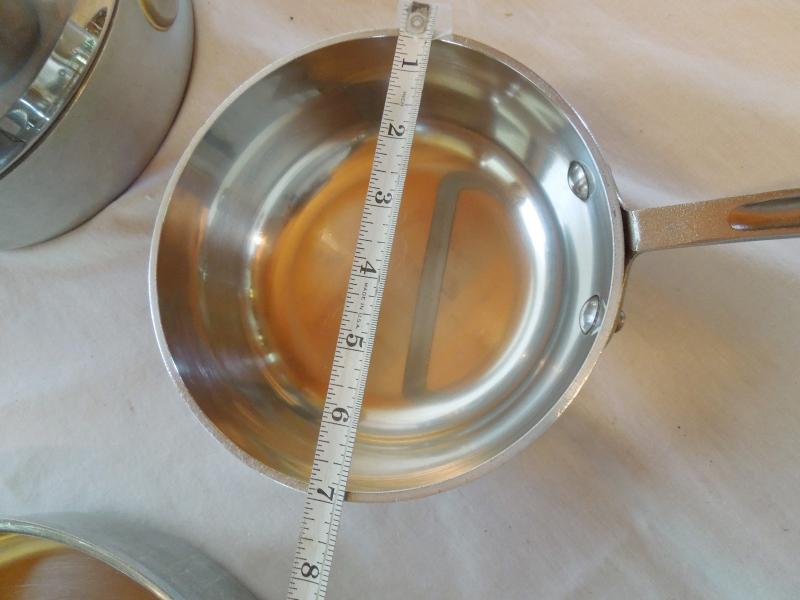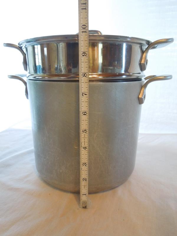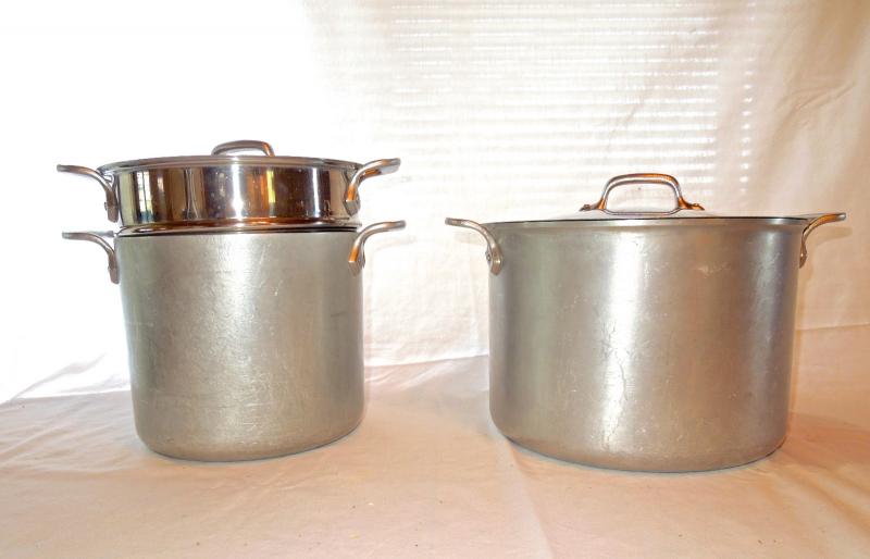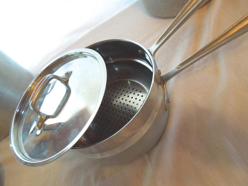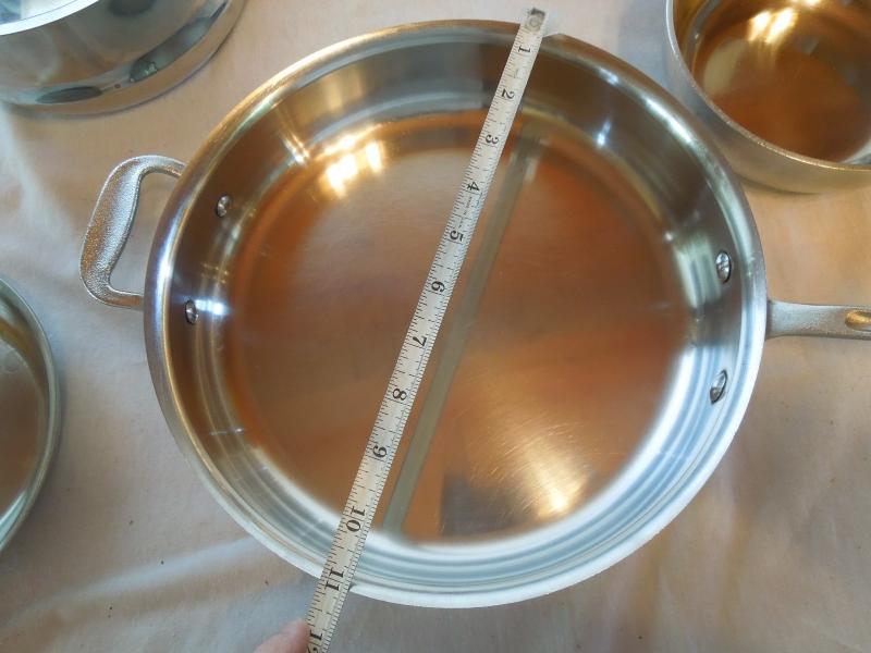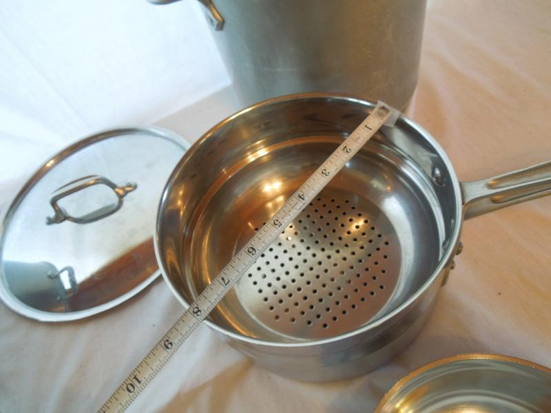 9" double saucepan with lid; 3 sauce pans 11" 8" and 7"deep. 8" sauce pan; extra 11" lid; covered stock pot and large double steamer with lid. Super clean and like new.