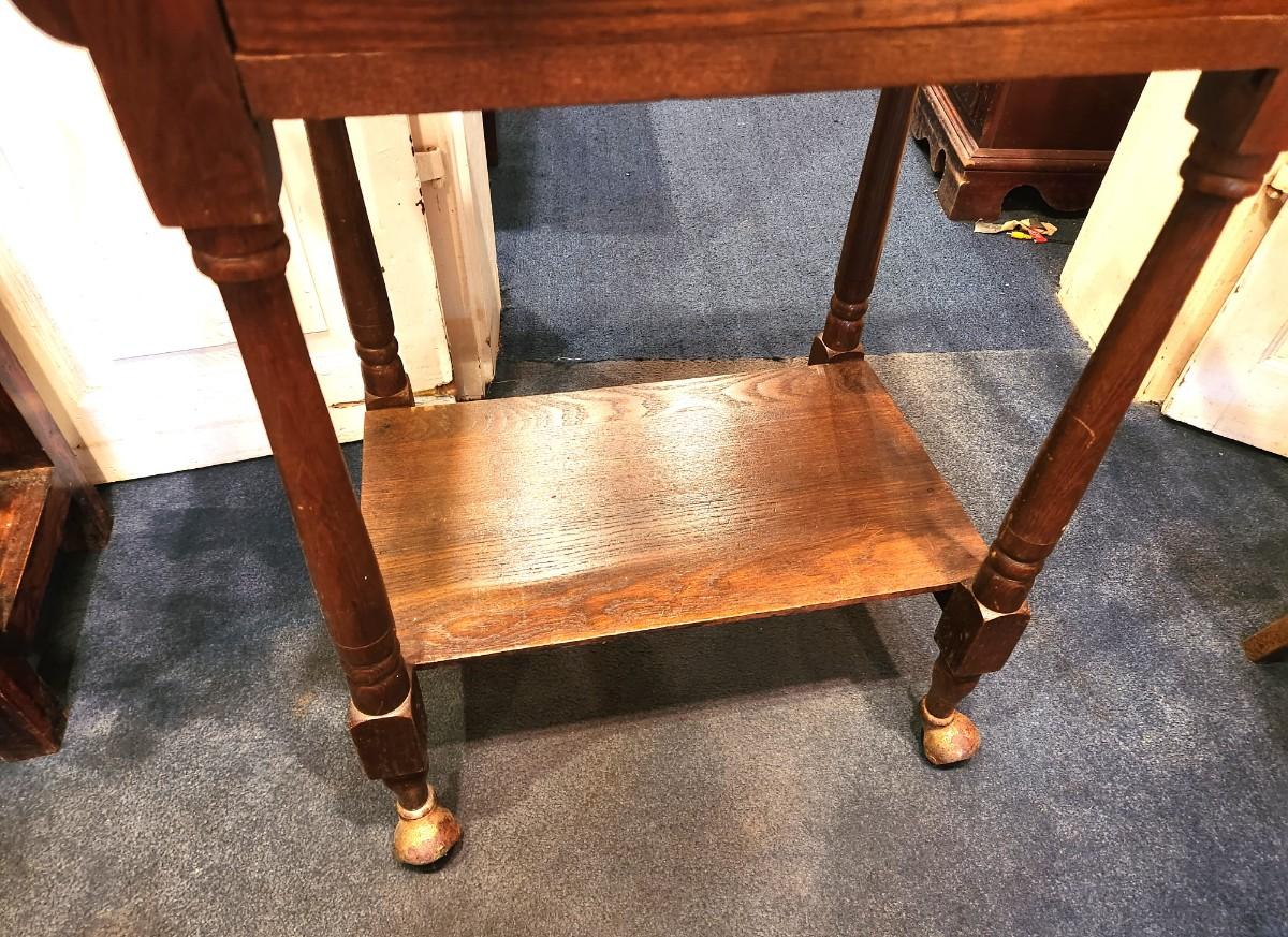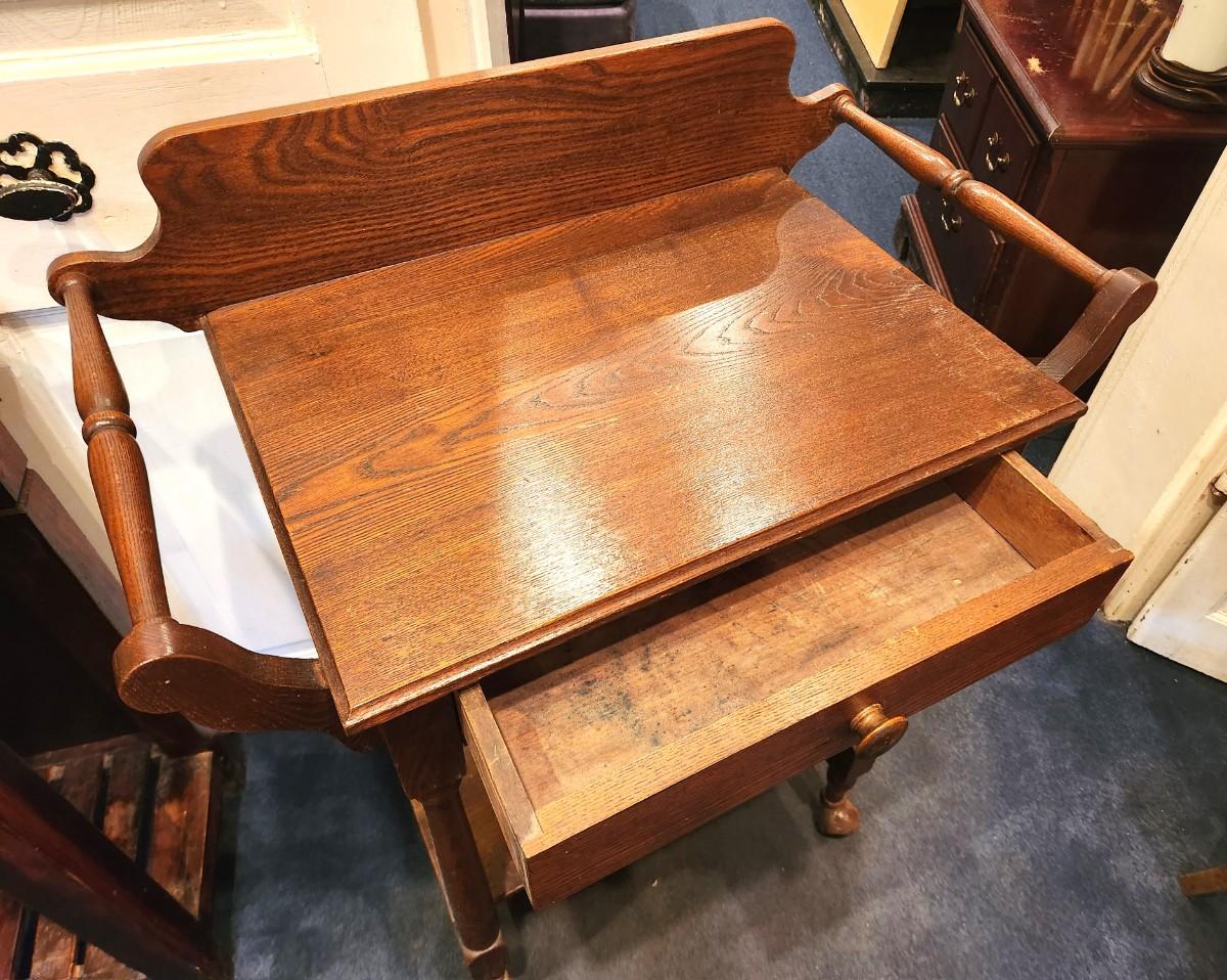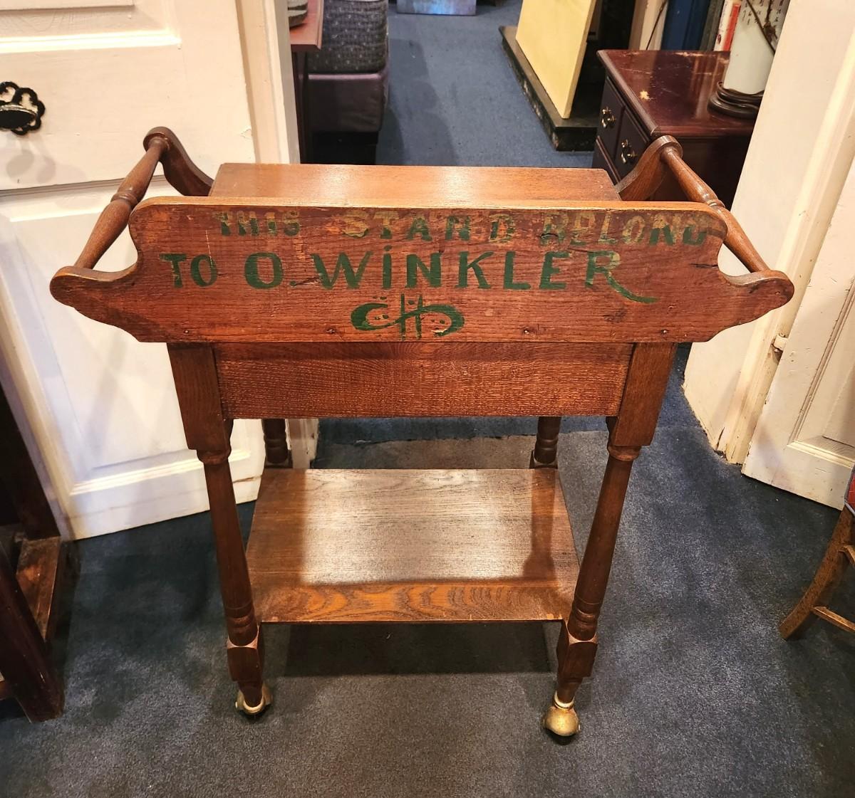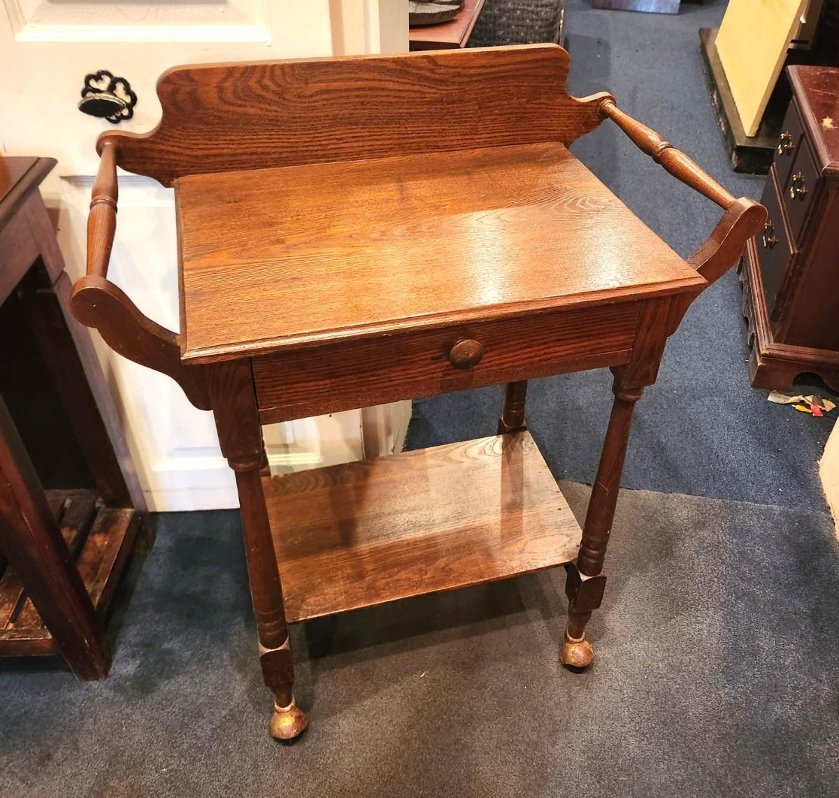 Nict antique oak rolling washstand w/drawer, good condition. 28" across, 15" deep, 35.75" tall. According to info on the back, stand belonged to O. Winkler. This stand would be very cute in a ktchen or bathroom as well.