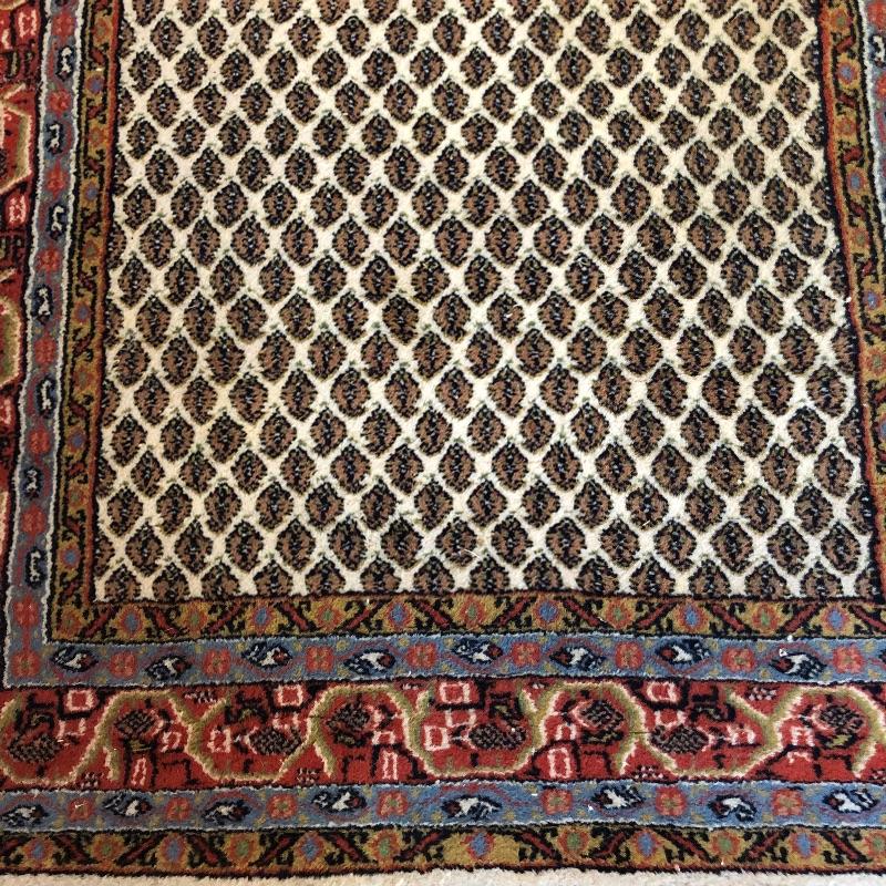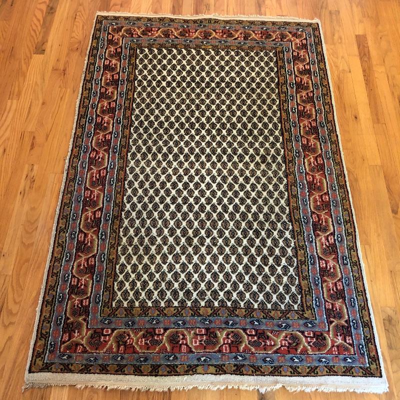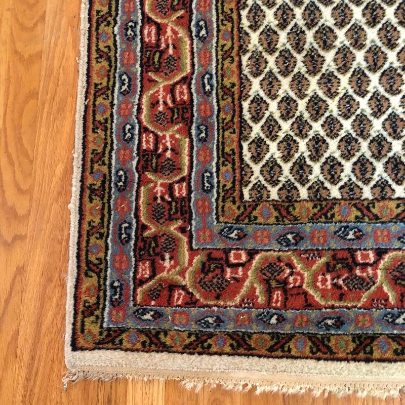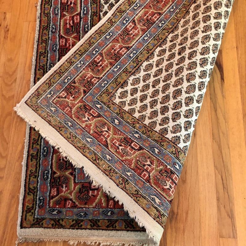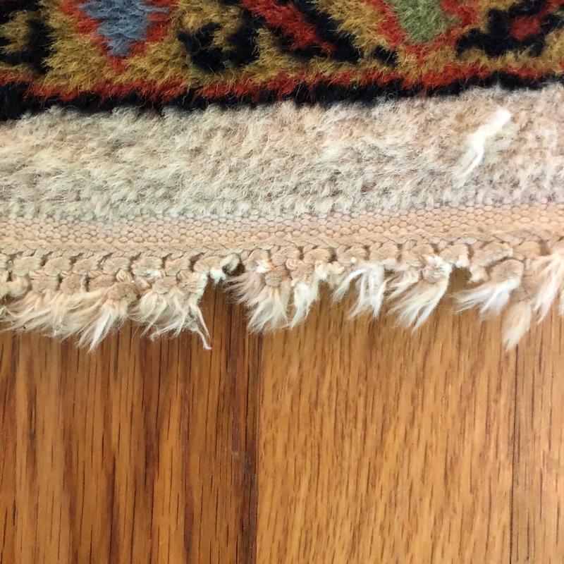 A great size for any space, this small rug should fit most decor themes. The fringe is worn in places but overall it’s in good condition and a very attractive rug.