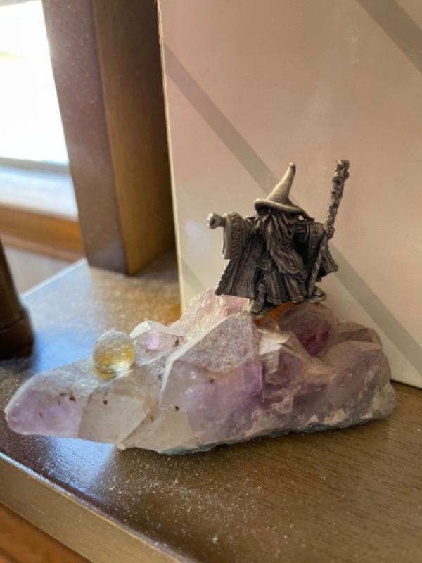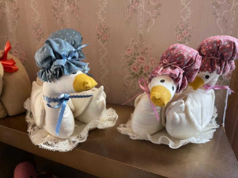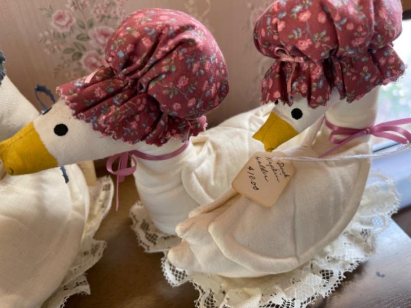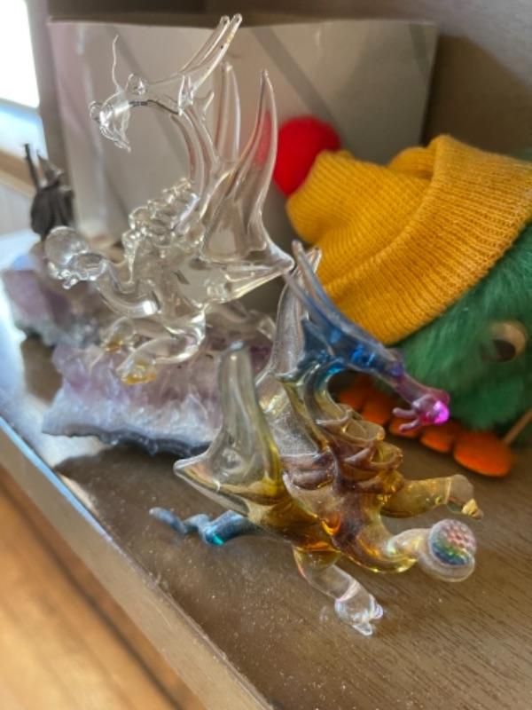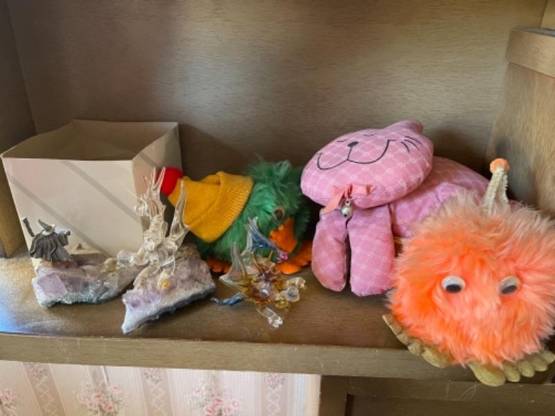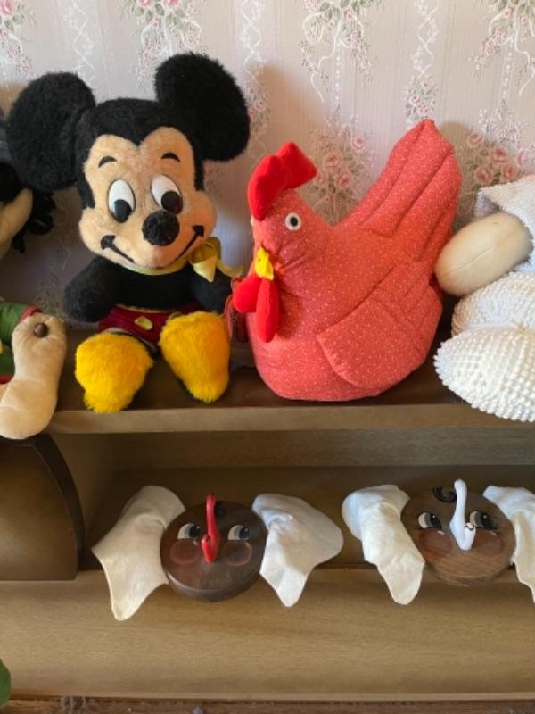 Lot 79. Assortment of stuffed animals and dolls (vintage), glass dragon with crystal, amethyst with pewter dragon/wizard; vintage Mickey Mouse doll; 1970s fuzzy footed balls, duck napkin holders, etc.--Was $35 - - Now $12