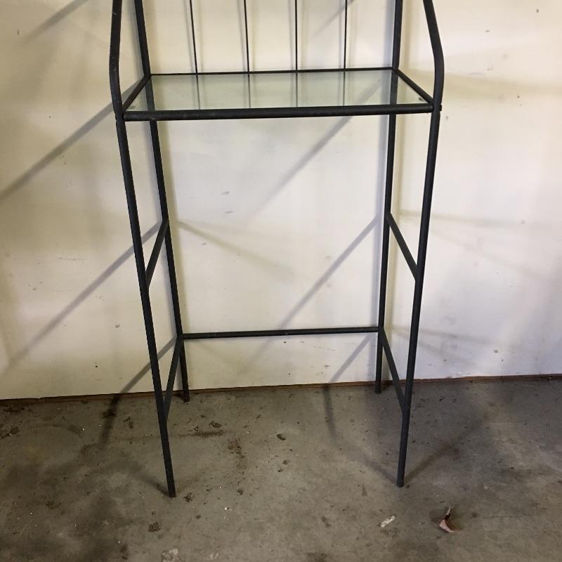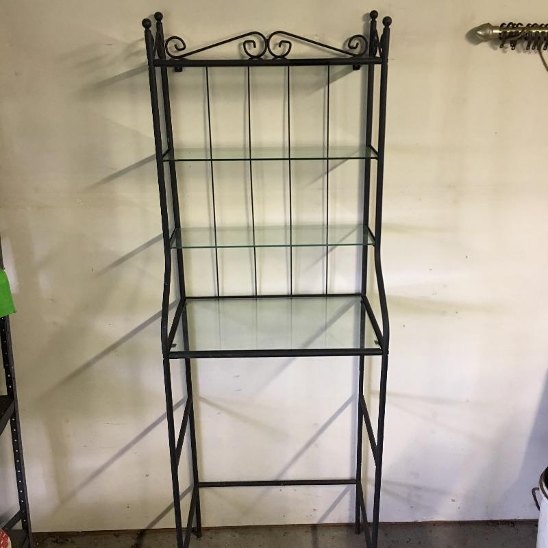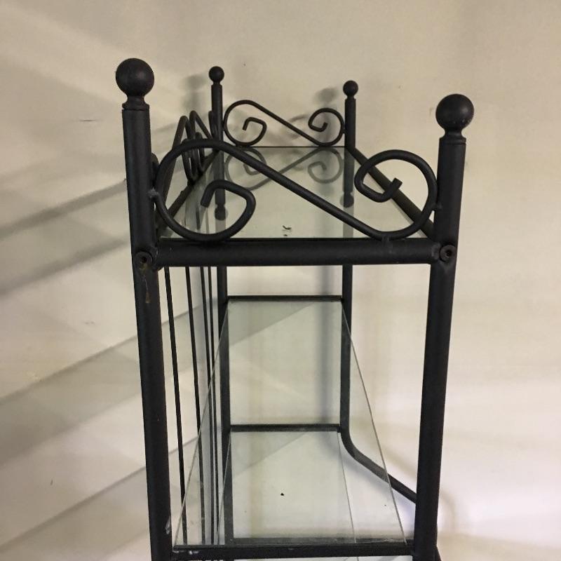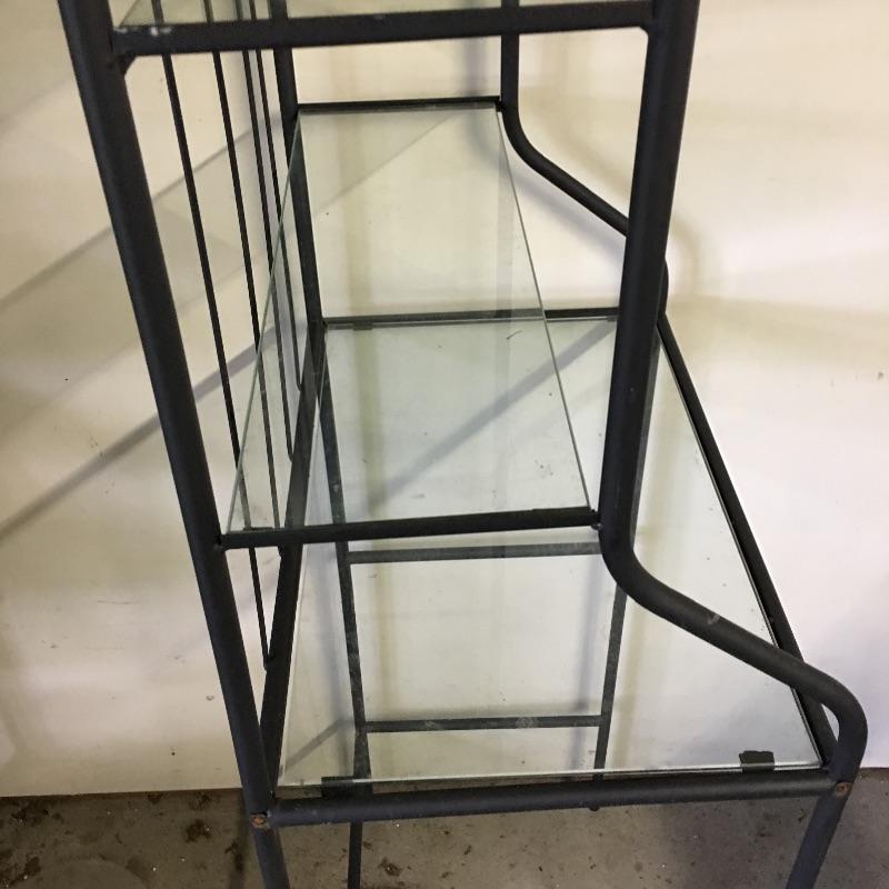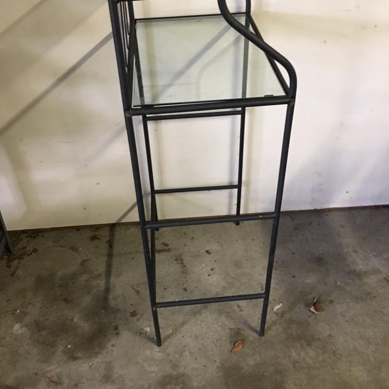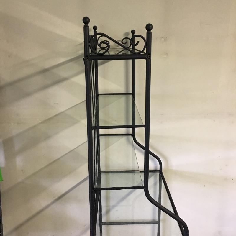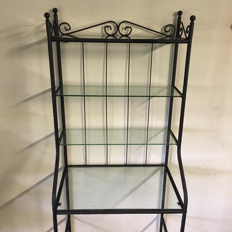 Glass and metal bakers rack with four glass shelves. A great way to display your treasures for all to see. Rack has two points to attach to wall and is very sturdy when leaning against a wall. Rack measures 15” x 23” x 69”.
