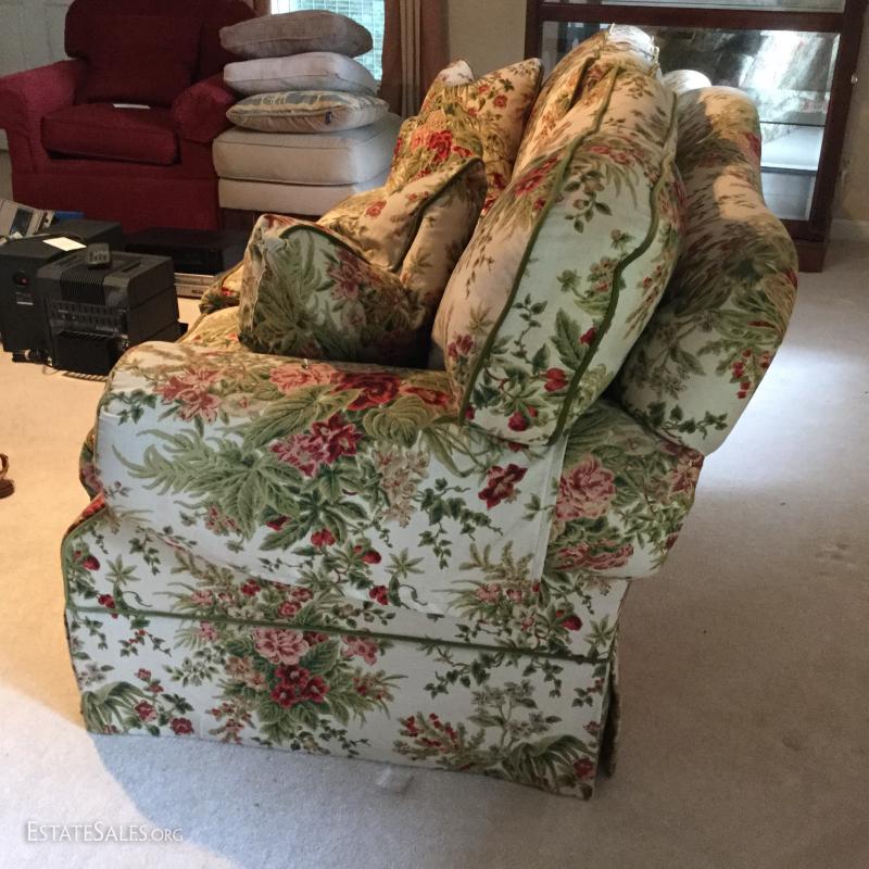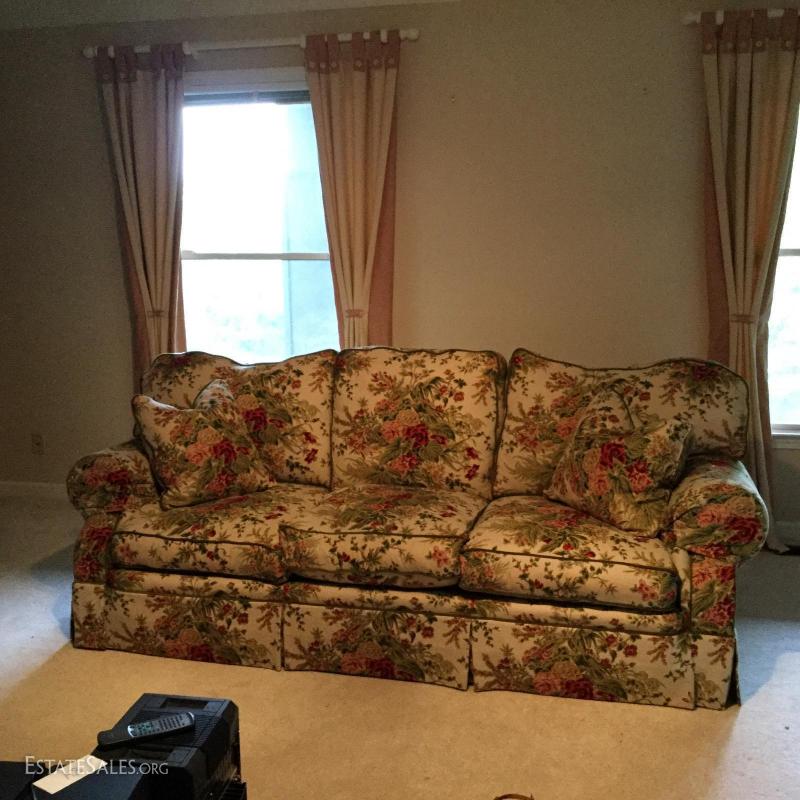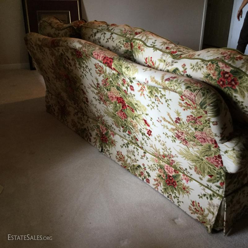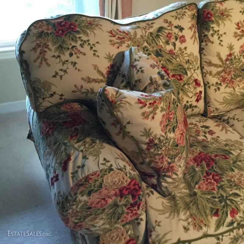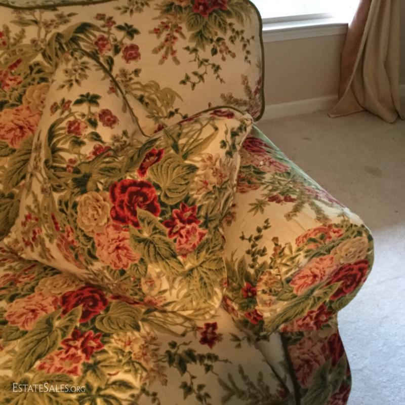 Beautiful floral sofa by Hancock & Moore. Sink into these soft cushions! Includes two matching throw pillows. 87"l x 40"w x 34"h.