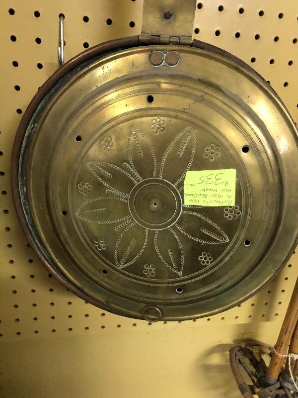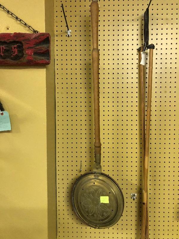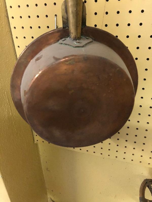 Antique bed warmer copper & brass with long wood handle: Vintage used condition