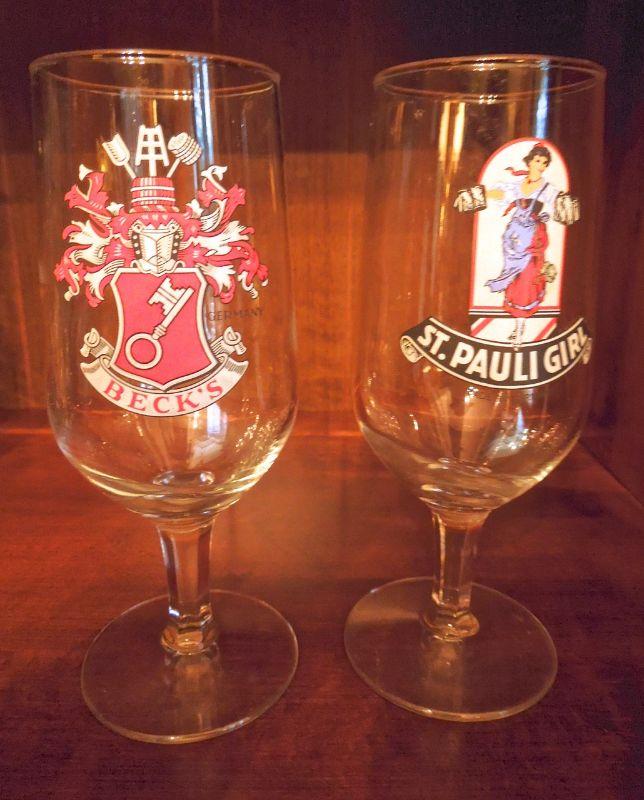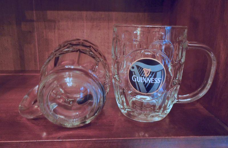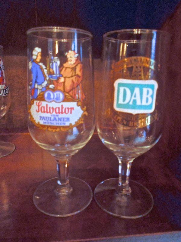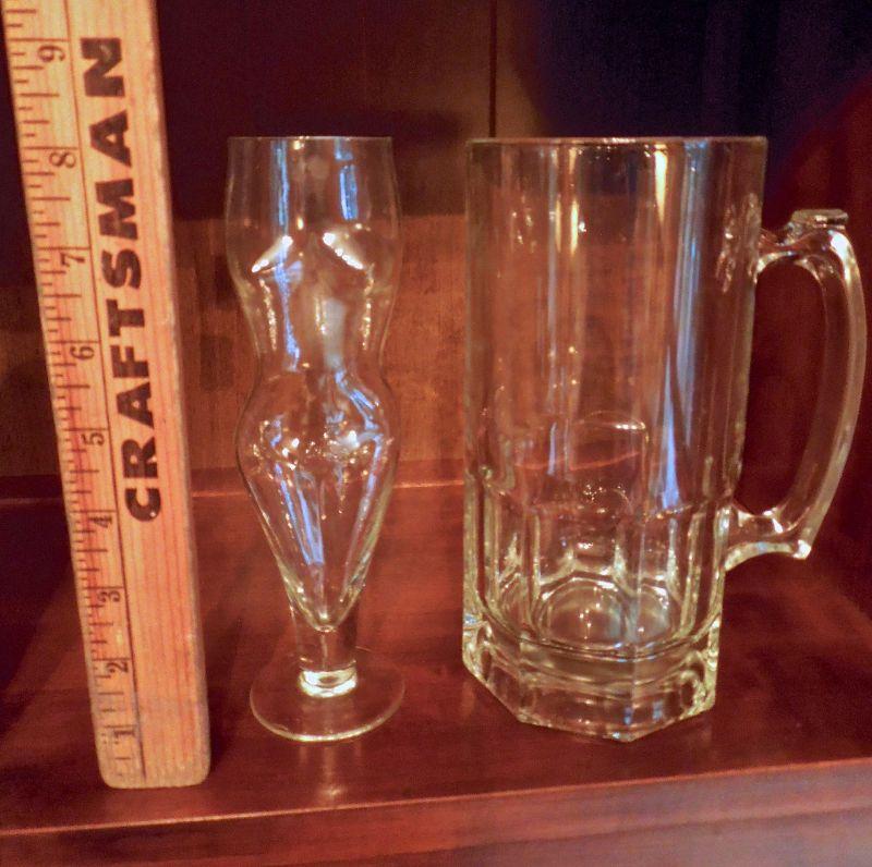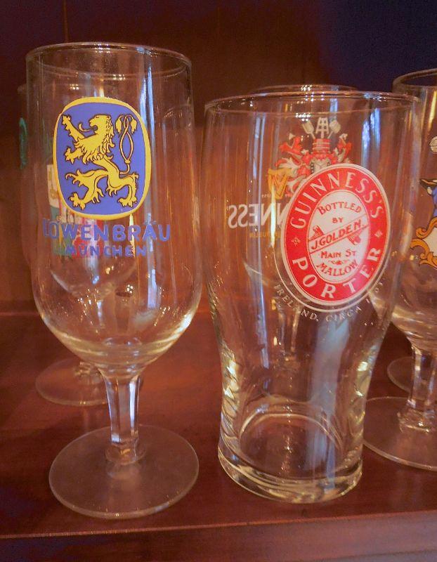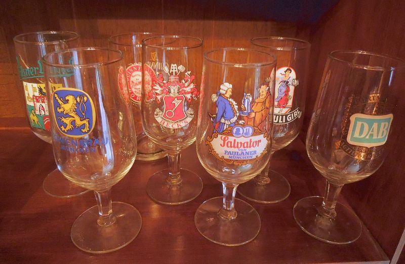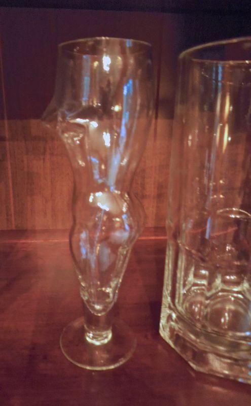 6 European brewers beer 12 oz beer glasses; 2 Guiness beer mugs; a giant clear glass beer stein and a naked lady clear drinking glass. Pilsner Urquel glass broken after photo posted.