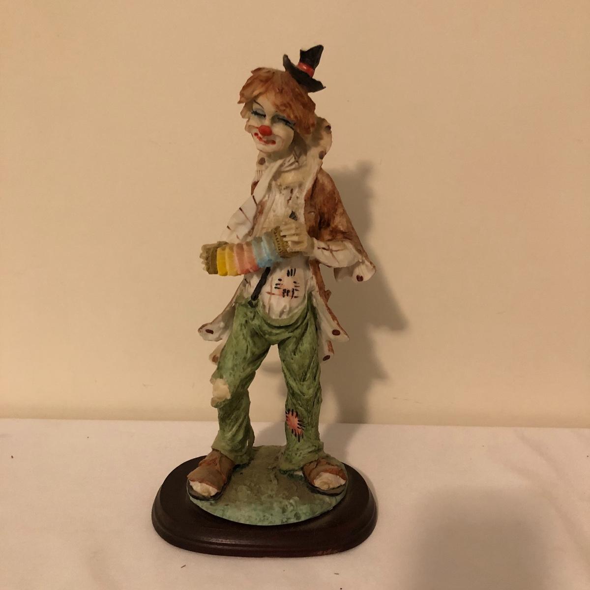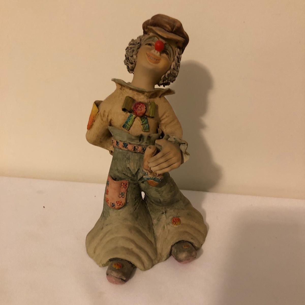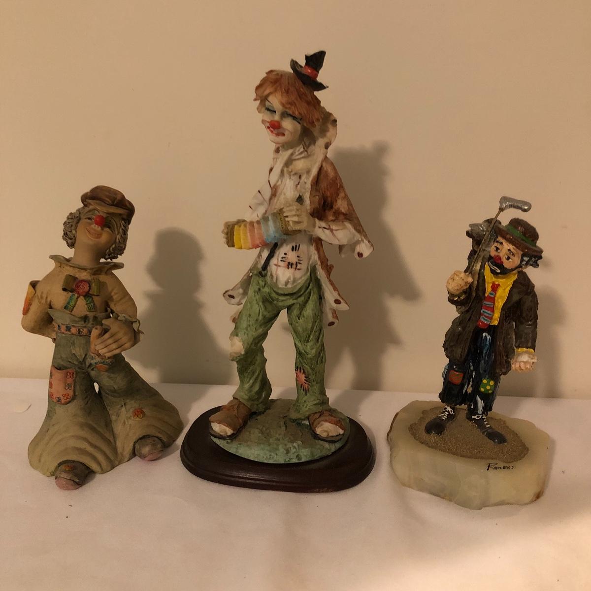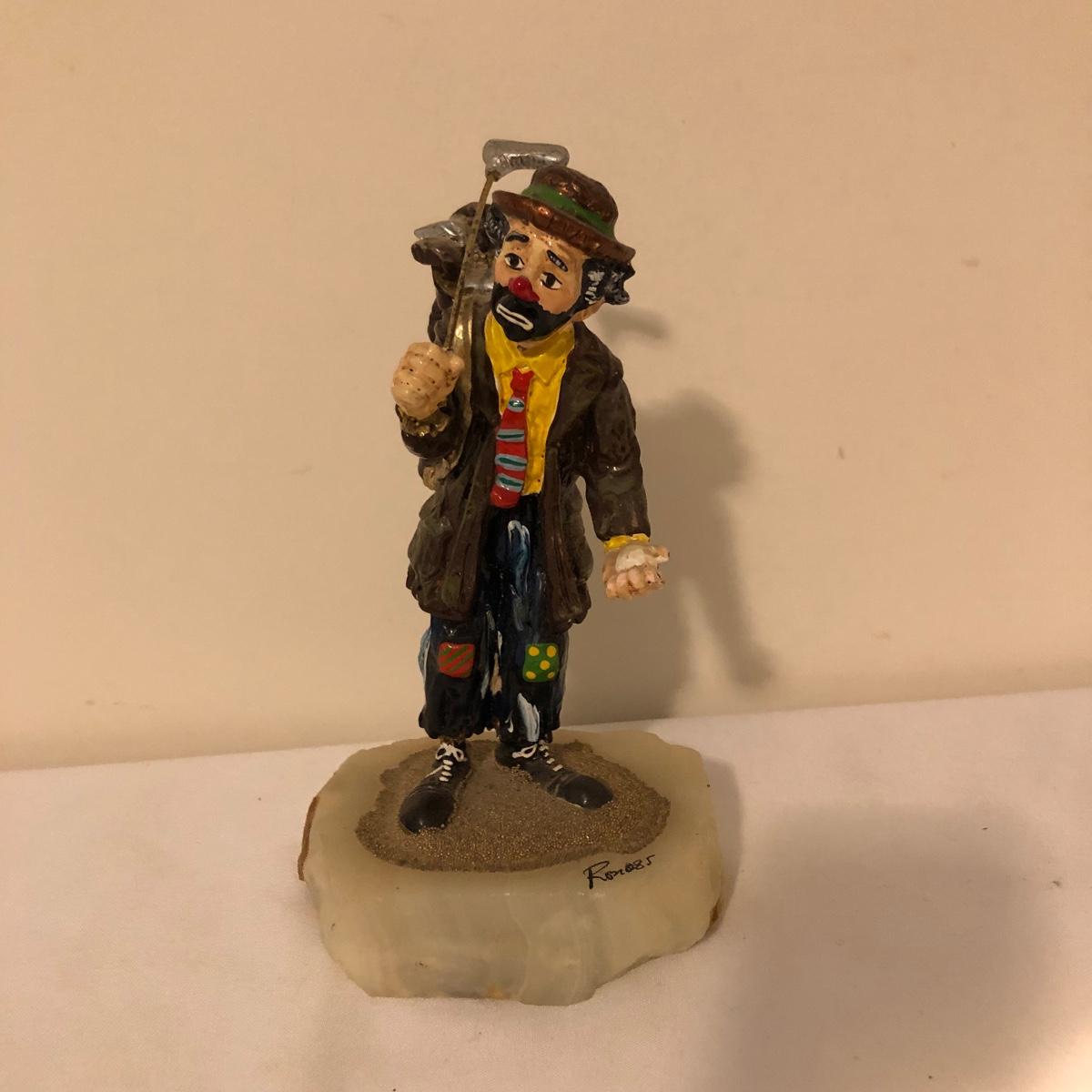 Trio of clown figurines will put a smile on your face. Lot includes Chip off the block signed by Ron with a stone base that appears to be metal covered by epoxy and is very heavy, resin clown by Pucci and a hand made ceramic signed by Guzman. Tallest figurine measures 4” x 6” x 12”.