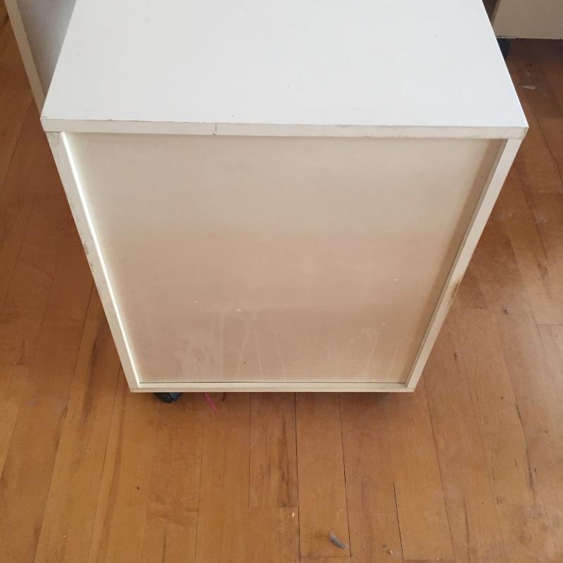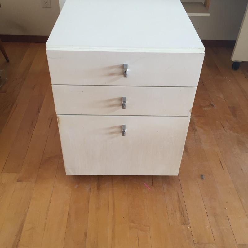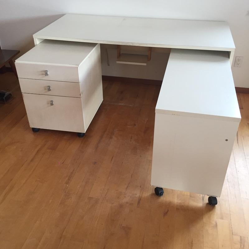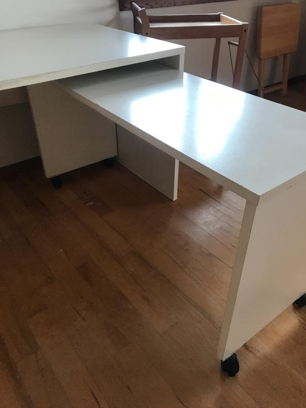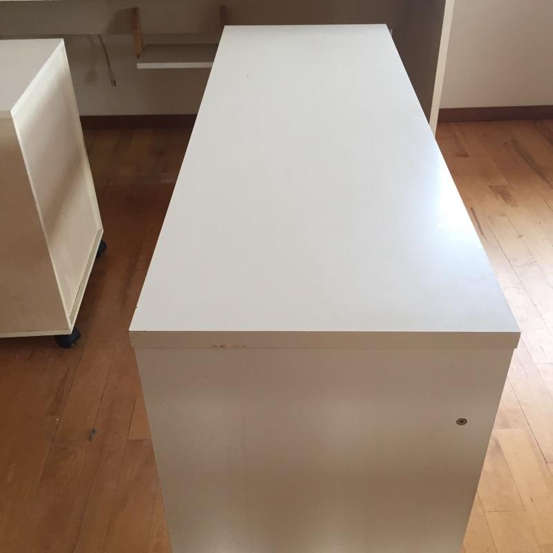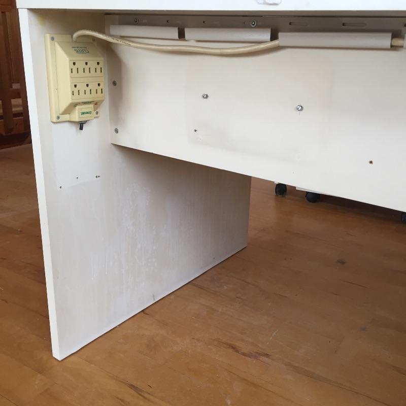 Computer desk with surge protector built on back with rolling three drawer cabinet and workspace. Desk measures 30” x 65” x 29” and 3-drawer cabinet measures 19.5” x 23.5” x 26” and rolling credenza measures 17.5” x 51” x 26”. Top has some stains that may or may not come off when cleaned.