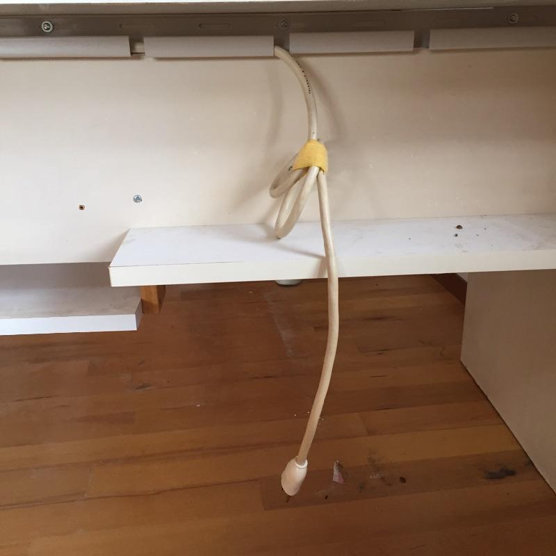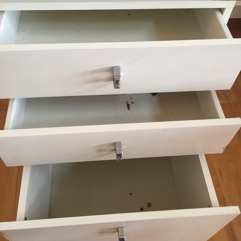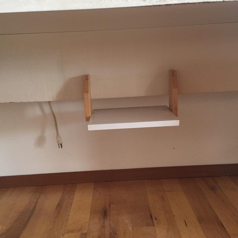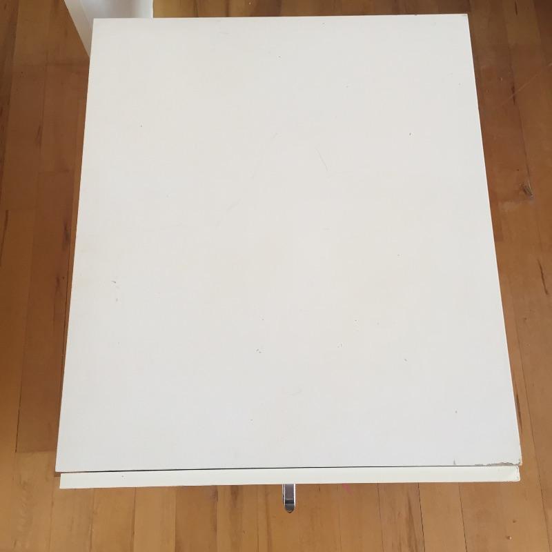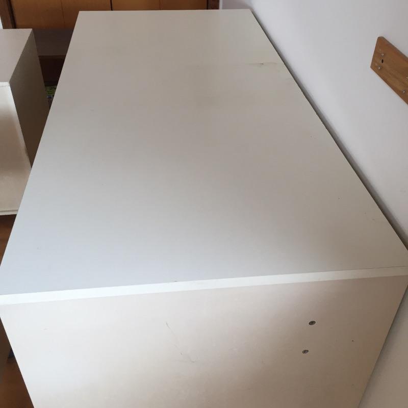 Computer desk with surge protector built on back with rolling three drawer cabinet and workspace. Desk measures 30” x 65” x 29” and 3-drawer cabinet measures 19.5” x 23.5” x 26” and rolling credenza measures 17.5” x 51” x 26”. Top has some stains that may or may not come off when cleaned.