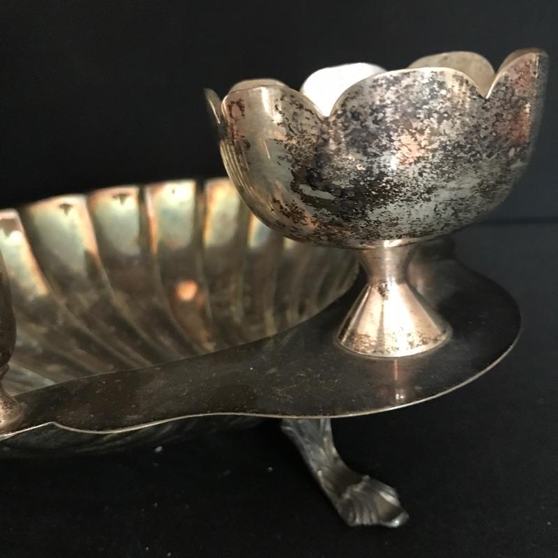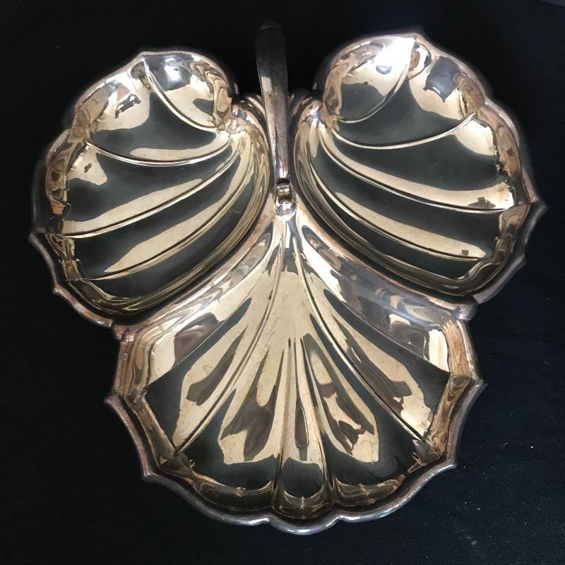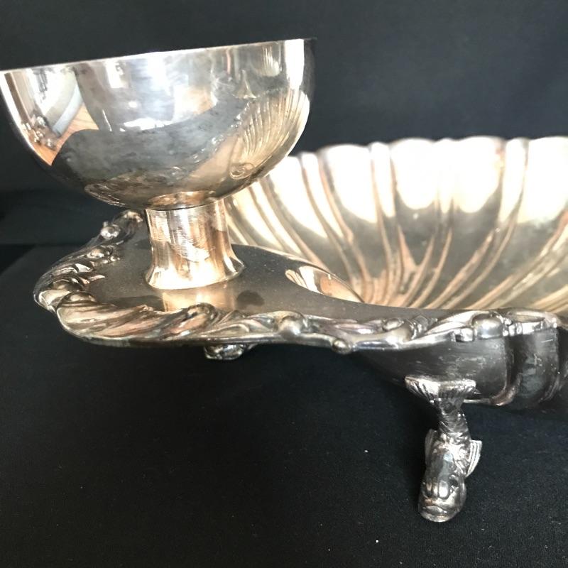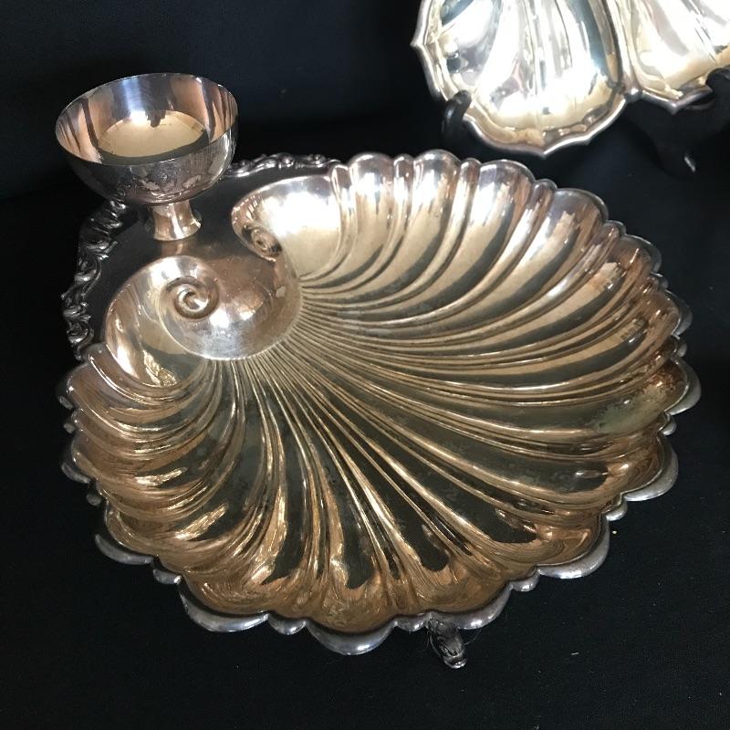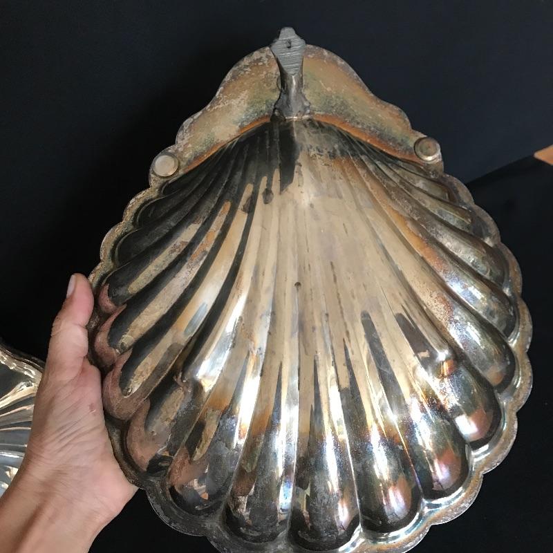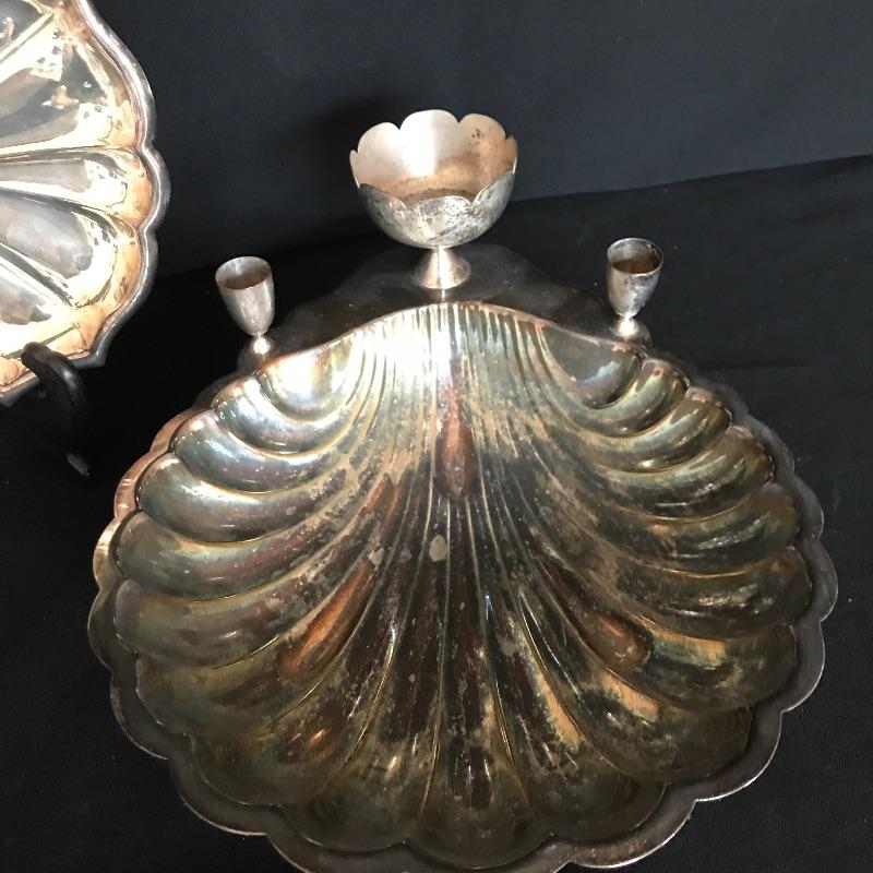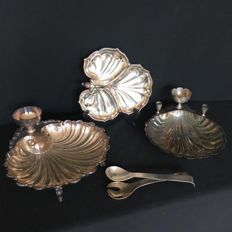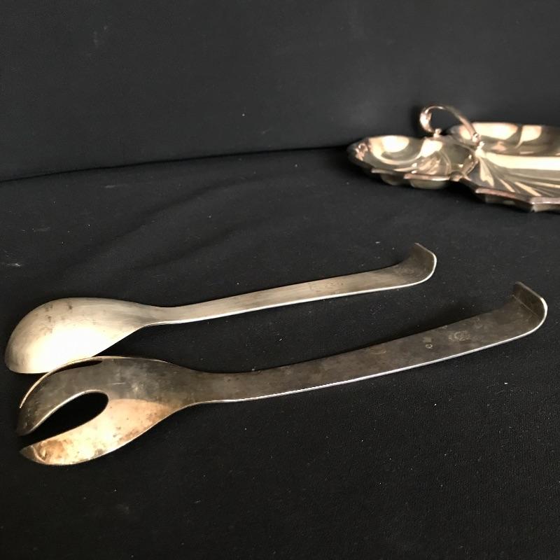 Lot includes two sterling silver salad tongs made in Mexico. Nice hooked handle to stay on bowl. Also includes three scalloped serving dishes in silver plate. One serving tray has small detachable bowl and fish feet and is made by Crescent. The other one’s bowl is not detachable. The Tray is approx. 13” x 12” x 5” h with bowl attached. Tonga are 10” long. See pics. Starting prices based on melt value of forks. Shipping available.