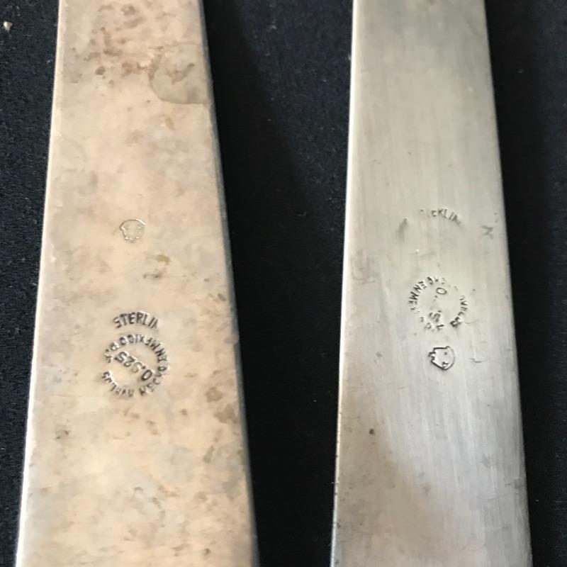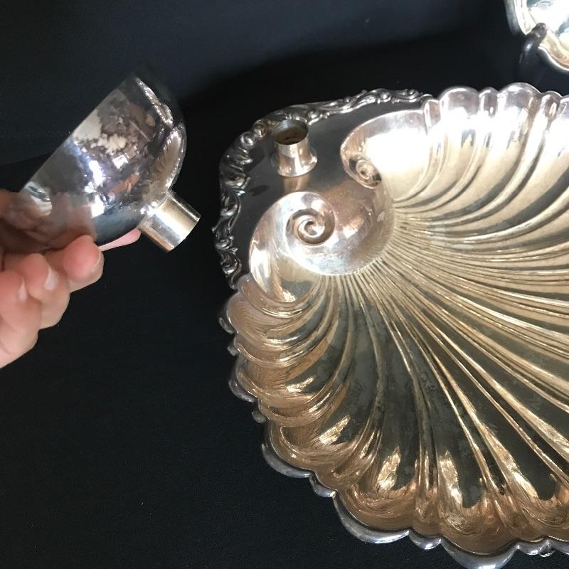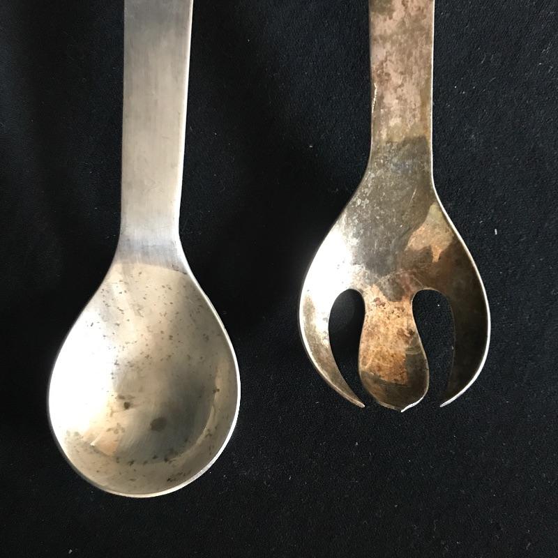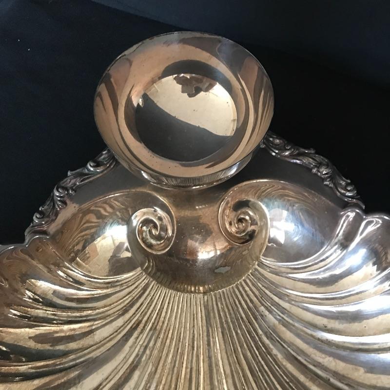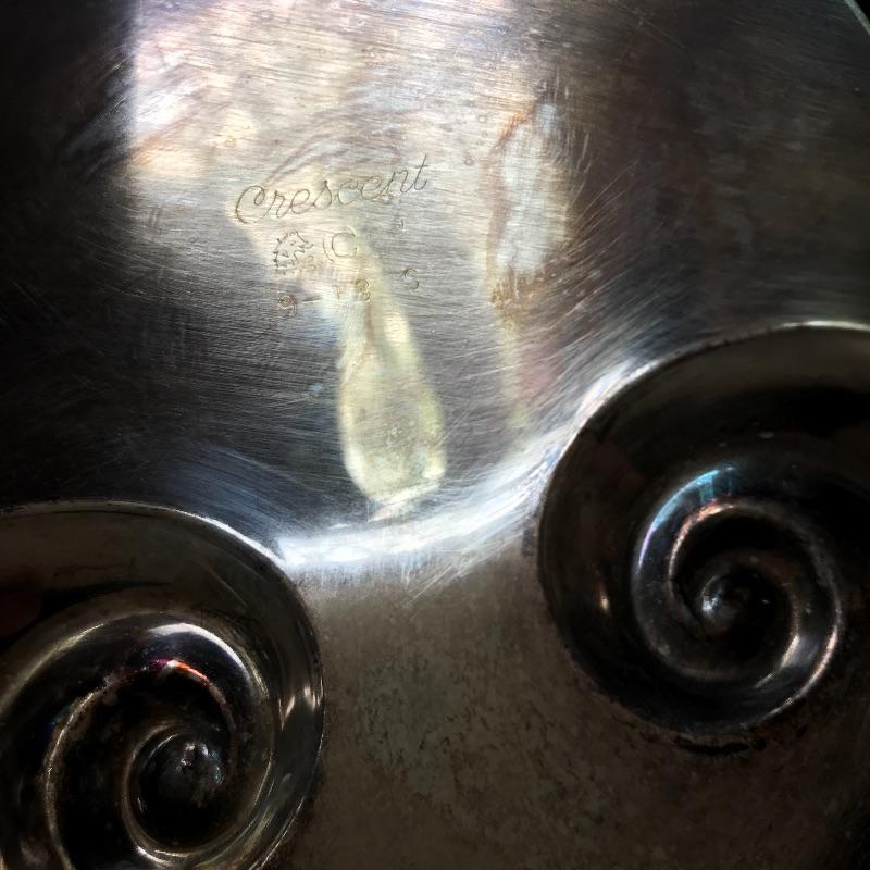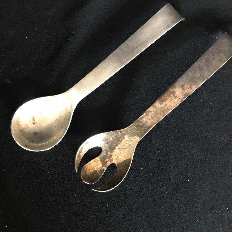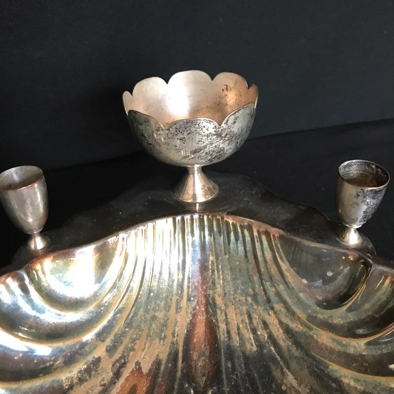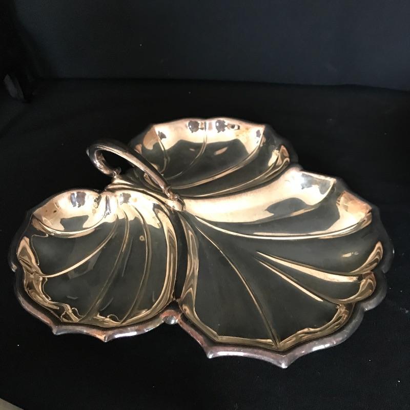 Lot includes two sterling silver salad tongs made in Mexico. Nice hooked handle to stay on bowl. Also includes three scalloped serving dishes in silver plate. One serving tray has small detachable bowl and fish feet and is made by Crescent. The other one’s bowl is not detachable. The Tray is approx. 13” x 12” x 5” h with bowl attached. Tonga are 10” long. See pics. Starting prices based on melt value of forks. Shipping available.