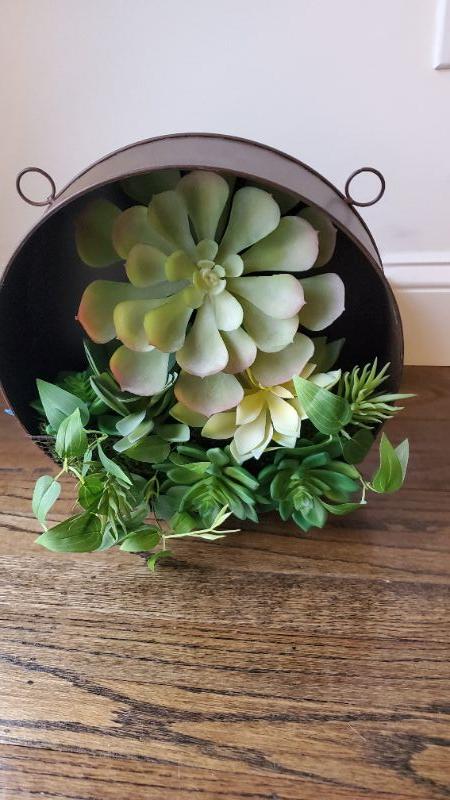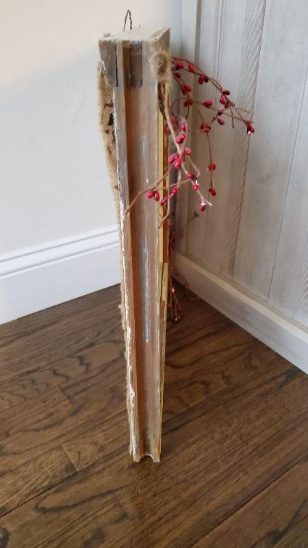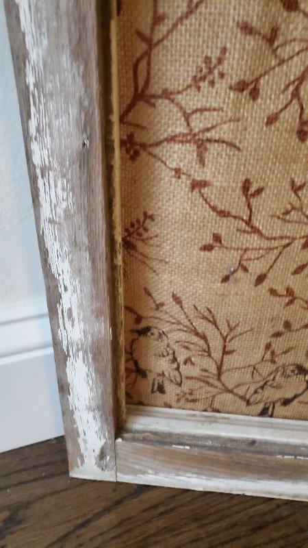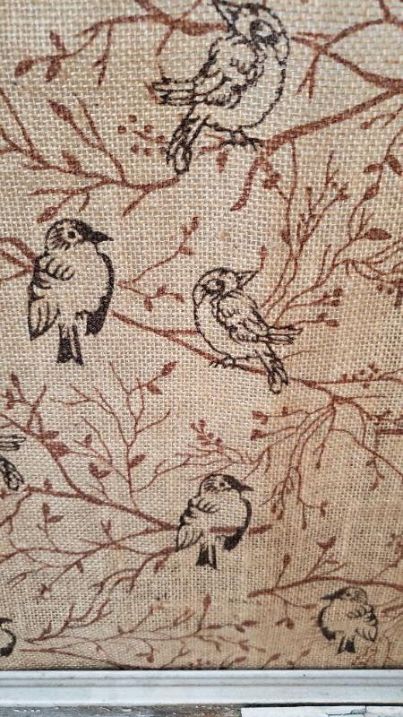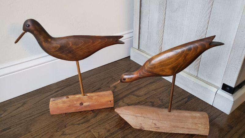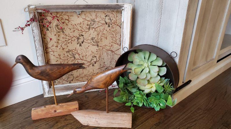 Wooden birds, signed on bottom, faux plant in metal container, and a fabric piece with birds in a vintage window frame.