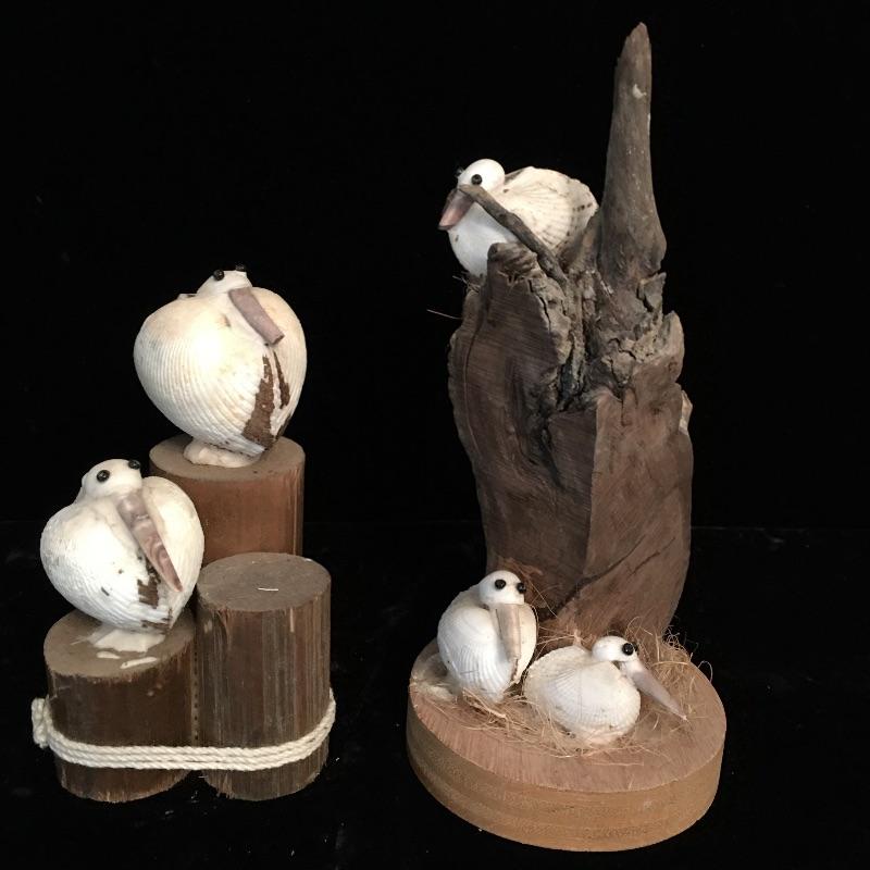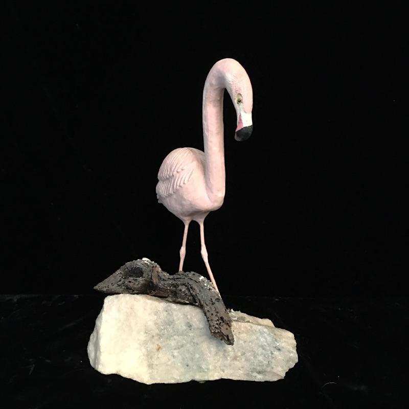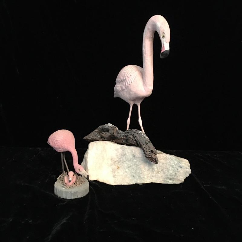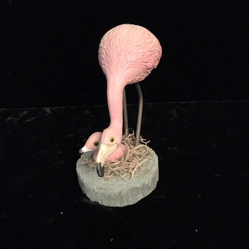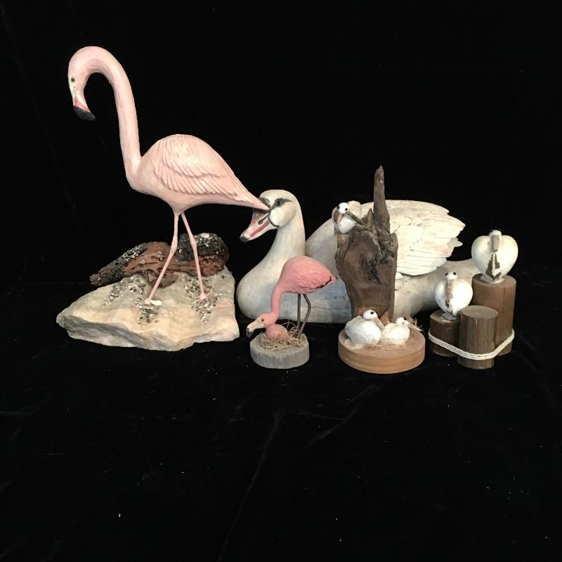 A great collection of decorative birds here that are remarkably lifelike and attractive. Includes flamingo with stone vase, flamingo with wooden base, two pelicans on wooden bases and a duck or possibly a swan that appears to be plaster. Largest flamingo measures 13.5” tall with a base that measures 7” x 10”.