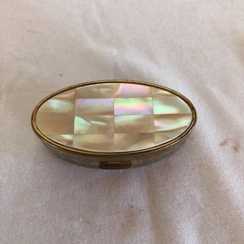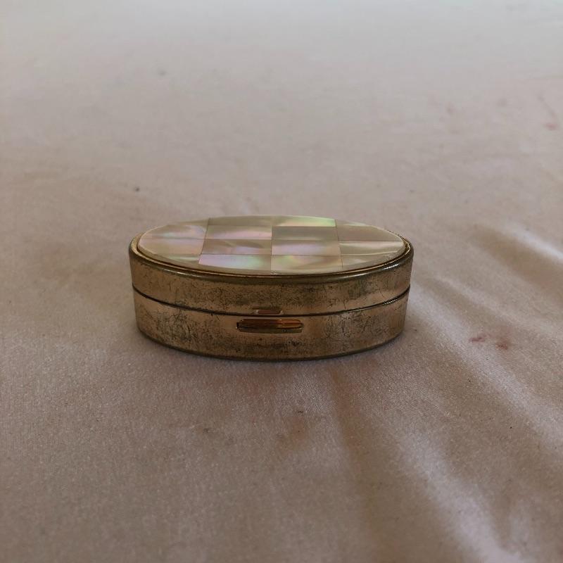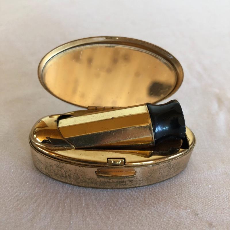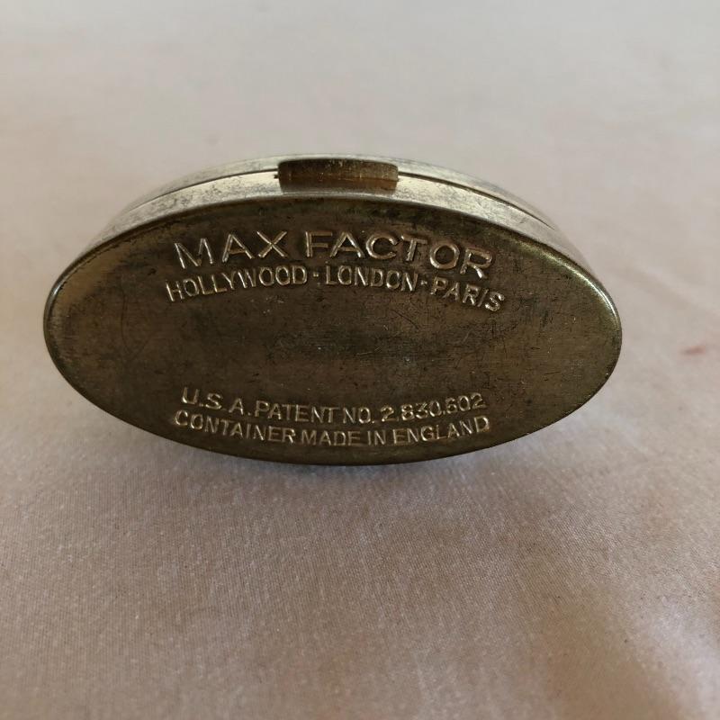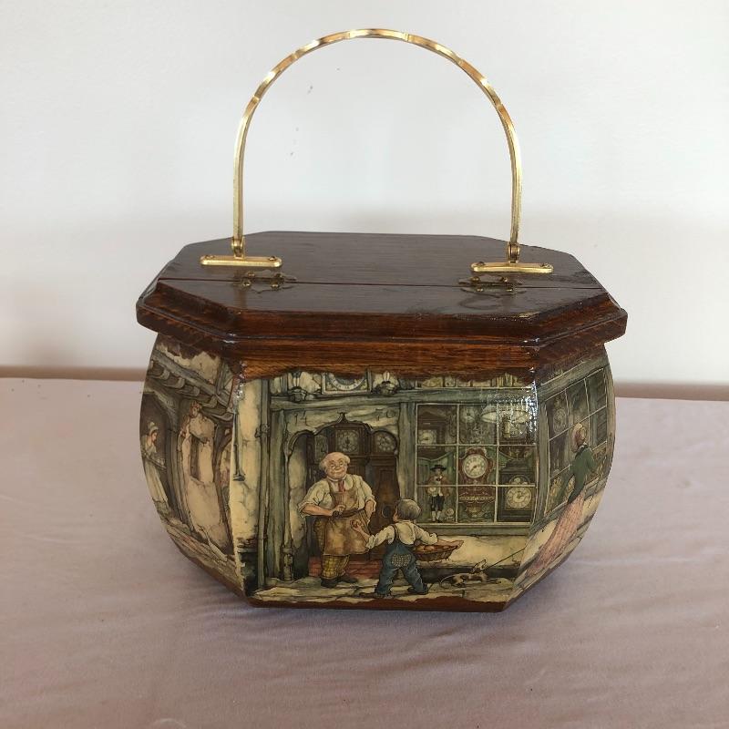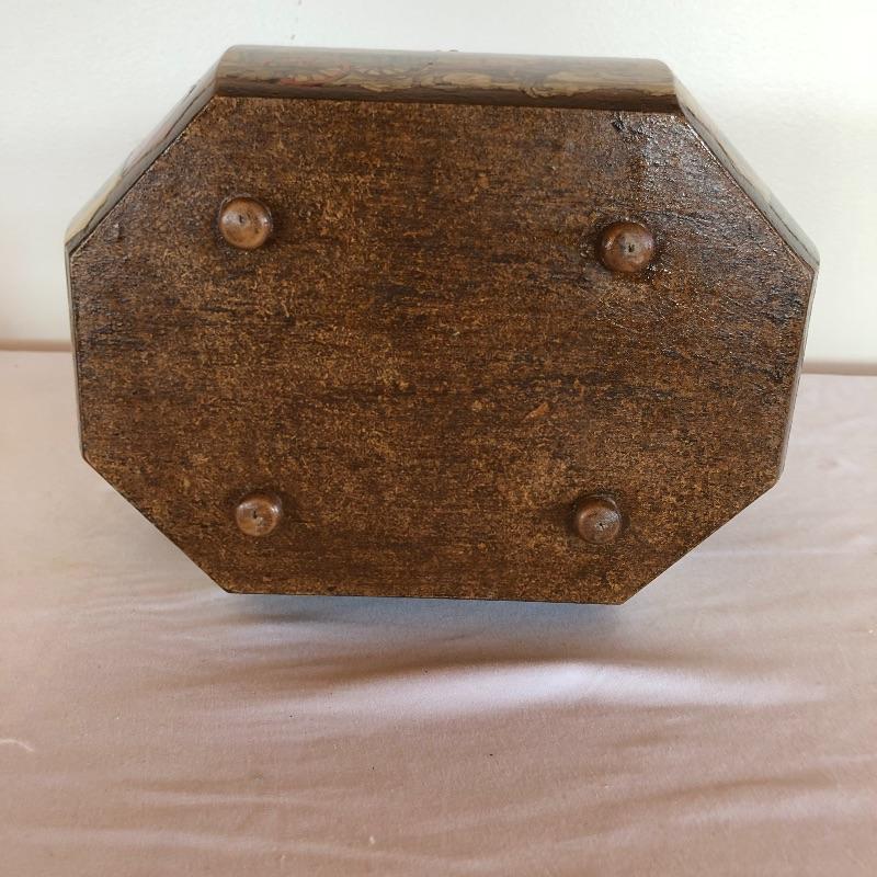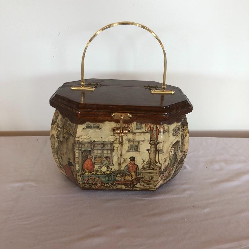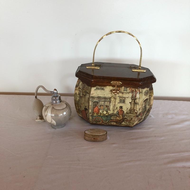 Old school selection includes wooden decoupage purse, signed perfume spray bottle and a vintage Max Factor lipstick holder. Purse measures 6.5” x 8.5” x 6.5” not counting handle.