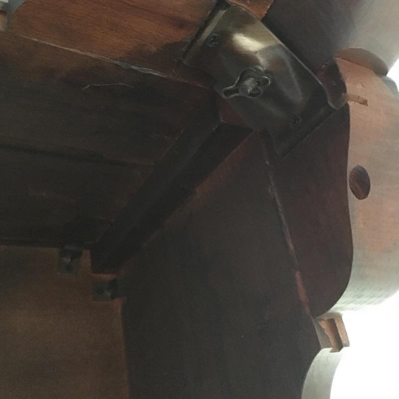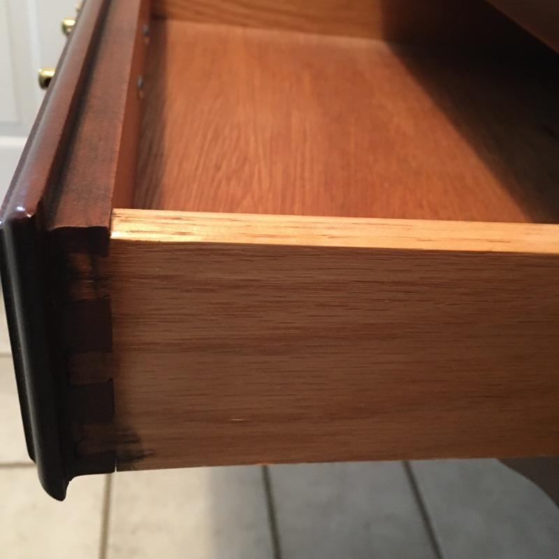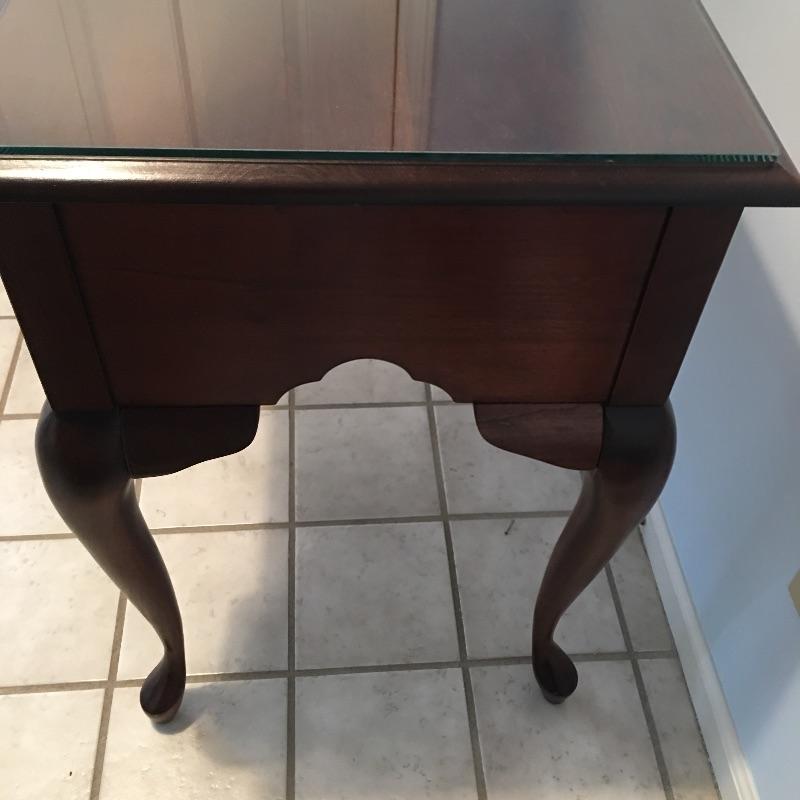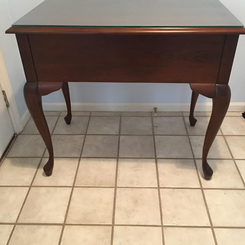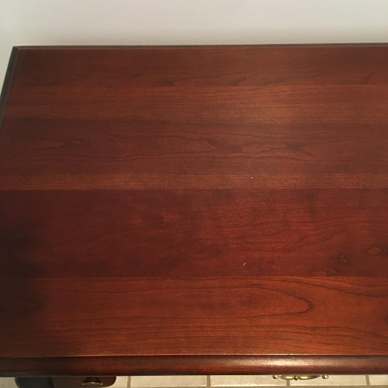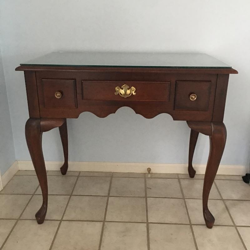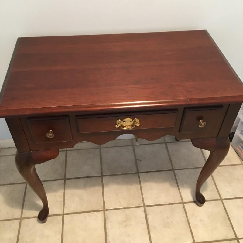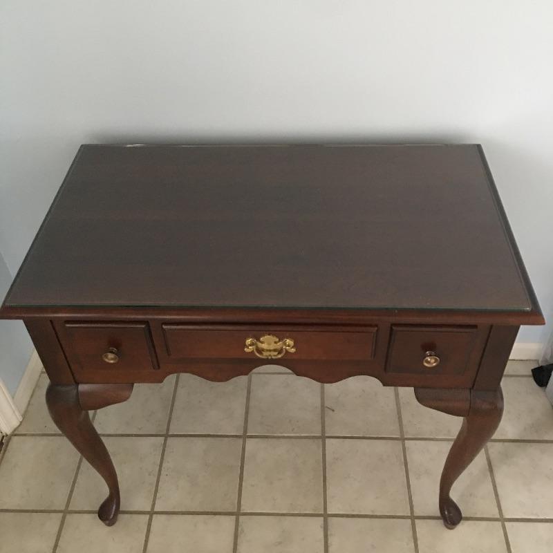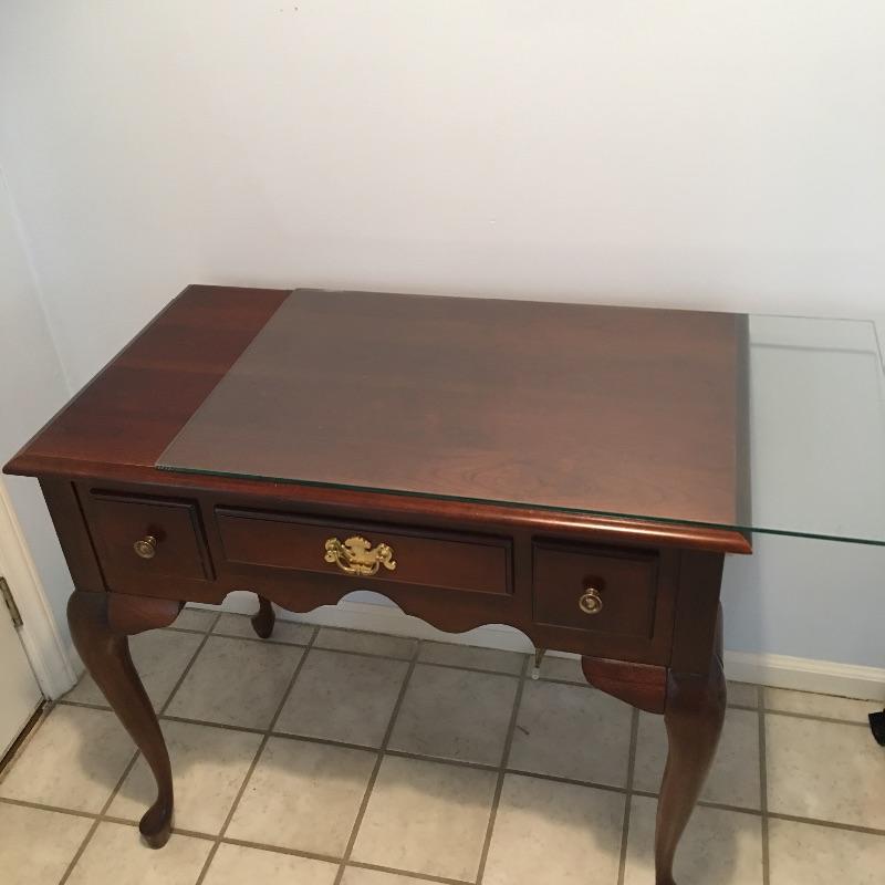 Nicely made wooden desk is a perfect small size to fit in a small corner. Has dovetail drawer and a piece of glass fitted to top to protect. No obvious blemishes. Classic looking desk is great when space is at a premium. Desk measures 20” x 34” x 30”.