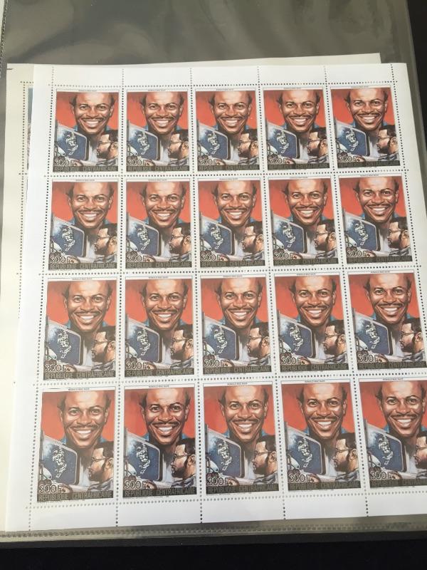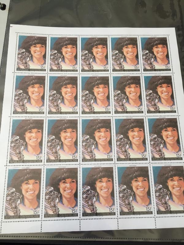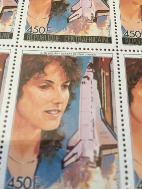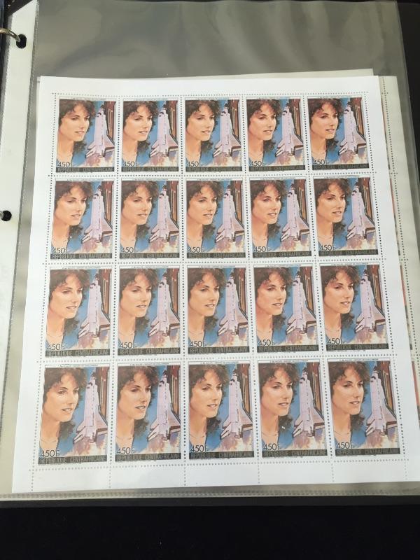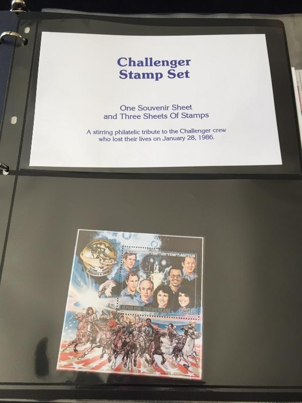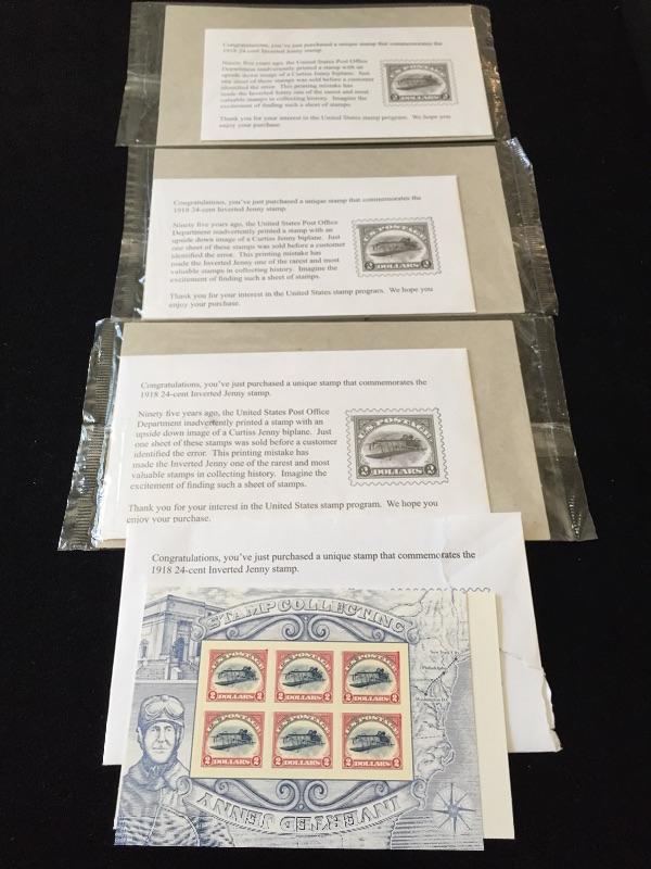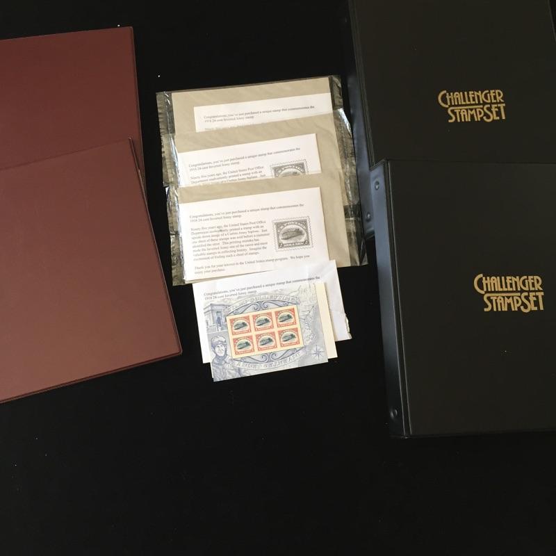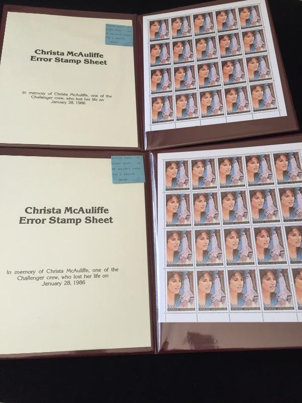 Error stamps including four sets of inverted Jenny Commemorative Stamps, two Christa McAuliffe error sheets and two Challenger stamp sets with errors.