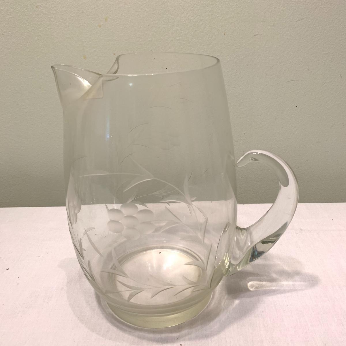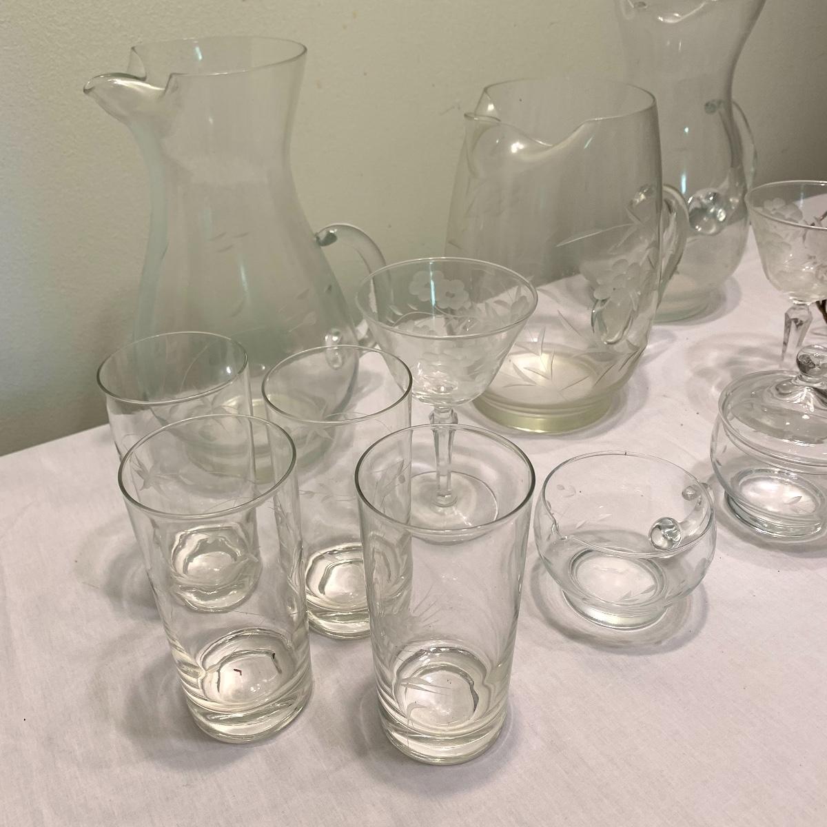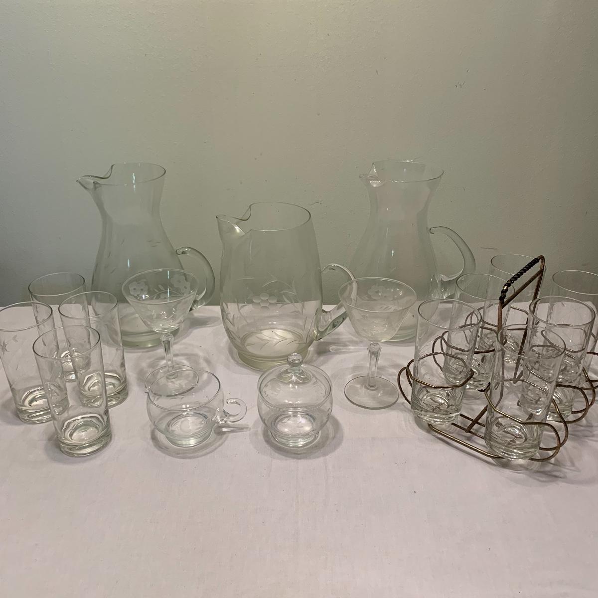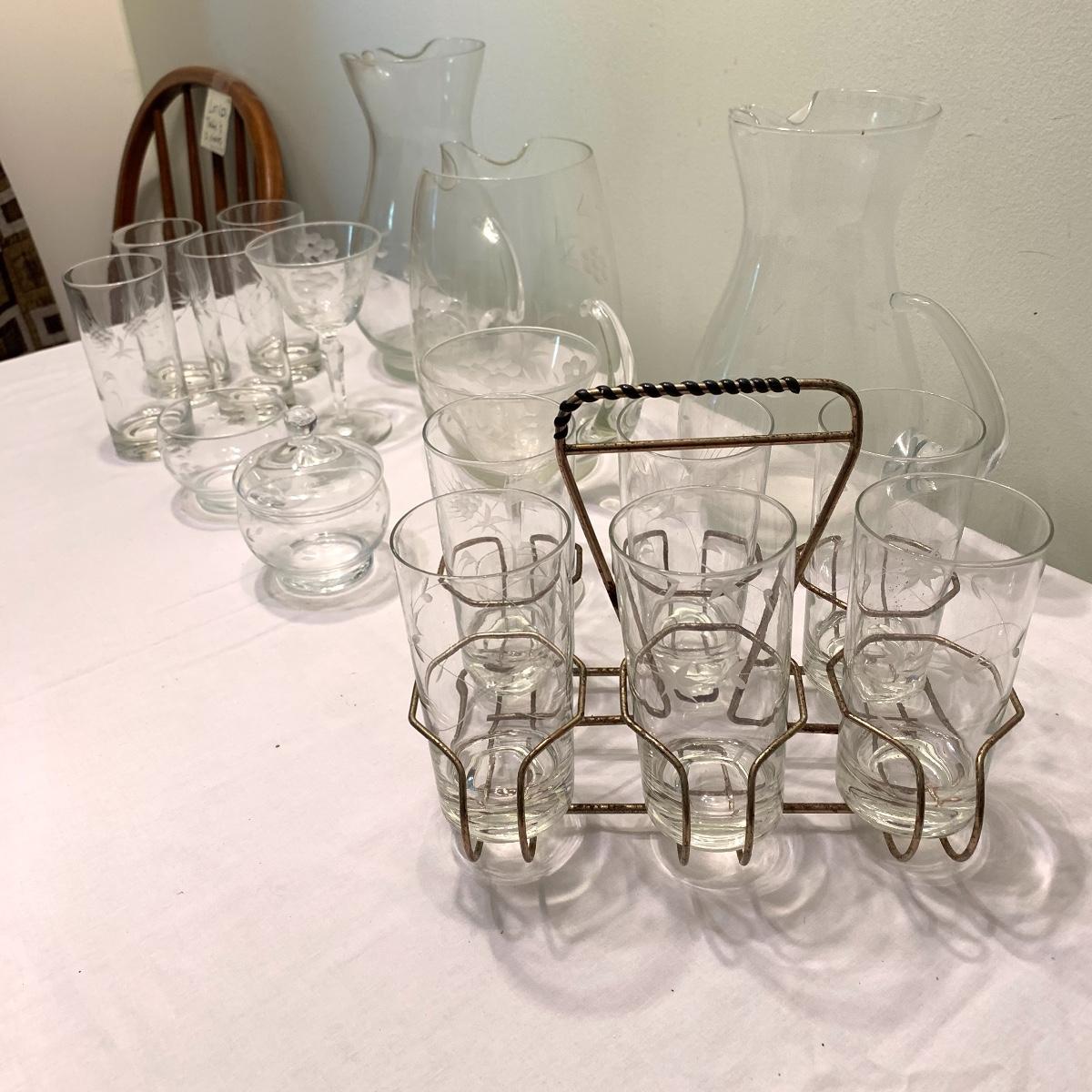 Invite your friends and family over and show off this beautiful glassware. Lot 79 includes a set of ten glasses with a handsome natural motif etched into each glass. This set comes with a six glass carrying caddy. There is also a matching pair of 10” pitchers that also feature an etched nature themed pattern. Also included is another 10” pitcher that boasts a gorgeous etched grape motif. Next are two wine glasses with the same grape motif as the pitcher. Last is a little cream pitcher and a lidded sugar bowl. Local pickup only.