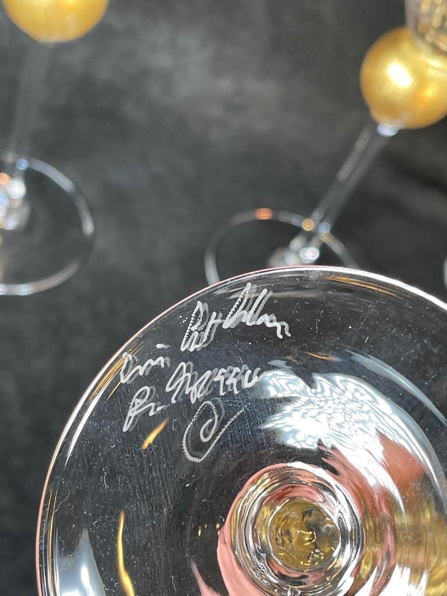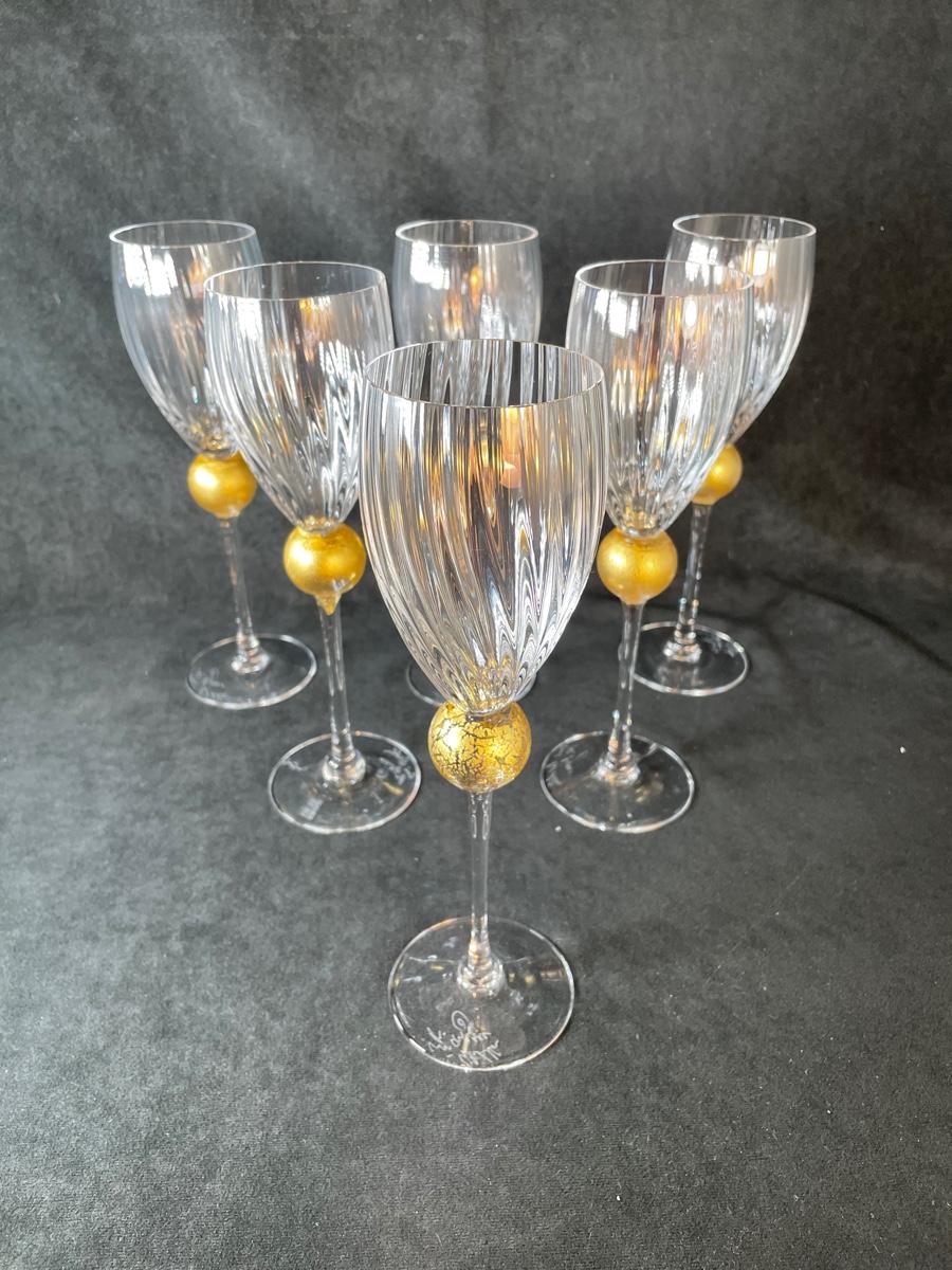 Set of six fluted wine glasses with decorative gold leaf ball on the stem. Reserve is $20