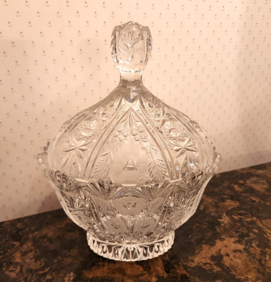 Lead Crystal lidded Candy Jar - probably Shannon Crystal, but no label - 11" tall, 8" across. Good condition. Heavy.